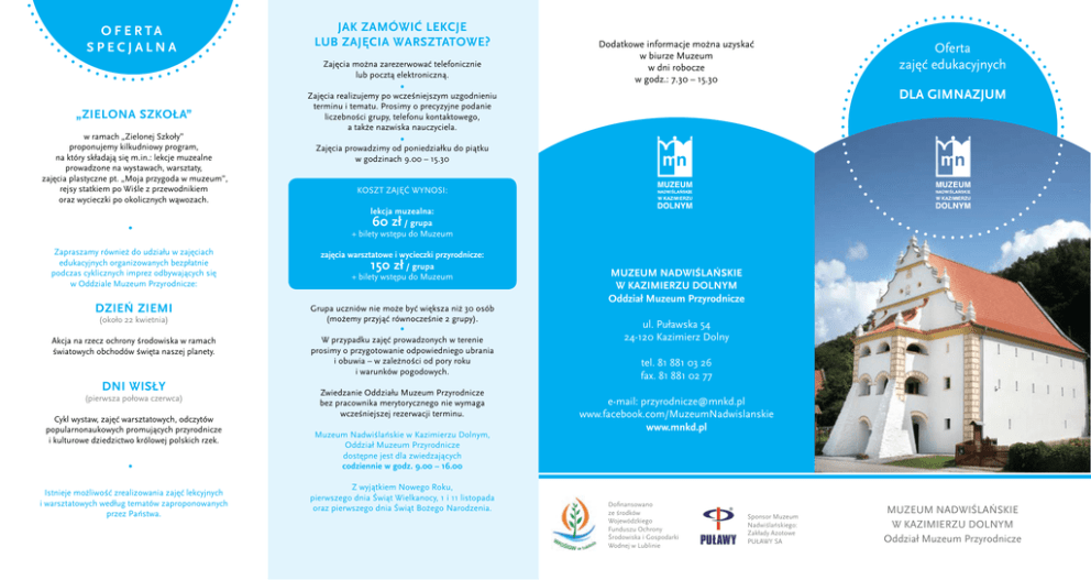O F E R TA S P E C J ALNA JAK ZAMÓWIĆ LEKCJE LUB ZAJĘCIA WARSZTATOWE? Zajęcia można zarezerwować telefonicznie lub pocztą elektroniczną. „Zielona Szkoła” w ramach „Zielonej Szkoły” proponujemy kilkudniowy program, na który składają się m.in.: lekcje muzealne prowadzone na wystawach, warsztaty, zajęcia plastyczne pt. „Moja przygoda w muzeum”, rejsy statkiem po Wiśle z przewodnikiem oraz wycieczki po okolicznych wąwozach. Dodatkowe informacje można uzyskać w biurze Muzeum w dni robocze w godz.: 7.30 – 15.30 Oferta zajęć edukacyjnych dla gimnazjum Zajęcia realizujemy po wcześniejszym uzgodnieniu terminu i tematu. Prosimy o precyzyjne podanie liczebności grupy, telefonu kontaktowego, a także nazwiska nauczyciela. Zajęcia prowadzimy od poniedziałku do piątku w godzinach 9.00 – 15.30 Koszt zajęć wynosi: lekcja muzealna: 60 zł / grupa + bilety wstępu do Muzeum Zapraszamy również do udziału w zajęciach edukacyjnych organizowanych bezpłatnie podczas cyklicznych imprez odbywających się w Oddziale Muzeum Przyrodnicze: zajęcia warsztatowe i wycieczki przyrodnicze: 150 zł / grupa + bilety wstępu do Muzeum Dzień Ziemi Grupa uczniów nie może być większa niż 30 osób (możemy przyjąć równocześnie 2 grupy). (około 22 kwietnia) Akcja na rzecz ochrony środowiska w ramach światowych obchodów święta naszej planety. Dni Wisły (pierwsza połowa czerwca) Cykl wystaw, zajęć warsztatowych, odczytów popularnonaukowych promujących przyrodnicze i kulturowe dziedzictwo królowej polskich rzek. Istnieje możliwość zrealizowania zajęć lekcyjnych i warsztatowych według tematów zaproponowanych przez Państwa. W przypadku zajęć prowadzonych w terenie prosimy o przygotowanie odpowiedniego ubrania i obuwia – w zależności od pory roku i warunków pogodowych. Zwiedzanie Oddziału Muzeum Przyrodnicze bez pracownika merytorycznego nie wymaga wcześniejszej rezerwacji terminu. Muzeum Nadwiślańskie w Kazimierzu Dolnym, Oddział Muzeum Przyrodnicze dostępne jest dla zwiedzających codziennie w godz. 9.00 – 16.00 Z wyjątkiem Nowego Roku, pierwszego dnia Świąt Wielkanocy, 1 i 11 listopada oraz pierwszego dnia Świąt Bożego Narodzenia. Muzeum Nadwiślańskie w Kazimierzu Dolnym Oddział Muzeum Przyrodnicze ul. Puławska 54 24-120 Kazimierz Dolny tel. 81 881 03 26 fax. 81 881 02 77 e-mail: [email protected] www.facebook.com/MuzeumNadwislanskie www.mnkd.pl Dofinansowano ze środków Wojewódzkiego Funduszu Ochrony Środowiska i Gospodarki Wodnej w Lublinie Sponsor Muzeum Nadwiślańskiego: Zakłady Azotowe PUŁAWY SA Muzeum Nadwiślańskie w Kazimierzu Dolnym Oddział Muzeum Przyrodnicze Lekcje muzealne czas trwania ok. 1 godz. Zajęcia warsztatowe czas trwania ok. 2,5 godz. – 4 godz. Ptaki dziuplaki – zajęcia poświęcone zwierzętom zamieszkującym dziuple oraz znaczeniu w przyrodzie starych i obumierających drzew. Uczniowie podczas warsztatów poznają gatunki dzięciołów występujących w naszym kraju, dowiadują się jakie inne zwierzęta zamieszkują dziuple oraz dostrzegają zależności pomiędzy różnymi organizmami. Na zakończenie warsztatów uczestnicy wykonują z gotowych elementów budki lęgowe dla ptaków. Artystyczne inspiracje przyrodą* – warsztaty przybliżające podstawy zdobienia przedmiotów metodą decoupage. Po zapoznaniu się z walorami przyrodniczymi Kazimierskiego Parku Krajobrazowego, uczestnicy zdobią przedmioty wykonane z drewna motywami roślinnymi. Nad Wisłą w Kazimierskim Parku Krajobrazowym – uczniowie zapoznają się z formami ochrony przyrody w Polsce, poznają walory przyrodnicze, krajobrazowe i kulturowe Kazimierskiego Parku Krajobrazowego, rozpoznają elementy budowy doliny rzecznej. W Kazimierskim Parku Krajobrazowym – uczniowie podczas zajęć wykonują różne zadania zdobywając kolejne karty, które tworzą „Księgę osobliwości Kazimierskiego Parku Krajobrazowego”. Warsztaty prowadzone w oparciu o prezentację multimedialną. Prawie wszystko o wąwozach – podczas zajęć uczniowie zapoznają się z budową geologiczną, rzeźbą terenu i procesami erozyjnymi spotykanymi na terenie Kazimierskiego Parku Krajobrazowego. Uczą się rozpoznawać i opisywać właściwości skał: lessu, wapienia i gliny. Poznają etapy powstawania wąwozów naturalnych oraz głębocznic. Jak powstają skamieniałości? – podczas zajęć uczniowie odtwarzają proces powstawania skamieniałości przy pomocy wody, gipsu i współczesnych muszli. Warsztaty urozmaicone są dodatkowymi zajęciami plastycznymi. Tajemnice Wymarłego Świata – zajęcia poświęcone organizmom żyjącym w kredowym morzu 65 mln lat temu. Uczniowie dowiadują się, w jaki sposób powstają skamieniałości, uczą się rozpoznawać poszczególne grupy organizmów. Powstawanie i budowa skał – w oparciu o istniejące ekspozycje uczniowie poznają procesy powstawania skał oraz rodzaje skał. Uczą się odróżniać less, opokę oraz glinę, wykonują proste doświadczenia chemiczne mające na celu wykrycie w skale węglanu wapnia. Nasze drzewa i krzewy – uczniowie poznają różne formy roślinności (drzewiaste, krzewiaste, zielne). Zaznajamiają się z podstawowymi gatunkami drzew i krzewów spotykanymi na terenie Kazimierskiego Parku Krajobrazowego. Charakteryzują wybrane zespoły leśne i szukają wzajemnych zależności między organizmami w przyrodzie. Płynie Wisła, płynie… – zajęcia na temat naszej największej rzeki i bogactwa przyrodniczego Małopolskiego Przełomu Wisły. Uczniowie rozpoznają elementy doliny rzecznej, określają wpływ budowy geologicznej na rzeźbę terenu oraz występującą florę i faunę. Istnieje możliwość przygotowania kart pracy z zadaniami dla uczniów do każdego tematu proponowanych zajęć. Roślinność naszych lasów – uczniowie poznają rośliny występujące w lasach liściastych. Dzięki prezentacji i muzealnym wystawom zaznajamiają się z podstawowymi