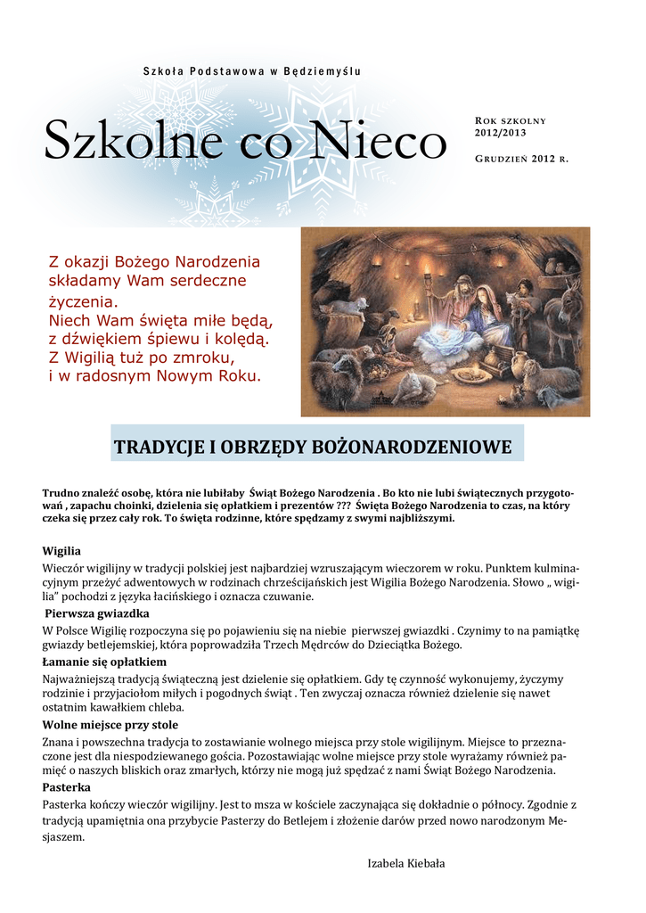 Szkoła Podstawowa w Będziemyślu Szkolne co Nieco R OK SZKOLNY 2012/2013 GRUDZIEŃ 2012 R. Z okazji Bożego Narodzenia składamy Wam serdeczne życzenia. Niech Wam święta miłe będą, z dźwiękiem śpiewu i kolędą. Z Wigilią tuż po zmroku, i w radosnym Nowym Roku. TRADYCJE I OBRZĘDY BOŻONARODZENIOWE Trudno znaleźć osobę, która nie lubiłaby Świąt Bożego Narodzenia . Bo kto nie lubi świątecznych przygotowań , zapachu choinki, dzielenia się opłatkiem i prezentów ??? Święta Bożego Narodzenia to czas, na który czeka się przez cały rok. To święta rodzinne, które spędzamy z swymi najbliższymi. Wigilia Wieczor wigilijny w tradycji polskiej jest najbardziej wzruszającym wieczorem w roku. Punktem kulminacyjnym przezyc adwentowych w rodzinach chrzescijanskich jest Wigilia Bozego Narodzenia. Słowo „ wigilia” pochodzi z języka łacinskiego i oznacza czuwanie. Pierwsza gwiazdka W Polsce Wigilię rozpoczyna się po pojawieniu się na niebie pierwszej gwiazdki . Czynimy to na pamiątkę gwiazdy betlejemskiej, ktora poprowadziła Trzech Mędrcow do Dzieciątka Bozego. Łamanie się opłatkiem Najwazniejszą tradycją swiąteczną jest dzielenie się opłatkiem. Gdy tę czynnosc wykonujemy, zyczymy rodzinie i przyjaciołom miłych i pogodnych swiąt . Ten zwyczaj oznacza rowniez dzielenie się nawet ostatnim kawałkiem chleba. Wolne miejsce przy stole Znana i powszechna tradycja to zostawianie wolnego miejsca przy stole wigilijnym. Miejsce to przeznaczone jest dla niespodziewanego goscia. Pozostawiając wolne miejsce przy stole wyrazamy rowniez pamięc o naszych bliskich oraz zmarłych, ktorzy nie mogą juz spędzac z nami Swiąt Bozego Narodzenia. Pasterka Pasterka konczy wieczor wigilijny. Jest to msza w kosciele zaczynająca się dokładnie o połnocy. Zgodnie z tradycją upamiętnia ona przybycie Pasterzy do Betlejem i złozenie darow przed nowo narodzonym Mesjaszem. Izabela Kiebała W tym roku prezent pod choinkę zrób sam!!! Latające renifery Oto nasze propozycje: -ramka z płyty CD Dla rodzeństwa: -książeczka z historyjką o ulubionym misiu -naszyjnik np. z makaronu -zakładka do książki -biżuteria np. bransoletka z muliny Dla dziadków: -teatrzyk lalkowy z własnym scenariuszem, -butelka ręcznie malowana -świeczka z zatopionym drobiazgiem -serce z gliny z napisem Dla rodziców: -ramka ze swoim zdjęciem -album z własnymi rysunkami -pudełko na drobiazgi -ciasteczka -stroik Dla ukochanej: -woreczek z pachnidełkami (np. ususzone skórki mandarynki) -ozdoba świąteczna z origami Emilia Radzimowska Czy św. Mikołaj istnieje? Biolodzy znają tysiące gatunków ssaków. Liczba ta jest płynna – niektóre gatunki wymierają, inne są dopiero odkrywane. Nie zmienia to faktu, iż latające renifery (których podobno używa Święty Mikołaj podczas swoich podróży) pozostają nauce nieznane. Chociaż, kto wie… Na przykład okapi (krewniak żyrafy) odkryty został w lasach Doliny Konga dopiero w 1901 roku. „ Ho ho ho”, wskoczyć na sanie, wystartować i dolecieć do następnego domu. Komplikacje pojawiają się w blokach i domach wielorodzinnych. Nie ustalono, w jaki sposób Święty Mikołaj radzi sobie z brakiem komina. Z ponaddźwiękową prędkością W wyniku skomplikowanych wyliczeń dowiedziono, iż Święty Mikołaj musiałby mieć sanie, które poruszały by się z prędkością większą 3000 razy od prędkości dźwięku ! NiewyobraPrzesyłka ekspresowa żalne ! To spróbujmy inaczej – w ciągu sekunNa ziemi żyje ponad 2 miliardy dzie- dy musiałby pokonać odległość 50 kilomeci. Zakładając, iż w wigilijny wieczór trów. Dla porównania – najszybszy pojazd nie wszystkie dzieci czekają na Świę- skonstruowany przez człowieka, sonda kotego Mikołaja (np. dzieci buddystów, smiczna Ulisses, osiąga zaledwie 44,1 kilometra na sekundę. Tymczasem typowy renifer muzułmanów, wyznawców hinduirozwija prędkość nie większą niż 30 kilomezmu itp.) to ma zaledwie 31 godzin trów na godzinę. Kto wie, być może te latające (wliczając zysk wynikający ze stref czasowych przy podróży ze wschodu są sporo szybsze… na zachód) aby dostarczyć prezenty Sanie jak tankowiec wszystkim. Załóżmy, że przeciętny prezent waży około Przez komin Święty Mikołaj musi odwiedzić kilkaset milionów domów. Na każdą sekundę podróży przypadają setki oczekujących dzieci, do których musi wpaść przez komin, podłożyć prezent pod choinkę, powiedzieć parę razy Str. 2 kilograma. Aby zmieścić wszystkie prezenty w saniach, te musiałyby mieć ładowność porównywalną z ładownością supertankowca (czyli ponad 300 000 ton !) Aby pociągnąć takie sanie, trzeba naprawdę wiele reniferów. Jest jeszcze jeden problem. Pojazd o masie 300 000 ton poruszający się z prędkością Rok szkolny 2012/2013 50 k/s, niechybnie spaliłby się w ziemskiej atmosferze. Przy szybkościach, które sanie miałyby osiągnąć, powinny wystąpić ogromne turbulencje powietrza oraz tzw. sonic boom, czyli huk towarzyszący przekraczaniu bariery dźwięku. Nikt tego jednak nigdy nie zaobserwował. Dodatkowo Mikołaj podlegałby zabójczemu przeciążeniu. Zakładając, że na co dzień waży on około 125 kg (bo to przecież dość gruby jegomość ) to w wyniku przeciążenia podczas podróży, jego odczuwalna waga wynosiłaby około 2 150 000 kg ! Pamiętajmy jednak o jednej ważnej rzeczy ! Święty Mikołaj jest … święty! Czyli nie podlega normalnym prawom fizycznym. I całkiem możliwe, że może poruszać się bardzo szybko i dostarczyć prezenty wszystkim dzieciakom na świecie. I w to trzeba wierzyć! Aleksandra Moskwa Warto przeczytać... W tym numerze gazetki zachęcamy do sięgnięcia po lektury: HISTORIA SREBRNEGO TALIZMANU- ANMED ZAPPA Czy Całkiem Zwyczajny Chłopiec może zostać bohaterem? Kiedy spełniają się przepowiedzenie i jak działają talizmany? Odpowiedzi na te pytania znajdziecie w fantastycznej opowieśc