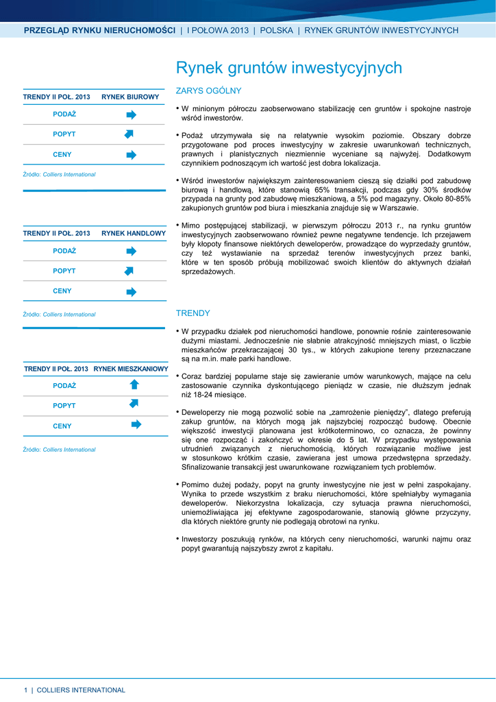 PRZEGLĄD RYNKU NIERUCHOMOŚCI | I POŁOWA 2013 | POLSKA | RYNEK GRUNTÓW INWESTYCYJNYCH Rynek gruntów inwestycyjnych TRENDY II POŁ. 2013 RYNEK BIUROWY ZARYS OGÓLNY • W minionym półroczu zaobserwowano stabilizację cen gruntów i spokojne nastroje PODAŻ wśród inwestorów. • Podaż utrzymywała się na relatywnie wysokim poziomie. Obszary dobrze POPYT przygotowane pod proces inwestycyjny w zakresie uwarunkowań technicznych, prawnych i planistycznych niezmiennie wyceniane są najwyżej. Dodatkowym czynnikiem podnoszącym ich wartość jest dobra lokalizacja. CENY Źródło: Colliers International • Wśród inwestorów największym zainteresowaniem cieszą się działki pod zabudowę biurową i handlową, które stanowią 65% transakcji, podczas gdy 30% środków przypada na grunty pod zabudowę mieszkaniową, a 5% pod magazyny. Około 80-85% zakupionych gruntów pod biura i mieszkania znajduje się w Warszawie. TRENDY II POŁ. 2013 • Mimo postępującej stabilizacji, w pierwszym półroczu 2013 r., na rynku gruntów RYNEK HANDLOWY PODAŻ POPYT inwestycyjnych zaobserwowano również pewne negatywne tendencje. Ich przejawem były kłopoty finansowe niektórych deweloperów, prowadzące do wyprzedaży gruntów, czy też wystawianie na sprzedaż terenów inwestycyjnych przez banki, które w ten sposób próbują mobilizować swoich klientów do aktywnych działań sprzedażowych. CENY Źródło: Colliers International TRENDY • W przypadku działek pod nieruchomości handlowe, ponownie rośnie zainteresowanie dużymi miastami. Jednocześnie nie słabnie atrakcyjność mniejszych miast, o liczbie mieszkańców przekraczającej 30 tys., w których zakupione tereny przeznaczane są na m.in. małe parki handlowe. TRENDY II POŁ. 2013 RYNEK MIESZKANIOWY • Coraz bardziej popularne staje się zawieranie umów warunkowych, mające na celu PODAŻ zastosowanie czynnika dyskontującego pieniądz w czasie, nie dłuższym jednak niż 18-24 miesiące. POPYT • Deweloperzy nie mogą pozwolić sobie na „zamrożenie pieniędzy”, dlatego preferują CENY Źródło: Colliers International zakup gruntów, na których mogą jak najszybciej rozpocząć budowę. Obecnie większość inwestycji planowana jest krótkoterminowo, co oznacza, że powinny się one rozpocząć i zakończyć w okresie do 5 lat. W przypadku występowania utrudnień związanych z nieruchomością, których rozwiązanie możliwe jest w stosunkowo krótkim czasie, zawierana jest umowa przedwstępna sprzedaży. Sfinalizowanie transakcji jest uwarunkowane rozwiązaniem tych problemów. • Pomimo dużej podaży, popyt na grunty inwestycyjne nie jest w pełni zaspokajany. Wynika to przede wszystkim z braku nieruchomości, które spełniałyby wymagania deweloperów. Niekorzystna lokalizacja, czy sytuacja prawna nieruchomości, uniemożliwiająca jej efektywne zagospodarowanie, stanowią główne przyczyny, dla których niektóre grunty nie podlegają obrotowi na rynku. • Inwestorzy poszukują rynków, na których ceny nieruchomości, warunki najmu oraz popyt gwarantują najszybszy zwrot z kapitału. 1 | COLLIERS INTERNATIONAL PRZEGLĄD RYNKU NIERUCHOMOŚCI | I POŁOWA 2013 | POLSKA | RYNEK GRUNTÓW INWESTYCYJNYCH CENY I TRANSAKCJE WYBRANE TRANSAKCJE SPRZEDAŻY W I POŁOWIE 2013 • Od początku 2013 r. wartość transakcji na rynku gruntów inwestycyjnych MIASTO POW. (ha) CENA (mln PLN) Poufne Warszawa 2,2 25 Poufne Warszawa 1,9 21 INWESTOR Źródło: Colliers International przeznaczonych pod zabudowę biurową, handlową, mieszkaniową i przemysłową (uwzględniając przejęcia spółek posiadających takie aktywa), wyniosła około 300 mln PLN. Stanowi to 20% wyniku z całego 2012 r., który zamknął się z wydatkami na poziomie 1,5 mld PLN. • Statystycznie cena gruntu potrzebnego do wybudowania 1 m² powierzchni użytkowomieszkaniowej była w pierwszym półroczu 2013 r. niższa niż w roku ubiegłym, o przykładowo 7% w Katowicach, czy 3% w Warszawie (poza obszarem centrum). • Największy spadek cen gruntów pod biurowce odnotowano w Katowicach (12%), we Wrocławiu (10%) i w Trójmieście (8%), natomiast najmniejszy w Warszawie, gdzie ceny działek pod zabudowę biurową spadły o 2-3% i pozostały na zbliżonym poziomie do lokalizacji mieszkaniowych. CENY ZA BIUROWY GRUNT INWESTYCYJNY (EUR/m² GLA) MIASTO/REGION MIN MAX ŚREDNIA • Ceny gruntów pod zabudowę handlową unormowały się i wydaje się, że w najbliższych miesiącach pozostaną na stabilnym poziomie, zarówno dla terenów pod tradycyjne centra handlowe, jak i parki handlowe. Warszawa: Centrum 400 800 600 Kraków 150 400 275 Łódź 150 320 235 • W 2013 r. wzrośnie aktywność podmiotów na rynku gruntów inwestycyjnych. Powinna Poznań 140 280 210 Górny Śląsk 75 160 117,5 ona przewyższyć liczbę transakcji z roku 2012, co jak do tej pory znajduje potwierdzenie w realizowanych transakcjach i zawieranych umowach warunkowych. Trójmiasto 100 300 200 Wrocław 120 350 235 Źródło: Colliers International CENY ZA MIESZKANIOWY GRUNT INWESTYCYJNY (EUR/m² PUM) MIN MAX ŚREDNIA 300 900 600 140 380 260 Kraków 120 300 210 Łódź 70 180 125 Poznań 80 280 180 Górny Śląsk 60 200 130 Trójmiasto 100 300 200 Wrocław 130 300 215 MIASTO/REGION Warszawa: Centrum Warszawa: Poza Centrum PROGNOZY • Dwa ostatnie kwartały 2013 r. będą charakteryzowały się wysoką dynamiką zakupów na rynkach gruntów pod nieruchomości biurowe i handlowe, natomiast mniejsza aktywność będzie widoczna w sektorze mieszkaniowym. Największym zainteresowaniem cieszyć się będą miasta takie jak Warszawa, Wrocław czy Kraków, a w drugiej kolejności Gdańsk i Poznań. • Można spodziewać się, że nowe transakcje sprzedaży terenów pod zabudowę mieszkaniową zostaną odnotowane głównie w Warszawie i we Wrocławiu. W przypadku pozostałych rynków lokalnych, takich jak Trójmiasto, Poznań, Kraków czy Szczecin, ewentualne transakcje sprzedaży mieszkaniow