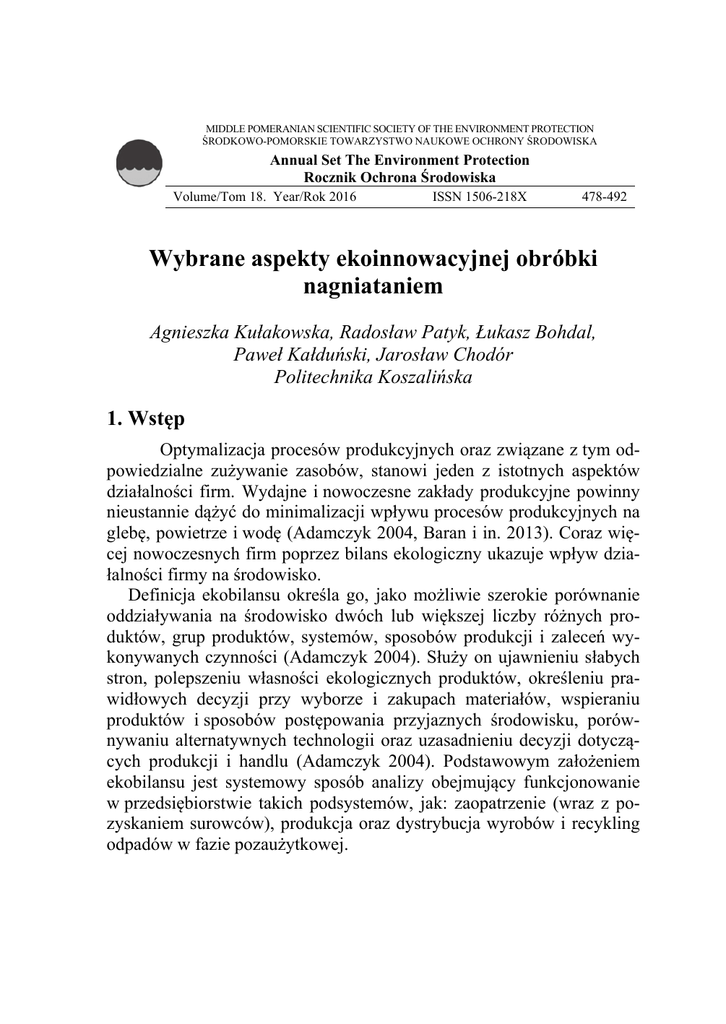 MIDDLE POMERANIAN SCIENTIFIC SOCIETY OF THE ENVIRONMENT PROTECTION ŚRODKOWO-POMORSKIE TOWARZYSTWO NAUKOWE OCHRONY ŚRODOWISKA Annual Set The Environment Protection Rocznik Ochrona Środowiska Volume/Tom 18. Year/Rok 2016 ISSN 1506-218X 478-492 Wybrane aspekty ekoinnowacyjnej obróbki nagniataniem Agnieszka Kułakowska, Radosław Patyk, Łukasz Bohdal, Paweł Kałduński, Jarosław Chodór Politechnika Koszalińska 1. Wstęp Optymalizacja procesów produkcyjnych oraz związane z tym odpowiedzialne zużywanie zasobów, stanowi jeden z istotnych aspektów działalności firm. Wydajne i nowoczesne zakłady produkcyjne powinny nieustannie dążyć do minimalizacji wpływu procesów produkcyjnych na glebę, powietrze i wodę (Adamczyk 2004, Baran i in. 2013). Coraz więcej nowoczesnych firm poprzez bilans ekologiczny ukazuje wpływ działalności firmy na środowisko. Definicja ekobilansu określa go, jako możliwie szerokie porównanie oddziaływania na środowisko dwóch lub większej liczby różnych produktów, grup produktów, systemów, sposobów produkcji i zaleceń wykonywanych czynności (Adamczyk 2004). Służy on ujawnieniu słabych stron, polepszeniu własności ekologicznych produktów, określeniu prawidłowych decyzji przy wyborze i zakupach materiałów, wspieraniu produktów i sposobów postępowania przyjaznych środowisku, porównywaniu alternatywnych technologii oraz uzasadnieniu decyzji dotyczących produkcji i handlu (Adamczyk 2004). Podstawowym założeniem ekobilansu jest systemowy sposób analizy obejmujący funkcjonowanie w przedsiębiorstwie takich podsystemów, jak: zaopatrzenie (wraz z pozyskaniem surowców), produkcja oraz dystrybucja wyrobów i recykling odpadów w fazie pozaużytkowej. Wybrane aspekty ekoinnowacyjnej obróbki nagniataniem 479 Ekoinnowacyjna obróbka nagniataniem przyczynia się do stworzenia nowych rozwiązań dostarczających wartości dodanej konsumentom i przedsiębiorcom istotnie zmniejszając oddziaływanie na środowisko. W procesie nagniatania (Kukielka 2001, Kukielka i in. 2003, Kukielka i in. 2005, Kukielka i in. 2010, Kukielka 2012, Kukiełka K. i in. 2013, Kukielka i in. 2016, Kulakowska 2012, Kulakowska i in. 2014, Kulakowska i in. 2016, Kulakowska & Patyk i in. 2014, Kukielka & Kukielka i in. 2014, Kukielka K. i in. 2014,), który jest obróbką plastyczną, nie wytwarza się wiórów i iskier, jak w przypadku stosowania obróbki wiórowej i ściernej. Jest również obróbką bezpyłową (Przybylski 1987). Podstawowe zalety, które są charakterystyczne dla technologii nagniataniem, a których znajomość może ułatwić analizę jakościową podczas projektowania procesów technologicznych, mające także pozytywny wpływ na środowisko, zamieszczono w pracach (Bohdal i in. 2013, Bohdal in. 2014, Bohdal i in. 2016, Bohdal & Kułakowska i in. 2014). W literaturze (Bohdal & Kukielka i in. 2014, Chodor i in. 2016, Chodor i in. 2014, Kaldunski 2016, Kaldunski i in. 2014, Malag i in. 2014, Myslinski i in. 2004, Patyk i in. 2016, Patyk 2012, Patyk i in. 2014, Patyk & Kukielka i in. 2014, Tse i in. 2007) duży nacisk kładzie się również na ekoprojektowanie obróbki z wykorzystaniem nowoczesnych metod analizy i symulacji. W niniejszej pracy nacisk położono głównie na podsystem wytwarzania produktów w ekoinnowacyjnej obróbce nagniataniem. Celem artykułu jest wykazanie możliwości zastosowania ekoinnowacyjnej technologii obróbki nagniataniem w procesie tworzenia produktu. Obróbka nagniataniem jest efektywną technologicznie, ekonomicznie i ekologicznie metodą wytwarzania warstw wierzchnich części maszyn. Takie podejście umożliwi produkcję części z minimalnymi stratami materiałowymi oraz energetycznymi. W celu wykazania możliwości tworzenia produktu w ekoinnowacyjnej obróbce nagniataniem przeprowadzono badania eksperymentalne procesu nagniatania naporowo-tocznego wykazujące możliwość kształtowania warstwy wierzchniej wyrobu o pożądanych właściwościach. Wśród rozpatrywanych wybranych aspektów rozpatrywano: chropowatość powierzchni, nanochropowatość, udział materiałowy, mikrostrukturę powierzchni, strukturę metalograficzną oraz mikrotwardość. 480 Agnieszka Kułakowska et al. 2. Stanowiska badawcze i parametry obróbki Wszystkie badania zostały przeprowadzone na konwencjonalnych maszynach. Użyto nowych narzędzi w celu zminimalizowania wpływu narzędzi na wyniki badań. Obróbkę średnic wałków ze stali Duplex wykonano w V, zaś powierzchni czołowych w VII klasie dokładności, na tokarce konwencjonalnej TUB 150. Średnica i długość wałków wynosiły: d = 22,5 mm i l = 200 mm. Parametry obróbki toczeniem były następujące: vt = 0,44 m·s-1, at = 0,5 mm, f = 1 mm·obr-1, użyto nóż: Hoffmann Group MTJNR 2525 M16 25R567 oraz Peamet SER 2525 M16 D. Proces nagniatania naporowego tocznego wałków przeprowadzono za pomocą trójrolkowej głowicy nagniatającej z dociskiem sztywnym z rolkami firmy – Rafan NUGh 14-27 (rys. 1). Posuw nagniatania równy był posuwowi obróbki poprzedzającej, natomiast prędkość nagniatania vn = 0,06 m·s-1. Obróbka odbywała się tylko w jednym przejściu głowicy nagniatającej po powierzchni wałka. Rys. 1. Stanowisko do nagniatania gładkościowego: a) widok ogólny, b) widok układu OUPN, c) widok ogólny głowicy typ FU3 firmy FETTE Fig. 1. Machining station for smooth burnishing: a) general view, b) detail view, c) general view of the head type FU3 FETTE 3. Chropowatość powierzchni obrobionej Przykładowy profil chropowatości powierzchni po procesie toczenia na tokarce konwencjonalnej przedstawiono na rysunku 2. Wybrane aspekty ekoinnowacyjnej obróbki nagniataniem 481 Ra=37,2 m Rq=44,67 m Rp=95.27 m Rt=171.67 m Rz=238 m Rsm=0.98 mm Rys. 2. Profilogram chropowatości powierzchni wałka ze stali Duplex toczonej na tokarce konwencjonalnej Fig. 2. Roughness profile of the shaft surface from the steel Duplex, prepared in turning process on the