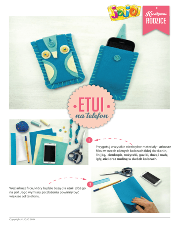 Kreatywni rodzice etui na telefon 1 Przygotuj wszystkie niezbędne materiały - arkusze filcu w trzech różnych kolorach (klej do tkanin, linijkę, cienkopis, nożyczki, guziki, dużą i małą igłę, nici oraz mulinę w dwóch kolorach. Weź arkusz filcu, który będzie bazą dla etui i złóż go na pół. Jego wymiary po złożeniu powinny być większe od telefonu. Copyright © JOJO 2014 2 Kreatywni rodzice 3 Na złożonym filcu połóż telefon, pozostawiając około 1 cm odstępu od brzegów (poza górą). Następnie obrysuj go cienkopisem... 4 W odległości 1 cm od obrysu telefonu dorysuj dodatkowe linie (z boku i na dole). W złożony arkusz wepnij szpilki, po to by tkanina nie przesuwała się w trakcie cięcia. 5 Wytnij obrysowany kształt etui. Zaokrąglij dolne rogi. Muliną w jaśniejszym kolorze i przeszyj dwa razy górny brzeg Copyright © JOJO 2014 6 Kreatywni 7 rodzice Obszyj całe etui w sposób pokazany na zdjęciach. Zakończ podwójnym obszyciem górnego brzegu. Odwróć etui na druga stronę, następnie przyklej i przyszyj ciemniejszą muliną trójkątny kształt stanowiący klapkę 8 Odwróć etui i przyszyj guzik jaśniejszą muliną. Potem natnij w klapce dziurkę na guzik. 9 Tak wygląda forma podstawowa etui. Możesz zakończyć na tym etapie, jednak jeżeli chcesz dalej ozdabiać etui, przygotuj pozostałe elementy. Wydrukuj wzór aplikacji i wytnij poszczególne elementy z kartki. Przyłóż je do kawałków jaśniejszego filcu, odrysuj i wytnij. 10 Klejem do tkanin przyklej filcowe elementy i guziki do etui Copyright © JOJO 2014 Kreatywni rodzice 11 Dla dodatkowego efektu dekoracyjnego i lepszego przymocowania elementów możesz przyszyć je do etui cieńszymi nićmi w dopasowanych kolorach. Na koniec przyszyj guziki będące oczami. 12 Gratulacje! Twoje etui jest gotowe. Copyright © JOJO 2014