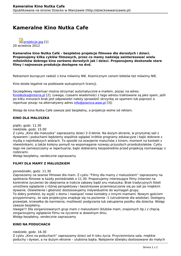 Kameralne Kino Nutka Cafe Opublikowane na stronie Dziecko w Warszawie (http://dzieckowwarszawie.pl) Kameralne Kino Nutka Cafe projekcje.jpg [1] 20 września 2012 Kameralne kino Nutka Café – bezpłatne projekcje filmowe dla dorosłych i dzieci. Proponujemy kilka cyklów filmowych, przez co mamy nadzieję zainteresować wielu miłośników dobrego kina zarówno dorosłych jak i dzieci. Proponujemy doskonałe stare filmy i najnowsze produkcje dostępne na dvd. Reklamom burzącym radość z kina mówimy NIE. Kosmicznym cenom biletów też mówimy NIE. Kino działa legalnie na podstawie wykupionych licencji. Szczegółowy repertuar można otrzymać automatycznie e-mailem, pisząc na adres: [email protected] [2], (uwaga, czasami wiadomości z tego adresu traktowane są jako spam, jeśli po kilku minutach brak jest odpowiedzi należy sprawdzić skrzynkę ze spamem lub poprosić o repertuar pisząc na alternatywny adres [email protected] [3]) Wstęp do kina Nutka Cafe zawsze jest bezpłatny, a projekcje wolne od reklam. KINO DLA MALUSZKA piątki, godz. 11.30 niedziele, godz. 15.00 Z cyklu „Kino dla maluszka” zapraszamy dzieci 2-3-letnie. Na dużym ekranie, w przytulnej sali z dywanem i poduchami będziemy wspólnie oglądać krótkie programy edukacyjne i bajki dobrane z myślą o najmłodszych widzach. To sposób na oswojenie maluchów z kinem, moment na kontakt z rówieśnikami, a także kolejny pomyśl na wspomaganie rozwoju przyszłych przedszkolaków. Cyklu tego nie zamieszczamy w repertuarze, bajki dobieramy bezpośrednio przed projekcją rozmawiając z rodzicami. Wstęp bezpłatny, serdecznie zapraszamy FILMY DLA MAMY Z MALUSZKIEM poniedziałki, godz. 11.30 Zapraszamy na seanse filmowe dla mam. Z cyklu ”Filmy dla mamy z maluszkiem” zapraszamy na spotkania filmowe w każdy poniedziałek o 11.30. Proponujemy interesujące filmy (również na konkretne życzenie) do obejrzenia w trakcie zabawy bądź snu maluszka. Brak tradycyjnych foteli umożliwia oglądanie z różnej perspektywy i bezstresowe przemieszczanie się po sali po miękkim dywanie. Oświetlenie i głośność dostosowujemy indywidualnie do wymagań grupy. To dobry pretekst, by wyjść z domu i nawiązać nowe kontakty z innymi mamami. Nowym gościom przypominamy, że sala projekcyjna znajduje się na poziomie -1 (utrudnienie dla wózków). Dostępny przewijak, krzesełka do karmienia, możliwość podgrzania lub zakupienia posiłku dla dziecka. Wstęp zawsze bezpłatny. Uwaga!!! Dla zorganizowanych grup mam z maluszkami (klubów mam, znajomych itp.) z chęcią zorganizujemy oglądanie filmu na życzenie w dowolnym dniu. Wstęp bezpłatny, serdecznie zapraszamy KINO NA PODUCHACH niedziele, godz. 16.30 Z cyklu „Kino na poduchach” zapraszamy dzieci od 4 roku życia. Przyciemniona sala, miękkie poduchy i dywan, a na dużym ekranie – ulubiona bajka. Natężenie dźwięku dostosowane do małych Strona 1 z 2 Kameralne Kino Nutka Cafe Opublikowane na stronie Dziecko w Warszawie (http://dzieckowwarszawie.pl) odbiorców, toaleta tuż obok. Macie ochotę na film w takim kinie? Wstęp bezpłatny, serdecznie zapraszamy CZWARTKOWE SPOTKANIA FILMOWE czwartki, godz. 19.00 Z cyklu "Czwartkowe spotkania filmowe" śledzimy losy znakomitych detektywów stworzonych przez Agatę Christie i Artura Conandoyl’a. Co tydzień najwspanialsze światowe ekranizacje przeniosą nas w świat zagadek, morderstw i mistrzowskiej dedukcji. Wstęp bezpłatny, serdecznie zapraszamy miejsce: Kawiarnia Nutka Café oraz Klub Edukacji Muzycznej DO-RE-MI-FA Warszawa Wola, ul. Obozowa 82A, tel. 692 925 550 e-mail: [email protected] [4] www.doremifa.strefa.pl [5] Adres źródła (wygenerowano: 2017-03-02 11:49): http://dzieckowwarszawie.pl/artykul/kameralne-kino-nutka-cafe Odnośniki: [1] http://dzieckowwarszawie.pl/sites/default/files/projekcje.jpg [2] mailto:[email protected] [3] mailto:[email protected] [4] mailto:[email protected] [5] http://doremifa.strefa.pl/ Strona 2 z 2 Powered by TCPDF (www.tcpdf.org)