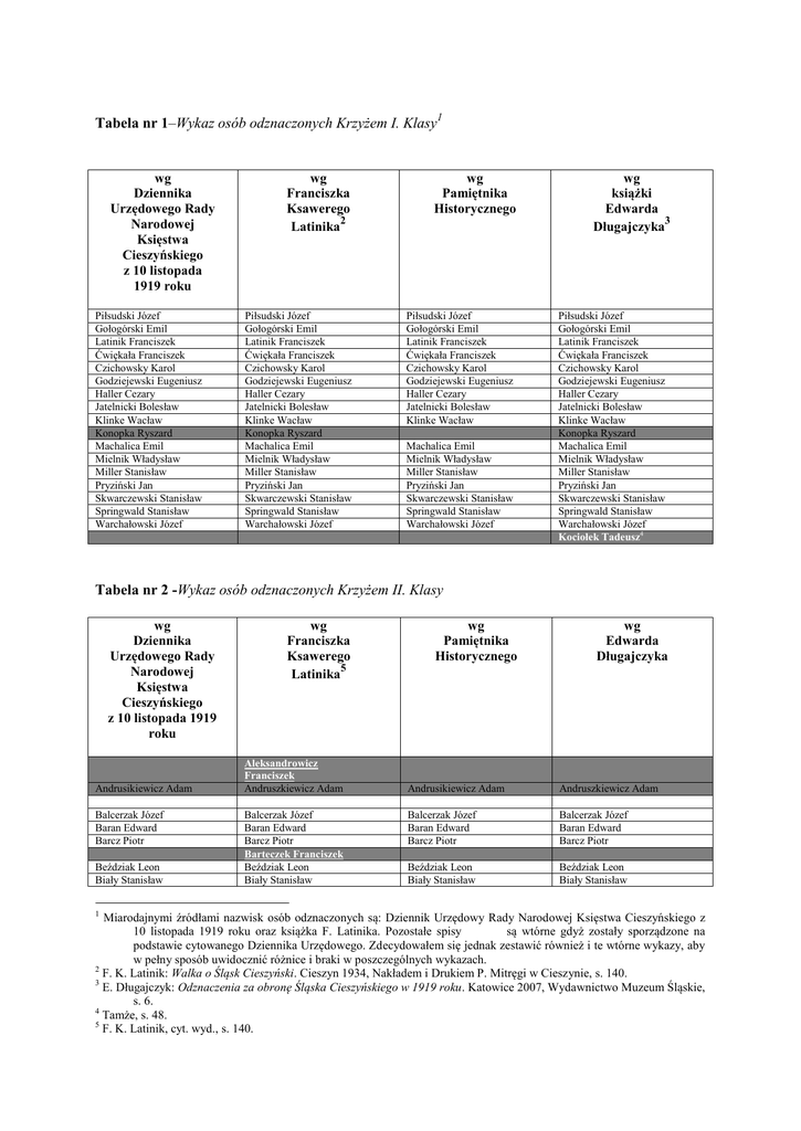 Tabela nr 1–Wykaz osób odznaczonych Krzyżem I. Klasy1 Tabela nr 2