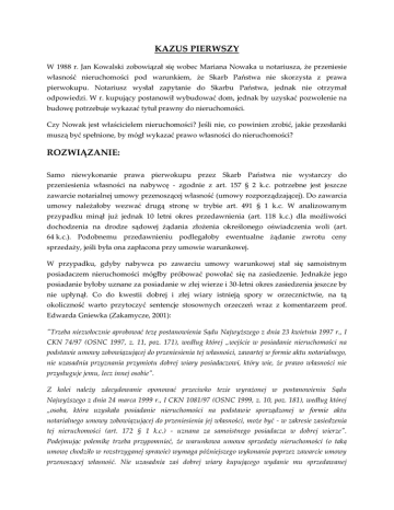KAZUS PIERWSZY W 1988 r. Jan Kowalski zobowiązał się wobec Mariana Nowaka u notariusza, że przeniesie własność nieruchomości pod warunkiem, że Skarb Państwa nie skorzysta z prawa pierwokupu. Notariusz wysłał zapytanie do Skarbu Państwa, jednak nie otrzymał odpowiedzi. W r. kupujący postanowił wybudować dom, jednak by uzyskać pozwolenie na budowę potrzebuje wykazać tytuł prawny do nieruchomości. Czy Nowak jest właścicielem nieruchomości? Jeśli nie, co powinien zrobić, jakie przesłanki muszą być spełnione, by mógł wykazać prawo własności do nieruchomości? ROZWIĄZANIE: Samo niewykonanie prawa pierwokupu przez Skarb Państwa nie wystarczy do przeniesienia własności na nabywcę - zgodnie z art. 157 § 2 k.c. potrzebne jest jeszcze zawarcie notarialnej umowy przenoszącej własność (umowy rozporządzającej). Do zawarcia umowy należałoby wezwać drugą stronę w trybie art. 491 § 1 k.c. W analizowanym przypadku minął już jednak 10 letni okres przedawnienia (art. 118 k.c.) dla możliwości dochodzenia na drodze sądowej żądania złożenia określonego oświadczenia woli (art. 64 k.c.). Podobnemu przedawnieniu podlegałoby ewentualne żądanie zwrotu ceny sprzedaży, jeśli była ona zapłacona przy umowie warunkowej. W przypadku, gdyby nabywca po zawarciu umowy warunkowej stał się samoistnym posiadaczem nieruchomości mógłby próbować powołać się na zasiedzenie. Jednakże jego posiadanie byłoby uznane za posiadanie w złej wierze i 30-letni okres zasiedzenia jeszcze by nie upłynął. Co do kwestii dobrej i złej wiary istnieją spory w orzecznictwie, na tą okoliczność warto przytoczyć sentencje stosownych orzeczeń wraz z komentarzem prof. Edwarda Gniewka (Zakamycze, 2001): "Trzeba niezwłocznie aprobować tezę postanowienia Sądu Najwyższego z dnia 23 kwietnia 1997 r., I CKN 74/97 (OSNC 1997, z. 11, poz. 171), według której „wejście w posiadanie nieruchomości na podstawie umowy zobowiązującej do przeniesienia tej własności, zawartej w formie aktu notarialnego, nie uzasadnia przyznania przymiotu dobrej wiary posiadaczowi, który wie, że prawo własności nie przysługuje jemu, lecz innej osobie". Z kolei należy zdecydowanie oponować przeciwko tezie wyrażonej w postanowieniu Sądu Najwyższego z dnia 24 marca 1999 r., I CKN 1081/97 (OSNC 1999, z. 10, poz. 181), według której „osoba, która uzyskała posiadanie nieruchomości na podstawie sporządzonej w formie aktu notarialnego umowy zobowiązującej do przeniesienia jej własności, może być - w zakresie zasiedzenia tej nieruchomości (art. 172 § 1 k.c.) - uznana za samoistnego posiadacza w dobrej wierze". Podejmując polemikę trzeba przypomnieć, że warunkowa umowa sprzedaży nieruchomości (o taką umowę chodziło w rozstrzyganej sprawie) wymaga późniejszego wykonania poprzez zawarcie umowy przenoszącej własność. Nie uzasadnia zaś dobrej wiary kupującego wydanie mu sprzedawanej nieruchomości na podstawie umowy zobowiązującej przy zaniechaniu zawarcia umowy rozporządzającej. KAZUS DRUGI Dziadek zawarł u notariusz umowę darowizny gruntu, w której darował go wnukowi. Po latach złożył on oświadczenie o odwołaniu darowizny w formie aktu notarialnego, ze względu na to, że wnuczek nie dbał o niego, i wykazywał się rażącą niewdzięcznością. W związku z tym dziadek postanowił złożyć wniosek o zmianę wpisu w księdze wieczystej, i ponowne wpisanie go jako właściciela gruntu. Jednakże od momentu darowizny minęło 5 lat, a po 3 latach od jej zawarcia wnuczek sprzedał grunt osobie trzeciej. Co zatem zrobi sąd wieczystoksięgowy z wnioskiem dziadka o wpisanie go jako właściciela? Jakie roszczenia przysługują dziadkowi wobec wnuczka? ROZWIĄZANIE: Jak w przeważającej większości przyjmuje się w doktrynie i orzecznictwie, odwołanie darowizny wywołuje jedynie skutek zobowiązujący. Dla uzyskania skutku rozporządzającego konieczne jest uzyskanie rozstrzygnięcia sądu nakazującego obdarowanemu złożenie oświadczenia woli (w trybie art. 64 k.c. w związku z art. 189 k.p.c.) przenoszącego własność z powrotem na zbywcę. Jeśli przed odwołaniem darowizny nastąpiło zbycie własności nieruchomości to nabywca będący w dobrej wierze był chroniony instytucją rękojmi wiary publicznej ksiąg wieczystych (art. 10 u.k.w.i h.). W takim przypadku (w przypadku ustalenia, że odwołanie darowizny było skuteczne) darczyńcy przysługuje wobec obdarowanego jedynie roszczenie z tytułu bezpodstawnego wzbogacenia (art. 405 i nast. k.c. w związku z art. 898 § 2 k.c.). Darczyńca nie może z kolei powołać się na instytucję ius ad rem z art. 59 k.c. z powodu dobrej wiary nabywcy oraz upływu rocznego terminu przedawnienia.