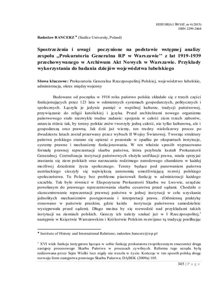 HISTORIA I ŚWIAT, nr 4 (2015) ISSN 2299-2464 Radosław BANCERZ (Siedlce University, Poland) Spostrze żenia i uwagi poczynione na podstawie wstępne j analizy zespołu ,,Prokuratoria Generalna RP w Wars zawie’’ z lat 1919-1939 przechowywanego w Archiwum Akt Nowych w Wars zawie. Przykłady wykorzystania do badania dzie jów woje wództwa lubelskiego Słowa kluczowe: Proku ratoria Generalna Rzeczpospolitej Polskiej, województ wo lubelskie, administracja, okres między wojenny Budowane od początku w 1918 ro ku państwo polskie składało się z trzech części funkcjonujących przez 123 lata w odmiennych systemach gospodarczych, politycznych i społecznych. Łączyła je jedynie pamięć o wspólnej kulturze, tradycji państwowej, przywiązanie do religii katolickiej i języka. Przed architektami nowego organizmu państwowego stało niezwykle trudne zadanie: spojenia w całość ziem trzech zaborów, zatarcia różn ic tak, by tereny polskie znów t worzyły jedną całość, nie tylko kulturową, ale i gospodarczą oraz prawną. Jak d ziś już wiemy, ten tru dny wielofazowy proces po dwudziestu latach został przerwany przez wybuch II Wojny Światowej. Tworząc struktury państwa polskiego starano się opierać o pozostałe w spadku po okupantach instytucje, systemy prawne i mechanizmy funkcjonowania. W ten właśnie s posób wypracowano formułę p rawnej reprezentacji skarbu państwa, która przybrała kształt Prokuratorii Generalnej. Centralizacja instytucji państwowych służyła unifikacji prawa, miała sprzy jać zrastaniu się ziem polskich oraz narzucaniu rodzimego narodowego charakteru w każdej mo żliwej dziedzinie życia społecznego. Tereny będące pod panowaniem państwa austriackiego cieszyły się największą autonomią u możliwiającą ro zwó j polskiego społeczeństwa. Tu Po lacy bez problemu p iastowali funkcję w ad ministracji każdego szczebla. Tak było również w Ekspozyturze Pro kuratorii Skarbu we Lwo wie, urzęd zie powołanym do prawnego reprezentowania skarbu cesarstwa przed sądami. Chodziło o skoncentrowanie reprezentacji prawnej państwa w jednej instytucji w celu u zyskania jednolitych mechanizmów postępowania i interpretacji prawa. (Od mienną praktykę stosowano w państwie pruskim, gdzie każda instytucja państwowa samodzielnie występowała przed sądem). Długo mo żna by się rozwodzić nad przykładami takich instytucji na ziemiach polskich. Genezy ich należy szukać już w I Rzeczpospolitej, 1 następnie w Księstwie Warszawskim i Kró lestwie Polskim ro zwijano tą tradycję posiłku jąc Institute of History and International Relations; radosł[email protected] XVI wiek funkcja instygatora łącząca w sobie funkcję prokuratora (współczesnym znaczeniu) druga zastępcy procesowego Skarbu Państwa w procesach cywilnych. Reforma tego urzędu byłą realizowana przez Sejm Wielki lecz nigdy nie weszła w życie. Kończąc w ten sposób polską drogę rozwoju form zastępstwa prawnego Skarbu Państwa; DĄBEK (2009a) 105. 1 345 | P a g e się rozwiązan iami austriackimi. Po likwidacji autonomii importowano ro związania państw zaborczych. Podczas pracy nad regulacjami praw skarbu państwa, bazowano przede wszystkim na ro związaniach wypracowanych w XIX wieku przez austriacki aparat państwowy. Ostatecznie przen iesiono je na cały kraj, a więc i te prowincje, gdzie nigdy nie funkcjonowała taka instytucja (zabór pruski). Warto wspomnieć, że w Prokuratorii Generalnej Królestwa Polskiego działającej w latach 1815-1915 znajdowali pracę rod zimi prawnicy, dla których droga do sądownictwa powszechnego w ramach represji popowstaniowych w KP i ziemiach pod panowaniem Pruskim była zamknięta.2 Scentralizo wana prawna reprezentacja skarbu państwa w II RP miała du ży wpły w na ustawodawstwo a przede wszystkim na orzecznictwo sądowe i tryb postępowania administracyjnego urzędnikó w każdego szczebla. Związku z ty m wydaje się zasad ne wykazanie przydatności wytworzonych przez nią materiałów do badania dziejów Lubelszczy zny w latach między wojennych. Akta zebrane w zespole Prokuratorii Generalnej RP w Warszawie z lat 1919-1939 nie są znane badaczom a mogą wnieść sporo nowego do naszej wied zy na temat regionu w omawiany m okresie. Ze szczególnym uwzg lędnieniem roln iczego charakteru tego obszaru. 7 lutego 1919 ro ku powołano Prokuratorię Generalna Rzeczypospolitej Polskiej z siedzibą w Warszawie. 3 Był to urząd centralny, służący do obrony prawnej i zastępstwa prawnego państwa polskiego. Oprócz zastępstwa sądowego 4 wymagano od Prokuratorii opinii i porad prawnych oraz współdziałania przy t worzeniu prawa. 5 W zamyśle twórców tej instytucji scentralizowan ie reprezentacji sądowej Skarbu Państwa6 miało służyć O funkcjonowaniu Prokuratorii Generalnej Królestwa Polskiego więcej w pracach M. WĄSOWICZA wykorzystanych w bibliografii. 3 Dekret o ustanowieniu prokuratorii wydał Naczelnik Państwa 7 lutego 1919 roku wraz z podpisami Prezydenta M inistrów i M inistra Skarbu. Dziennik Praw, nr 14, poz. 181; Dekret w przedmiocie utworzenia Prokuratorji Generalnej Rzeczypospolitej Polskiej. Dz. P. nr. 65, poz. 390; Ustawa z dnia 31 lipca 1919 r. w przedmiocie utworzenia Prokuratorji Generalnej Rzeczypospolitej Polskiej. Z powodu przyjęcia zasady o najwyższej władzy reprezentacyjnej Republiki Polskiej (czyli wiodącej roli sejmu) ten dekret jak i wiele innych musiał wydać ponownie parlament. 4 Prokuratoria nie była samodzielnym podmiotem postępowania sądowego, taki status miała w latach 1945-1951; GRALIŃSKI (2008) 58. 5 DĄBEK (2009a) 113. 6 W pierwszym akcie normatywnym w 9 punktach wypisano, co ustawodawca miał na myśli pod terminem majątkowe prawa i interesy państwa, podobna lista widniała w przepisach powołujących Prokuratorię Królestwa Polskiego. Poniższa lista pochodzi z Rozporządzenia Prezydenta Rzeczpospolitej z dnia 24 marca 1933 r. w sprawie uzupełnienia roz