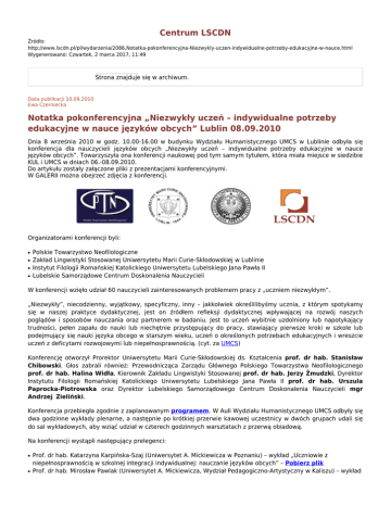 Centrum LSCDN Źródło: http://www.lscdn.pl/pl/wydarzenia/2086,Notatka-pokonferencyjna-Niezwykly-uczen-indywidualne-potrzeby-edukacyjne-w-nauce.html Wygenerowano: Czwartek, 2 marca 2017, 11:49 Strona znajduje się w archiwum. Data publikacji 10.09.2010 Ewa Czerniecka Notatka pokonferencyjna „Niezwykły uczeń – indywidualne potrzeby edukacyjne w nauce języków obcych” Lublin 08.09.2010 Dnia 8 września 2010 w godz. 10.00-16.00 w budynku Wydziału Humanistycznego UMCS w Lublinie odbyła się konferencja dla nauczycieli języków obcych „Niezwykły uczeń – indywidualne potrzeby edukacyjne w nauce języków obcych”. Towarzyszyła ona konferencji naukowej pod tym samym tytułem, która miała miejsce w siedzibie KUL i UMCS w dniach 06.-08.09.2010. Do artykułu zostały załączone pliki z prezentacjami konferencyjnymi. W GALERII można obejrzeć zdjęcia z konferencji. Organizatorami konferencji byli: ● ● ● ● Polskie Towarzystwo Neofilologiczne Zakład Lingwistyki Stosowanej Uniwersytetu Marii Curie-Skłodowskiej w Lublinie Instytut Filologii Romańskiej Katolickiego Uniwersytetu Lubelskiego Jana Pawła II Lubelskie Samorządowe Centrum Doskonalenia Nauczycieli W konferencji wzięło udział 60 nauczycieli zainteresowanych problemem pracy z „uczniem niezwykłym”. „Niezwykły”, niecodzienny, wyjątkowy, specyficzny, inny – jakkolwiek określilibyśmy ucznia, z którym spotykamy się w naszej praktyce dydaktycznej, jest on źródłem refleksji dydaktycznej wpływającej na rozwój naszych poglądów i sposobów nauczania oraz partnerem w badaniu. Jest to uczeń wybitnie uzdolniony lub napotykający trudności, pełen zapału do nauki lub niechętnie przystępujący do pracy, stawiający pierwsze kroki w szkole lub podejmujący się nauki języka obcego w starszym wieku, uczeń o określonych potrzebach edukacyjnych i wreszcie uczeń z deficytami rozwojowymi lub niepełnosprawnością. (cyt. za UMCS) Konferencję otworzył Prorektor Uniwersytetu Marii Curie-Skłodowskiej ds. Kształcenia prof. dr hab. Stanisław Chibowski. Głos zabrali również: Przewodnicząca Zarządu Głównego Polskiego Towarzystwa Neofilologicznego prof. dr hab. Halina Widła, Kierownik Zakładu Lingwistyki Stosowanej prof. dr hab. Jerzy Żmudzki, Dyrektor Instytutu Filologii Romańskiej Katolickiego Uniwersytetu Lubelskiego Jana Pawła II prof. dr hab. Urszula Paprocka-Piotrowska oraz Dyrektor Lubelskiego Samorządowego Centrum Doskonalenia Nauczycieli mgr Andrzej Zieliński. Konferencja przebiegła zgodnie z zaplanowanym programem. W Auli Wydziału Humanistycznego UMCS odbyły się dwa godzinne wykłady plenarne, a następnie po krótkiej przerwie kawowej uczestnicy w dwóch grupach udali się do sal wykładowych, aby wziąć udział w czterech godzinnych warsztatach z przerwą obiadową. Na konferencji wystąpli następujący prelegenci: ● ● Prof. dr hab. Katarzyna Karpińska-Szaj (Uniwersytet A. Mickiewicza w Poznaniu) – wykład „Uczniowie z niepełnosprawnością w szkolnej integracji indywidualnej: nauczanie języków obcych” – Pobierz plik Prof. dr hab. Mirosław Pawlak (Uniwersytet A. Mickiewicza, Wydział Pedagogiczno-Artystyczny w Kaliszu) – wykład ● ● ● ● „Rozwijanie autonomii ucznia w pracy z uczniem niezwykłym” – Pobierz plik Prof. dr hab. Katarzyna Karpińska-Szaj (Uniwersytet A. Mickiewicza w Poznaniu) – warsztat „Uczeń z niedoborami języka ojczystego na lekcji języka obcego” Dr Agnieszka Pawluk-Skrzypek (Uniwersytet M. Curie-Skłodowskiej w Lublinie) – warsztat „Diagnoza pedagogiczna i przeciwdziałanie niepowodzeniom szkolnym” – Pobierz plik Dr Katarzyna Jaworska-Biskup – warsztat „Uczeń z dysleksją rozwojową na lekcji języka obcego” Mgr Edyta Wajda (Uniwersytet w Białymstoku) – warsztat „Indywidualizacja oceniania z użyciem technik oceniania alternatywnego” Uczestnicy konferencji otrzymali 45-stronicową broszurę z materiałami konferencyjnymi, która zawiera biogramy i streszczenia wystąpień prelegentów oraz wiadomości mające na celu podsumowanie i uzupełnienie przekazu ustnego podczas konferencji. Nauczyciele dostali również materiały dotyczące języków obcych nadesłane przez mgr Ewę Wieczorek z Ośrodka Rozwoju Edukacji w Warszawie, jak również wybrane pozycje książkowe i inne materiały edukacyjne zapewnione przez partnera konferencji – Wydawnictwo Szkolne PWN. Zapraszam do obejrzenia zdjęć z konferencji, które znajdują się w GALERII. Ewa Czerniecka Konsultant LSCDN ds. edukacji języków obcych i zastosowania technologii informacyjnej w nauczaniu Załączniki do strony Konf_8wrz2010_Wyklad_KKarpinskaSzaj 7.35 MB Data dodania 15.09.2010 12:43 Konf_8wrz2010_Wyklad_MPawlak 417.12 KB Data dodania 15.09.2010 12:45 Konf_8wrz2010_Warsztaty_APawlukSkrzypek 2.61 MB Data dodania 15.09.2010 12:46