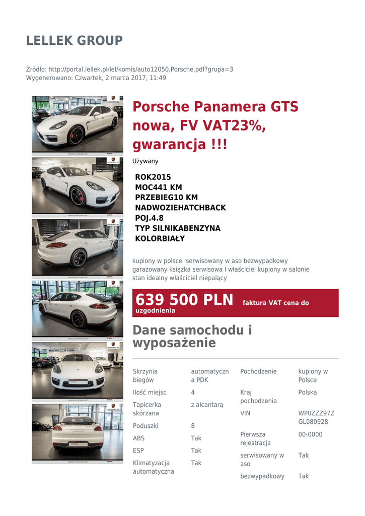 LELLEK GROUP Źródło: http://portal.lellek.pl/lel/komis/auto12050,Porsche.pdf?grupa=3 Wygenerowano: Czwartek, 2 marca 2017, 11:49 Porsche Panamera GTS nowa, FV VAT23%, gwarancja !!! Używany ROK2015 MOC441 KM PRZEBIEG10 KM NADWOZIEHATCHBACK POJ.4.8 TYP SILNIKABENZYNA KOLORBIAŁY kupiony w polsce serwisowany w aso bezwypadkowy garażowany książka serwisowa I właściciel kupiony w salonie stan idealny właściciel niepalący 639 500 PLN faktura VAT cena do uzgodnienia Dane samochodu i wyposażenie Skrzynia biegów automatyczn a PDK Pochodzenie kupiony w Polsce Ilość miejsc 4 Polska Tapicerka skórzana z alcantarą Kraj pochodzenia VIN Poduszki 8 WP0ZZZ97Z GL080928 ABS Tak Pierwsza rejestracja 00-0000 ESP Tak Tak serwisowany w aso Tak Klimatyzacja automatyczna bezwypadkowy Tak Elektryczne szyby garażowany Tak książka serwisowa Tak I właściciel Tak kupiony w salonie Tak tunning homologacja stan idealny Tak właściciel niepalący Tak Tak Handlowiec Marcin Teske, Maciej Słobodowski +48 661 911 912 zapytaj mobile +48 515 000 911 Gwarancja mechaniczna 24 miesięcy perforacja nadwozia - Ubezpieczenie Ubezpieczenie Kredyt dostępne Elektryczne lusterka Tak Szyberdach Tak Wspomaganie kierownicy Tak Komputer Tak Radioodtwarza cz Tak Alarm Tak Immobilizer Tak Centralny zamek Tak Nawigacja satelitarna Tak Światła przeciwmgieln e Tak Czujnik deszczu Tak Czujniki parkowania Tak Kierownica wielofunkcyjna Tak Podgrzewane fotele Tak Tempomat Tak 4x4 Tak Kamera cofania Tak Bluetooth Tak System Start-Stop Tak Asystent parkowania Tak Czujniki parkowania przód Tak Światła LED Tak Alufelgi 20 cali Miejsce postoju Porsche Centrum Sopot / Approved Kredyt dostępny Opis dodatkowy Porsche Panamera GTS Produkcja 2015, Model 2016 Silnik 4806 ccm, Moc 441 KM, samochód niezarejestrowany Samochód niezarejestrowany, Samochód na gwarancji fabrycznej z możliwością przedłużania Wyposażenie: Zeskanuj kod, aby zobaczyć ofertę online Kolor White ( biały ) Tapicerka skórzana Black z Alcantarą i pakietem GTS Carmine Red Asystent parkowania ( przód i z tył ) z kamerą cofania Czarne reflektory LED w połączeniu z Porsche Dynamic Light System ( PDLS ) Delikatne domykanie drzwi Soft Close Dywaniki podłogowe Elektrycznie sterowany szklany dach Porsche Doppelkupplung ( PDK ) w połączeniu z fukcją Auto Start-Stop Porsche Entry & Drive Przyciemnione szyby Przygotowanie do telefonu komórkowego Serwisy online System dźwiękowy BOSE Surround Sound Uchwyt na napoje Układ kontroli ciśnienia w oponach ( TPM ), zawór w czarnym kolorze Uniwersalne złącze audio Wspomaganie układu kierowniczego Plus 20 calowe koła Sport Classic w kolorze Black ( wysoki połysk ) Nota prawna Informacja nie stanowi oferty w rozumieniu art. 66 Kodeksu Cywilnego. Podane dane mają charakter wyłącznie informacyjny. Pełna informacja dostępna jest u handlowca. Sprzedający nie odpowiada za ewentualne błędy lub nieaktualność ogłoszenia.