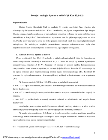 Poezja i teologia hymnu o miłości (1 Kor 13,1-13) Wprowadzenie Ojciec Święty Benedykt XVI w punkcie 34 swojej encykliki Deus Caritas Est odnosząc się do hymnu o miłości w 1 Kor 13 stwierdza, że „hymn ten powinien być Magna Charta całej posługi kościelnej; są w nim zebrane wszystkie refleksje na temat miłości, które zawarliśmy w Encyklice”. Stwierdzenie to upoważnia nas do głębszego spojrzenia na tekst św. Pawła, który zawiera w sobie nie tylko piękno poetyckich strof, lecz także głębokie myśli teologiczne. W niniejszym artykule przedmiotem naszego zainteresowania będą dwa zagadnienia: kunszt literacki hymnu o miłości oraz jego orędzie teologiczne. 1. Kunszt literacki hymnu o miłości Hymn o miłości (1 Kor 13,1-13) wchodzi w skład większej sekcji 1 Listu do Koryntian na temat charyzmatów zawartej w rozdziałach 12,1 - 14,40. W sekcji tej można wyodrębnić koncentryczną strukturę A B A’. Rozdział 12 opisuje w sposób ogólny funkcjonowanie charyzmatów, które mimo że są różne, to cechuje je jedność (A). Rozdział 13 koncentruje się na opisie miłości jako najdoskonalszej drodze życia chrześcijańskiego (B). Rozdział 14 powraca do opisu charyzmatów i ich szczegółowej aplikacji w konkretnym życiu wspólnoty (A’). W hymnie o miłości (1 Kor 13,1-13) można wyodrębnić trzy części: a. ww. 1-3 – opis roli miłości jako źródła i nieodzownego warunku dla wartości wszelkich darów duchowych. b. ww. 4-7 – charakterystyka natury miłości w oparciu o użycie czasowników bez negacji i z negacją. c. ww. 8-13 – podkreślenie wiecznej trwałość miłości w odróżnieniu od innych darów duchowych. Analizując poszczególne części hymnu o miłości możemy dostrzec w nich pewien charakterystyczny triadyczny rytm oraz pewne specyficzne elementy literackie. W części pierwszej (ww. 1-3) każdy z trzech wersetów zawiera podobną, paralelną konstrukcję zdania warunkowego złożonego z tych samych elementów. Widać tu wyraźnie wprowadzoną przez autora zamierzoną rytmikę: eva,n + czasownik (jeden lub więcej) + avga,phn de. mh. e;cw + człon konkluzji 1 PDF stworzony przez wersję demonstracyjną pdfFactory Pro www.pdffactory.pl/ jeśli (gdyby) + czasownik (jeden lub więcej) + lecz miłości bym nie miał + człon konkluzji w. 1 - Gdybym mówił językami ludzi i aniołów, a miłości bym nie miał, stałbym się jak miedź brzęcząca albo cymbał brzmiący. w. 2 - Gdybym też miał dar prorokowania i znał wszystkie tajemnice, i posiadał wszelką wiedzę, i wszelką możliwą wiarę, tak iżbym góry przenosił a miłości bym nie miał, byłbym niczym. w. 3 - I gdybym rozdał na jałmużnę całą majętność moją, a ciało wystawił na spalenie, a miłości bym nie miał, nic bym nie zyskał. W tej części hymnu św. Paweł wskazuje na triadę: języki (glw,ssai), proroctwo (profhtei,a) i wiedzę (gnw/sij) do której nawiązuje także w dalszej części hymnu (ww. 8-9). W pierwszych trzech wersetach autor używa czasowników w 1 osobie liczby pojedynczej. Nawiązuje tym do kontekstu poprzedniego i następnego, gdzie często taka forma wypowiedzi jest używana. Także w kontekście bezpośrednio poprzedzającym hymn (12,31b), który stanowi swoiste wprowadzenie - zostaje użyty czasownik dla 1 osoby liczby pojedynczej (…a ja wam wskażę drogę jeszcze doskonalszą). Podmiot w pierwszej osobie liczby pojedynczej (ja) jest w tym fragmencie charakteryzowany przez „działanie” (mówienie, rozdawanie swych dóbr, wydanie swego ciała) oraz przez „posiadanie” (daru prorokowania, znajomości tajemnic, wiedzy, wiary). Wartość działającego i posiadającego podmiotu jest warunkowana od miłości. Bez miłości „ja” staje się bezużyteczne i bezwartościowe. W drugiej części (ww. 4-7) widoczna jest zmiana podmiotu z zaimka „ja” dla pierwszej osoby liczby pojedynczej na rzeczownik „miłość” (agape). Widoczne jest tu także przejście od opisu warunkowego (gdyby…, jeśli…) do realnego przedstawienia charakterystyki agape. Część ta charakteryzuje się koncentryczną strukturą A B A’. Dwie krótsze sekcje A (w. 4a) i A’ (w. 7) otaczają bardziej rozbudowaną sekcję B (ww. 4b-6). Pierwszy i ostatni czasownik tej części: w w. 4 makroqume,w (być cierpliwym) i w w. 7 u`pome,nw (znosić, przetrzymać) mają zbliżone znaczenie i tworzą piękną inkluzję. W pierwszej sekcji A (w. 4a) miłość charakteryzowana jest dwa razy bez użycia negacji cierpliwa jest, łaskawa jest. Następnie w centralnej sekcji B (ww. 4b-6) miłość jest charakteryzowana 8 razy przez użycie negacji, w ostatnim określeniu występuje równoważnik bez negacji (B) - nie zazdrości, nie szuka poklasku, nie unosi się pychą, nie dopuszcza się bezwstydu, nie szuka swego, nie unosi się gniewem, nie pamięta złego, nie cieszy się z niesprawiedliwości, lecz współweseli się z prawdą. W tej części osiem następujących po sobie czasowników tworzy pary, które mają podobne zakończenia. Pierwsza para charakteryzuje się 2 PDF stworzony przez wersję demonstracyjną pdfFactory Pro www.pdffactory.pl/ przez końcówkę – tai (ouv perpereu,etai, ouv fusiou/tai), druga para zawiera końcówkę – ei (ouvk avschmonei/, ouv zhtei/ ta. e`auth/j), trzecia para ma końcówkę – etai (ouv paroxu,netai( ouv logi,zetai to. kako,n), w czwartej parze występuje końcówka – ei (ouv cai,rei, sugcai,rei). Ostatni czasownik drugiej i trzeciej pary zawiera czasownik z dopełnieniem – co jeszcze bardziej wzmacnia paralelizm i pokazuje poetycki kunszt św. Pawła. Ostatnia para czasowników zostaje zestawiona przez zastosowanie paralelizmu antytetycznego (negacja w kontraście do zdania pozytywnego – ouv cai,rei evpi. th/| avdiki,a|( sugcai,rei de. th/| avlhqei,a| nie cieszy się z niesprawiedliwości, lecz współweseli się z prawdą. W końcowej sekcji A’ (w. 7) podobnie jak na początku w sekcji A 