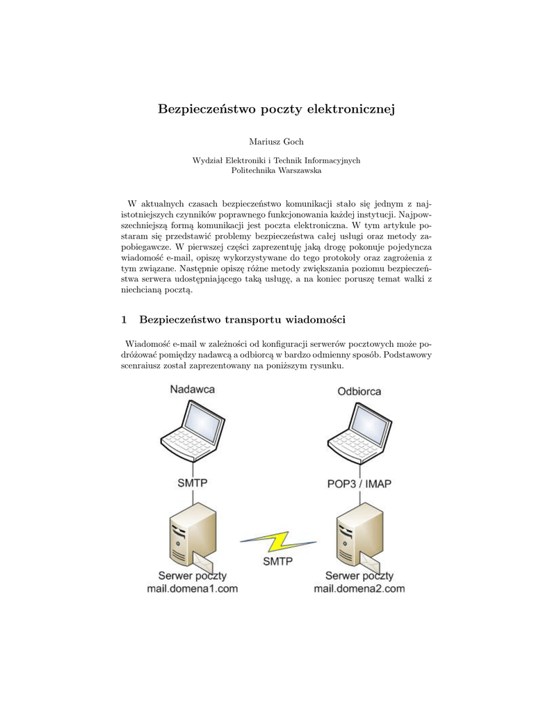 Bezpieczeństwo poczty elektronicznej Mariusz Goch Wydział Elektroniki i Technik Informacyjnych Politechnika Warszawska W aktualnych czasach bezpieczeństwo komunikacji stało się jednym z najistotniejszych czynników poprawnego funkcjonowania każdej instytucji. Najpowszechniejszą formą komunikacji jest poczta elektroniczna. W tym artykule postaram się przedstawić problemy bezpieczeństwa całej usługi oraz metody zapobiegawcze. W pierwszej części zaprezentuję jaką drogę pokonuje pojedyncza wiadomość e-mail, opiszę wykorzystywane do tego protokoły oraz zagrożenia z tym związane. Następnie opiszę różne metody zwiększania poziomu bezpieczeństwa serwera udostępniającego taką usługę, a na koniec poruszę temat walki z niechcianą pocztą. 1 Bezpieczeństwo transportu wiadomości Wiadomość e-mail w zależności od konfiguracji serwerów pocztowych może podróżować pomiędzy nadawcą a odbiorcą w bardzo odmienny sposób. Podstawowy scenraiusz został zaprezentowany na poniższym rysunku. Wiadomość jest tworzona za pośrednictwem dowolnego klienta pocztowego, który następnie za pomocą protokołu SMTP komunikuje się z serwerem pocztowym nadawcy i mu ją przekazuje. Ten z kolei wyszukuje w bazie DNS rekordy MX domeny odbiorcy. Rekordy te wskazują na serwery odpowiedzialne za obsługę poczty dla danej domeny. W ten sposób lokalizowany jest serwer pocztowy odbiorcy, z którym następnie jest realizowana komunikacja również za pomocą protokołu SMTP. Skutkiem tego wiadomość przekazana jest na serwer pocztowy odbiorcy. Aby móc ją odczytać odbiorca łączy się z nim przy użyciu jednego z dwóch protokołów POP3 lub IMAP i pobiera ją do swojego lokalnego programu pocztowego. Przyjrzyjmy się teraz trochę bliżej wykorzystanym tutaj protokołom. SMTP czyli Simple Mail Transfer Protocol jest względnie prostym protokołem tekstowym. Jak pokazano wyżej służy on do wysyłania wiadomości oraz jej transportu pomiędzy serwerami pośredniczącymi. Ze względu na to że rekordy MX w DNSie przechowują tylko informacje o lokalizacji serwera, to usługa realizująca obsługę tego protokołu musi być uruchomiona na stałym porcie: 25. Poniżej zamieściłem przykładową komunikację. 220 test.com ESMTP Easy.Server EHLO dom 250-test.com 250-PIPELINING 250-SIZE 20000000 250-ETRN 250-STARTTLS 250-AUTH LOGIN PLAIN 250-AUTH=LOGIN PLAIN 250-ENHANCEDSTATUSCODES 250-8BITMIME 250 DSN AUTH LOGIN 334 VXNlcm5hbWU6 [Username:] cG9jenRhQHRlc3QuY29tCg== [[email protected]] 334 UGFzc3dvcmQ6 [Password:] dGVzdAo= [test] 235 2.0.0 Authentication successful MAIL FROM:<[email protected]> 250 2.1.0 Ok RCPT TO:<[email protected]> 250 2.1.5 Ok DATA 354 End data with <CR><LF>.<CR><LF> Wiadomość . 250 2.0.0 Ok: queued as 723F62090F1 2 QUIT 221 2.0.0 Bye Na wstępie obie strony połączenia się wzajemnie przedstawiają. W tym wypadku serwer przedstawił się jako test.com, natomiast klient pocztowy jako dom. Następnie serwer wysyła do klienta informacje o swojej konfiguracji oraz rozszerzeniach protokołu jakie obsługuje. Najważniejsze informacje z powyższego przykładu to:j – SIZE 20000000 - maksymalna wielkość wiadomości w bajtach – STARTTLS - możliwość włączenia szyfrowania komunikacji TLS – AUTH=LOGIN PLAIN DIGEST-MD5 CRAM-MD5 - dostępne metody uwierzytelniania Po wymienieniu tych informacji zostało przeprowadzone uwierzytelnianie metodą LOGIN. Występuje ono tylko w sytuacji gdy skrzynka pocztowa nadawcy jest obsługiwana przez dany serwer, czyli przy komunikacji zainicjowanej przez klienta pocztowego. Dzięki temu tylko właściciel danej skrzynki jest uprawniony do wysyłania z niej wiadomości. Po uwierzytelnieniu klient za pomocą dwóch komend MAIL FROM i RCPT TO przekazuje odpowiednio adres nadawcy i odbiorcy. Każdorazowo serwer wysyła odpowiedź czy akceptuje podany adres. Przykładowo gdyby etap uwierzytelniania został pominięty, natomiast podany adres nadawcy wskazywałby na ten serwer to zostałby zwrócony komunikat odmowny. Następnie po komendzie DATA przesyłany jest właściwy kod wiadomości. W powyższym przykładzie serwer poinformował klienta, że obsługuje cztery różne metody uwierzytelniania. Dwie pierwsze PLAIN i LOGIN są oparte na kodowaniu base64. Służy ono do zapisu ciągu bajtów za pomocą ciągu znaków i jest całkowicie odwracalne. W związku z tym obie metody nie dają żadnego zabezpieczenia przed podsłuchaniem transmisji. Różnią się one tylko realizacją przesyłania danych. W metodzie PLAIN wysyłany jest tylko jeden komunikat, który stanowi zakodowany ciąg: nazwa użytkownika, skrzynki oraz hasło, oddzielone znakiem o kodzie 0. W drugiej metodzie, jak było widać na przykładzie, dane te są przesyłane oddzielnie. Pozostałe dwa rozwiązania CRAM-MD5 i DIGEST-MD5 są oparte na funkcji haszującej MD5, a dokładniej na kodowaniu HMAC (keyed-Hash Message Authentication Code). Kodowanie to nie jest odwracalne, dzięki czemu już zabezpiecza hasło przed podsłuchaniem. Pierwsza z tych metod uwierzytelnia jedynie klienta względem serwera. Druga natomiast również na odwrót, dzięki czemu zabezpiecza dodatkowo przed atakiem podszywania, czyli sytuacją gdyby komuś udało się zmodyfikować routing bądź wpisy w DNS i zmusić klienta pocztowego do połączenia z własnym serwerem. Na podsłuch oprócz danych uwierzytelniających narażona jest również sama treść wiadomości. W tym celu zostało zaprojektowane specjalne rozszerzenie STARTTLS. W przypadku gdy obie strony je obsługują, inicjator połączenia 3 może wykonać komendę STARTTLS, która rozpoczyna komunikację szyfrowaną protokołem TLS (Transport Layer Security). Dodatek ten może być wykorzystywany zarówno przy połączeniach klienta pocztowego z serwerem, jak i pomiędzy serwerami. Jak już wcześniej wspomniałem poza protokołem SMTP przy transporcie poczty wykorzystywane są również protokoły POP3 (Post Office Pro