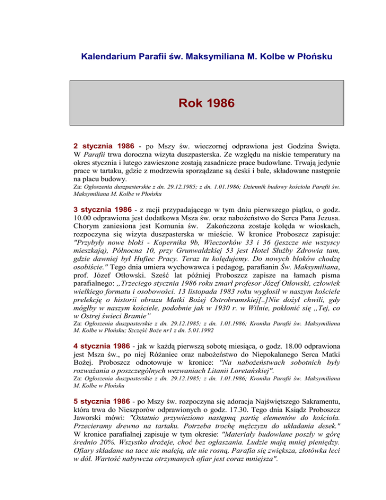 Kalendarium Parafii św. Maksymiliana M. Kolbe w Płońsku Rok 1986 2 stycznia 1986 - po Mszy św. wieczornej odprawiona jest Godzina Święta. W Parafii trwa doroczna wizyta duszpasterska. Ze względu na niskie temperatury na okres stycznia i lutego zawieszone zostają zasadnicze prace budowlane. Trwają jedynie prace w tartaku, gdzie z modrzewia sporządzane są deski i bale, składowane następnie na placu budowy. Za: Ogłoszenia duszpasterskie z dn. 29.12.1985; z dn. 1.01.1986; Dziennik budowy kościoła Parafii św. Maksymiliana M. Kolbe w Płońsku 3 stycznia 1986 - z racji przypadającego w tym dniu pierwszego piątku, o godz. 10.00 odprawiona jest dodatkowa Msza św. oraz naboŜeństwo do Serca Pana Jezusa. Chorym zaniesiona jest Komunia św. Zakończona zostaje kolęda w wioskach, rozpoczyna się wizyta duszpasterska w mieście. W kronice Proboszcz zapisuje: "Przybyły nowe bloki - Kopernika 9b, Wieczorków 33 i 36 (jeszcze nie wszyscy mieszkają), Północna 10, przy Grunwaldzkiej 53 jest Hotel SłuŜby Zdrowia tam, gdzie dawniej był Hufiec Pracy. Teraz tu kolędujemy. Do nowych bloków chodzę osobiście." Tego dnia umiera wychowawca i pedagog, parafianin Św. Maksymiliana, prof. Józef Otłowski. Sześć lat później Proboszcz zapisze na łamach pisma parafialnego: „Trzeciego stycznia 1986 roku zmarł profesor Józef Otłowski, człowiek wielkiego formatu i osobowości. 13 listopada 1983 roku wygłosił w naszym kościele prelekcję o historii obrazu Matki BoŜej Ostrobramskiej[..]Nie doŜył chwili, gdy mógłby w naszym kościele, podobnie jak w 1930 r. w Wilnie, pokłonić się „Tej, co w Ostrej świeci Bramie” Za: Ogłoszenia duszpasterskie z dn. 29.12.1985; z dn. 1.01.1986; Kronika Parafii św. Maksymiliana M. Kolbe w Płońsku; Szczęść BoŜe nr1 z dn. 5.01.1992 4 stycznia 1986 - jak w kaŜdą pierwszą sobotę miesiąca, o godz. 18.00 odprawiona jest Msza św., po niej RóŜaniec oraz naboŜeństwo do Niepokalanego Serca Matki BoŜej. Proboszcz odnotowuje w kronice: "Na naboŜeństwach sobotnich były rozwaŜania o poszczególnych wezwaniach Litanii Loretańskiej". Za: Ogłoszenia duszpasterskie z dn. 29.12.1985; z dn. 1.01.1986; Kronika Parafii św. Maksymiliana M. Kolbe w Płońsku 5 stycznia 1986 - po Mszy św. rozpoczyna się adoracja Najświętszego Sakramentu, która trwa do Nieszporów odprawionych o godz. 17.30. Tego dnia Ksiądz Proboszcz Jaworski mówi: "Ostatnio przywieziono następną partię elementów do kościoła. Przecieramy drewno na tartaku. Potrzeba trochę męŜczyzn do układania desek." W kronice parafialnej zapisuje w tym okresie: "Materiały budowlane poszły w górę średnio 20%. Wszystko droŜeje, choć bez ogłaszania. Ludzie mają mniej pieniędzy. Ofiary składane na tace nie maleją, ale nie rosną. Parafia się zwiększa, złotówka leci w dół. Wartość nabywcza otrzymanych ofiar jest coraz mniejsza". 131 Za: Ogłoszenia duszpasterskie z dn. 29.12.1985; z dn. 5.01.1986; Kronika Parafii św. Maksymiliana M. Kolbe w Płońsku 6 stycznia 1986, Uroczystość Objawienia Pańskiego (Trzech Króli) - Msze św. odprawiane są w tym dniu o godz. 7.00, 9.00, 10.00 i 18.00. Podczas Mszy św. sprawowanej o godz. 10.00 poświęcone są kadzidło i kreda. Za: Ogłoszenia duszpasterskie z dn. 5.01.1986 19 stycznia 1986 - po Mszy św. o godz. 10.00 odbywa się spotkanie rolników. O godz. 18.00 odprawiona jest Msza św. w intencji Ojczyzny. Trwa Tydzień Modlitw o Zjednoczenie Chrześcijan. Trwają prace przy budowie kościoła. W kronice Proboszcz zapisuje: " Nie zrobili wszystkich elementów klejonych - zabrakło im kleju. Chcą, Ŝeby płacić im teraz droŜej. Piszę odwołania." Za: Ogłoszenia duszpasterskie z dn. 19.01.1986 26 stycznia 1986 - podczas Mszy św. o godz. 10.00 udzielony jest sakrament Chrztu św. W ogłoszeniach Proboszcz mówi tego dnia: "W zasadzie zakończyliśmy przecieranie drewna na tartaku. Bóg zapłać wszystkim, którzy w tym uczestniczyli, przede wszystkim gospodarzom z Szerominka, którzy własnym sprzętem jeździli na tartak, tym, którzy tu na placu, nieraz w błocie i słocie korowali i układali te cięŜkie bale i deski." Za: Ogłoszenia duszpasterskie z dn. 26.01.1986 29 stycznia 1986 - po Mszy św. wieczornej odbywa się spotkanie dla rodziców dzieci z klas drugich, przygotowujących się do przyjęcia Pierwszej Komunii Św. W tym okresie Proboszcz odnotowuje: "Jeden z księŜy zorganizował scholę z dziewczynek". Za: Ogłoszenia duszpasterskie z dn. 26.01.1986; Kronika Parafii św. Maksymiliana M. Kolbe w Płońsku 31 stycznia 1986 – kończy się doroczna wizyta duszpasterska. "Kolędę - mimo wzrostu liczby parafian - kończymy w ostatnim dniu stycznia - zapisuje Ksiądz Jaworski w kronice parafialnej - Władze państwowe obliczyły, Ŝe nasza parafia liczy obecnie 11.066 osób. My nie wiemy dokładnie ile, bo nie wszyscy przyjmują nas na kolędzie. Na początku istnienia parafii podano nam liczbę 8.700. CzyŜby mi tylu przybyło?.." Za: Kronika Parafii św. Maksymiliana M. Kolbe w Płońsku 1 lutego 1986 - jak w kaŜdą pierwszą sobotę miesiąca, o godz. 18.00 odprawiona jest Msza św. i naboŜeństwo ku czci Niepokalanego Serca Matki BoŜej. Za: Ogłoszenia duszpasterskie z dn. 26.01.1986 2 lutego 1986, Święto Ofiarowania Pańskiego (MB Gromnicznej) - podczas Mszy św. o godz. 10.00 zostają poświęcone przyniesione przez parafian gromnice. Po południu w kościele trwa adoracja Najświętszego Sakramentu. W kronice Proboszcz zapisuje: "Mimo zimna - adoracja popołudniowa w pierwszą niedzielę trwa". O godz. 18.00 jest odprawiona Msza św. w intencji Rycerstwa Niepokalanej i członków kółek śywego RóŜańca. W ogłoszeniach duszpasterskich Proboszcz powiadamia, Ŝe odtąd, w kaŜdą środę po wieczornej Mszy św. organizowane będą spotkania religijne dla młodzieŜy pozaszkolnej. "Prosimy wszelką młodzieŜ po ukończeniu szkoły podstawowej - mówi Tę, która uczy się lub