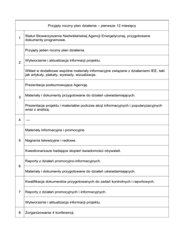 Przyjęty roczny plan działania – pierwsze 12 miesięcy 1 Statut Stowarzyszenia Nadwiślańskiej Agencji Energetycznej, przygotowane dokumenty programowe. Przyjęty jeden roczny plan działania. 2 Wytworzenie i aktualizacja informacji projektu. Wkład w dodatkowe wspólne materiały informacyjne związane z działaniami IEE, taki jak artykuły, plakaty, wywiady, wizualizacje. Prezentacja podsumowująca Agencję. 3 Materiały i dokumenty przygotowane do działań uświadamiających. Prezentacje projektu i materiałów podczas akcji informacyjnych i popularyzacyjnych wraz z analizą. 4 --Materiały informacyjne i promocyjne. 5 Nagrania telewizyjne i radiowe. Kwestionariusze badające stopień świadomości obywateli. Raporty z działań promocyjno-informacyjnych. 6 Materiały i dokumenty przygotowane do działań uświadamiających. Kwalifikacja dokumentów przygotowanych do zadań kontrolnych i raportowych. 7 Raporty z działań promocyjnych i informacyjnych. Wytworzenie i aktualizacja informacji projektu. 8 Zorganizowanie 4 konferencji. Jeden artykuł prasowy, wywiad, nagrania radiowe lub telewizyjne o działaniach na rzecz planowania energetycznego. Materiały seminaryjne i szkoleniowe (wykłady i prezentacje) dotyczące poszanowania energii i zastosowania odnawialnych źródeł energii. Materiały i dokumenty opracowane podczas współpracy na szczeblu regionalnym, krajowym i międzynarodowym. Baza danych zawierająca informacje dotyczące energii, podaży energii, racjonalnego i efektywnego wykorzystania energii, wykorzystania odnawialnych źródeł energii na terenie działania Nadwiślańskiej Agencji Energetycznej. Materiały i prezentacje z konferencji dotyczących planowania energetycznego. 9 Jeden artykuł prasowy, wywiad, nagrania radiowe lub telewizyjne o działaniach na rzecz planowania energetycznego. Prezentacje projektu i materiałów podczas akcji informacyjnych i popularyzacyjnych wraz z analizą. Jeden artykuł prasowy, wywiad, nagrania radiowe lub telewizyjne o działaniach na rzecz planowania energetycznego. 2 zaplanowane artykuły prasowe dotyczące poszanowania energii i zastosowania odnawialnych źródeł ukazujących się w prasie lokalnej poszczególnych powiatów. Nieplanowane artykuły prasowe o szkoleniach, konferencjach lub ukończonych 10 instalacjach, nagrania wywiadów, programów TV i radiowych dotyczących tego pakietu prac. Wytworzenie i aktualizacja informacji projektu. Wkład w dodatkowe wspólne materiały informacyjne związane z działaniami IEE, taki jak artykuły, plakaty, wywiady, wizualizacje. Wypracowana wspólna polityka wykorzystania odnawialnych źródeł energii na terenie działania Agencji. 11 2 dokumenty sporządzone dla celów informacyjnych i upowszechniających. Materiały z konferencji dotyczące budownictwa pasywnego i wykorzystania źródeł energii odnawialnej. Materiały i dokumenty przygotowane do działań uświadamiających. Dokumenty dotyczące planowania energetycznego opracowane dla gmin (jeden plan zaopatrzenia gminy w energię, jedna aktualizacja istniejących planów z oceną zasobów OZE i możliwością ich wykorzystania, jeden zbiorowy dokument dla regionu objętego obszarem działania Agencji - wskazując wspólną strategię wykorzystania dostępnych, odnawialnych źródeł energii). 12 Baza danych zawierająca informacje dotyczące poszanowania energii i wykorzystania odnawialnych źródeł energii. Baza danych z informacjami o budownictwie pasywnym i wykorzystaniu najbardziej dostępnych źródeł energii odnawialnej. Materiały informacyjne i promocyjne. Nagrania telewizyjne i radiowe.