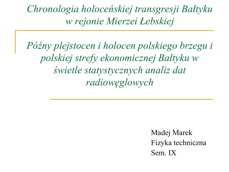 Chronologia holoceńskiej transgresji Bałtyku w rejonie Mierzei Łebskiej Późny plejstocen i holocen polskiego brzegu i polskiej strefy ekonomicznej Bałtyku w świetle statystycznych analiz dat radiowęglowych Madej Marek Fizyka techniczna Sem. IX Plan seminarium Co to jest Mierzeja? Obszar i zakres badań Wyniki datowania 14C Fazy i subfazy holoceńskiej transgresji Bałtyku w rejonie Mierzei Łebskiej Statystyczna analiza dat radiowęglowych Podsumowanie Mierzeja - przedłużenie zasadniczego lądu stałego, lub jego półwyspu, usypane przez morskie fale przybrzeżne. Obszar i zakres badań Zachodnia część Mierzei Łebskiej w odległości 2,7km na północny-wchód od latarni morskiej w Czołpinie Otwory badawcze: Łeba-93, Łeba-93A i Łeba172 Rodzaj i następstwo osadów serii morsko-lagunowej w analizowanych trzech profilach jest praktycznie biorąc taki sam. Korelacja analizowanych profili Analiza uziarnienia – w celu poznania profilu litostratygraficznego – 101 prób (Łeba-93) – Laboratorium Zakładu Geologii i Paleogeografii Czwartorzędu im. Adama Mickiewicza w Poznaniu Analizy geochemiczne - (Łeba-93) -73 próbki (Poznań) 26 prób – badania malakologiczne (Oddział Geologii Morza PIG w Gdańsku) , mikrofaunistyczne, flora okrzemkowa (Zakład Paleooceanologii Instytutu Nauk o Morzu, Uniwersytet Szczeciński) Określenie wieku radiowęglowego muszli Cardium (Zakład Zastosowań Radioizotopów Instytutu Fizyki Politechniki Śląskiej w Gliwicach) oraz składu izotopowego węgla i tlenu (Laboratorium Spektrometrii Mas Instytutu Fizyki Uniwersytetu Marii Curie-Słodowskiej w Lublinie) - 24 próbki Łeba-93A i Łeba-172 Wyniki datowania radiowęglowego oraz pomiaru składu izotopów stabilnych węgla i tlenu w próbkach Cardium Fazy i subfazy holoceńskiej transgresji Bałtyku w rejonie Mierzei Łebskiej Statystyczna analiza dat radiowęglowych Polska strefa ekonomiczna oznacza należący do Polski to obszar południowego Bałtyku o powierzchni około 35000km2 250 stanowisk – liczba dat – ponad 500 Analiza na podstawie materiałów znajdujących się w Banku danych w Oddziale Geologii Morza Państwowego Instytutu Geologii 508 wyników datowania (488 – pochodzi z laboratorium 14C w Gliwicach, pozostałe zostały wykonane w laboratoriach zagranicznych Nie wykorzystano dat pochodzących ze stanowisk archeologicznych i zakorzenionych pni Statystyczna analiza dat radiowęglowych Ostateczny zestaw to 438 dat, który został podzielony na cztery podzbiory: Osady drobnoziarniste z różnorodną materią organiczną Torfy i gytje Gleby Drewno i węgle drewne Problem z datowaniem ze względu na niską zawartość w próbkach substancji organicznych nadających się do datowania (a także mała masa próbek) Uzyskano 111 dat Substancja organiczna ma charakter autogeniczny – uzyskiwane wyniki datowań dla torfu i gytji są bardzo wiarygodne i przydatne w rekonstrukcjach paleogeograficznych. 253 wyniki datowania Gleba kopalna, gleba subfosylna, gleba torfowa, humus, mada, mursz. 39 dat Zbiór dat radiowęglowych dla próbek drewna i węgli drzewnych 30 dat Podsumowanie Analiza ta, wykonana dla osadów pogrupowanych pod względem litologiczno-genetycznym ilustruje najważniejsze zmiany środowiska polskiego obszaru Bałtyku i polskiej strefy brzegowej. Ramy czasowe tych zmian: 45000 – 22000 BP – okres interpleniglacjału 22000 – 14500BP – brak dat, obecność pokrywy lodowej 14500 – 5000BP – okres deglacjacji południowego Bałtyku i rozwój obszaru w warunkach lądowych 8800 – 5000BP – okres transgresji morza litorynowego 3000BP – do dzisiaj – okres rozwoju procesów wydmotwórczych, a następnie glebo twórczych w obszarach mierzejowych współczesnego brzegu (intensywny rozwój gleb - 2000 lat temu) Bibliografia ”Chronologia górnego czwartorzędu polski w świetle datowania radiowęglowego i luminescencyjnego”, 1999 – Anna Pazdur, Andrzej Bluszcz, Wojciech Stanowski, Leszek Starkel http://pl.wikipedia.org Dziękuję za uwagę!