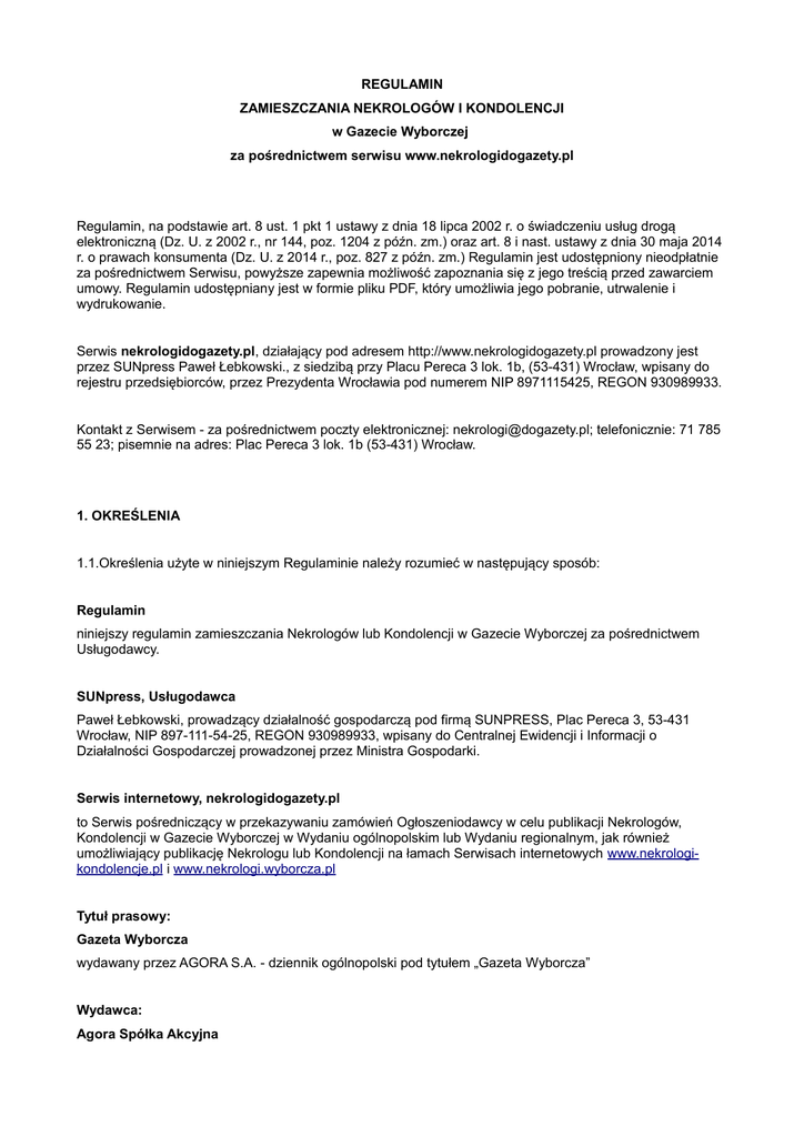 REGULAMIN ZAMIESZCZANIA NEKROLOGÓW I KONDOLENCJI w Gazecie Wyborczej za pośrednictwem serwisu www.nekrologidogazety.pl Regulamin, na podstawie art. 8 ust. 1 pkt 1 ustawy z dnia 18 lipca 2002 r. o świadczeniu usług drogą elektroniczną (Dz. U. z 2002 r., nr 144, poz. 1204 z późn. zm.) oraz art. 8 i nast. ustawy z dnia 30 maja 2014 r. o prawach konsumenta (Dz. U. z 2014 r., poz. 827 z późn. zm.) Regulamin jest udostępniony nieodpłatnie za pośrednictwem Serwisu, powyższe zapewnia możliwość zapoznania się z jego treścią przed zawarciem umowy. Regulamin udostępniany jest w formie pliku PDF, który umożliwia jego pobranie, utrwalenie i wydrukowanie. Serwis nekrologidogazety.pl, działający pod adresem http://www.nekrologidogazety.pl prowadzony jest przez SUNpress Paweł Łebkowski., z siedzibą przy Placu Pereca 3 lok. 1b, (53-431) Wrocław, wpisany do rejestru przedsiębiorców, przez Prezydenta Wrocławia pod numerem NIP 8971115425, REGON 930989933. Kontakt z Serwisem - za pośrednictwem poczty elektronicznej: [email protected]; telefonicznie: 71 785 55 23; pisemnie na adres: Plac Pereca 3 lok. 1b (53-431) Wrocław. 1. OKREŚLENIA 1.1.Określenia użyte w niniejszym Regulaminie należy rozumieć w następujący sposób: Regulamin niniejszy regulamin zamieszczania Nekrologów lub Kondolencji w Gazecie Wyborczej za pośrednictwem Usługodawcy. SUNpress, Usługodawca Paweł Łebkowski, prowadzący działalność gospodarczą pod firmą SUNPRESS, Plac Pereca 3, 53-431 Wrocław, NIP 897-111-54-25, REGON 930989933, wpisany do Centralnej Ewidencji i Informacji o Działalności Gospodarczej prowadzonej przez Ministra Gospodarki. Serwis internetowy, nekrologidogazety.pl to Serwis pośredniczący w przekazywaniu zamówień Ogłoszeniodawcy w celu publikacji Nekrologów, Kondolencji w Gazecie Wyborczej w Wydaniu ogólnopolskim lub Wydaniu regionalnym, jak również umożliwiający publikację Nekrologu lub Kondolencji na łamach Serwisach internetowych www.nekrologikondolencje.pl i www.nekrologi.wyborcza.pl Tytuł prasowy: Gazeta Wyborcza wydawany przez AGORA S.A. - dziennik ogólnopolski pod tytułem „Gazeta Wyborcza” Wydawca: Agora Spółka Akcyjna z siedzibą w Warszawie pod adresem ul. Czerska 8/10 (wydawca Gazety Wyborczej), rejestracja: Sąd Rejonowy dla m. st. Warszawy, XIII Wy dział Gospodarczy Krajowego Rejestru Sądowego, rejestr przedsiębiorców nr KRS 59944, NIP 526-030-56-44, kapitał zakładowy 50 937 386 PLN, wpłacony w całości. Ogłoszeniodawca, Klient osoba fizyczna, osoba prawna albo jednostka organizacyjna nie mająca osobowości prawnej, zamawiająca Usługę; Konsument osoba fizyczna dokonująca czynności prawnej (zamawiająca Usługę) niezwiązanej bezpośrednio z jej działalnością gospodarczą lub zawodową Nekrolog zamieszczane zgodnie z Regulaminem ogłoszenie związane ze śmiercią osoby lub rocznicą śmierci. Nekrolog w druku jest zamieszczany w postaci tekstu z typowym wyróżnieniem graficznym lub bez wyróżnienia. Kondolencje wyrazy współczucia przekazywane komuś z powodu śmierci bliskiego, podziękowanie za opiekę, pomoc czy leczenie, połączenie zawiadomienia o śmierci z kondolencjami. Usługa kompleksowa usługa reklamowa, polegająca na zamieszczeniu Nekrologu lub Kondolencji w Gazecie Wyborczej. Przedmiot świadczenia Nekrolog lub Kondolencje umieszczone drukiem w wydaniu papierowym Gazety Wyborczej oraz w wydaniu internetowym na stronach nekrologi-kondolencje.pl i nekrologi.wyborcza.pl 2 strona redakcyjna strona lewa, oznaczona nr 2 w Gazecie Wyborczej, zawierająca artykuły oraz umożliwiająca zamieszczenie Nekrologu lub Kondolencji w Gazecie Wyborczej. Strony redakcyjne pozostałe strony z artykułami, umożliwiająca zamieszczenie Nekrologu lub Kondolencji w Gazecie Wyborczej. Strony z nekrologami strony przeznaczone do publikacji Nekrologów lub Kondolencji w Gazecie Wyborczej. Wydanie ogólnopolskie Nekrolog lub Kondolencje ukazujące się w wydaniu papierowym Gazety Wyborczej na terenie całej Polski Wydanie regionalne Nekrolog lub Kondolencje ukazujące się w wydaniu papierowym Gazety Wyborczej na terenie następujących regionów Polski: Białystok, Bydgoszcz, Częstochowa, Gdańsk, Gorzów Wielkopolski, Katowice, Kielce, Kraków, Lublin, Łódź, Olsztyn, Opole, Płock, Poznań, Radom, Rzeszów, Szczecin, Warszawa, Wrocław, Zielona Góra. Nekrologi-Kondolencje.pl Serwis Internetowy prowadzony przez SUNpress, publikujący Nekrologi i Kondolencje zamówione do publikacji w Gazecie Wyborczej poprzez serwis nekrologidogazety.pl oraz inne serwisy Usługodawcy. Nekrologi.wyborcza.pl Serwis Internetowy Wydawcy AGORA S.A. publikujący Nekrologi, Kondolencje, Wspomnienia zamieszczone drukiem w Gazecie Wyborczej. Świadczenie usługi drogą elektroniczną wykonanie usługi, które następuje przez wysyłanie i odbieranie danych za pomocą systemów teleinformatycznych, na indywidualne żądanie Ogłoszeniodawcy, bez jednoczesnej obecności stron, przy czym dane te są transmitowane za pośrednictwem sieci publicznych w rozumieniu ustawy Prawo telekomunikacyjne. Środki komunikacji elektronicznej rozwiązania techniczne, w tym urządzenia teleinformatyczne i współpracujące z nimi narzędzia programowe, umożliwiające indywidualne porozumiewanie się na odległość przy wykorzystaniu transmisji danych między systemami teleinformatycznymi, a w szczególności poczta elektroniczna. Ciasteczka pliki tekstowe, w których serwery Serwisu Usługodawcy zapisują informacje na dysku twardym komputera, z którego korzysta Użytkownik. Informacje zapisane w pliku ciasteczek” serwer Serwisu może odczytać przy ponownym połączeniu się z tego komputera, lecz mogą być one odczytane również przez inne serwery lub innych użytkowników Internetu. Adres IP indywidualny numer, który z reguły posiada każdy komputer podłączony do jakiejkolwiek sieci komputerowej. Numer IP może być stały dla danego komputera (statyczn