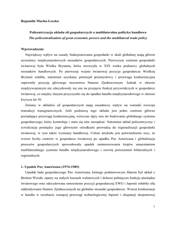 Bogumiła Mucha-Leszko Policentryzacja układu sił gospodarczych a multilateralna polityka handlowa The policentralisation of great economic powers and the multilateral trade policy Wprowadzenie Największy wpływ na zasady funkcjonowania gospodarki w skali globalnej mają główni uczestnicy międzynarodowych stosunków gospodarczych. Pierwszym centrum gospodarki światowej była Wielka Brytania, która stworzyła w XIX wieku podstawy globalnych stosunków handlowych. Po pierwszej wojnie światowej pozycja gospodarcza Wielkiej Brytanii osłabła, natomiast uzyskany potencjał przemysłowy i przewaga konkurencyjna zapewniły pozycję głównego mocarstwa Stanom Zjednoczonym. Jednak w okresie międzywojennym nie zdecydowały się one na przejęcie funkcji przywódczych w gospodarce światowej, co między innymi przyczyniło się do upadku handlu międzynarodowego w okresie kryzysu lat 30. Zmiany w układzie sił gospodarczych mają zasadniczy wpływ na warunki rozwoju transakcji transgranicznych. Jeśli podstawą tego układu jest jedno centrum główne posiadające przewagę konkurencyjną, wówczas dąży ono do budowania globalnego systemu gospodarczego, który kontroluje i stara się nim zarządzać. Natomiast układ policentryczny i rywalizacja pomiędzy jego głównymi ośrodkami prowadzą do regionalizacji gospodarki światowej, w tym także wymiany handlowej. Celem artykułu jest potwierdzenie tezy, że wzrost liczby centrów w gospodarce światowej po upadku Pax Americana i globalizacja procesów gospodarczych spowodowały spadek zainteresowania krajów umacnianiem multilateralnego systemu handlu międzynarodowego i rozwój porozumień bilateralnych i regionalnych. 1. Upadek Pax Americana (1974-1985) Upadek ładu gospodarczego Pax Americana, którego podstawowym filarem był układ z Bretton Woods, oparty na stałych kursach walutowych i dolarze pełniącym funkcje pieniądza światowego oraz zdecydowane umocnienie pozycji gospodarczej EWG i Japonii osłabiły siłę oddziaływania Stanów Zjednoczonych na globalne stosunki gospodarcze. Wzrost konkurencji w handlu w rezultacie rosnącej przewagi technologicznej Japonii i ekspansji eksportowej 1 RFN, a także rosnącego eksportu z nowo uprzemysłowionych krajów azjatyckich i Ameryki Łacińskiej, zasadniczo zmieniły pozycję USA na rynku światowym. Podstawą konkurencyjności krajów azjatyckich oraz Brazylii i Meksyku były niższe koszty produkcji (zwłaszcza niższe płace) i wprowadzanie nowych technologii, które finansowano z kredytów rządowych zaciąganych w dużych międzynarodowych bankach. Wzrost możliwości eksportowych krajów rozwijających się był także w dużym stopniu rezultatem napływu zagranicznych inwestycji bezpośrednich i rozwoju produkcji przeznaczonej do sprzedaży na innych rynkach. Zagraniczne inwestycje bezpośrednie przyczyniały się do umiędzynarodowienia produkcji i pogłębiania specjalizacji. Nowym zjawiskiem i ważną tendencją w handlu był rozwój wymiany wewnątrzgałęziowej, czyli jednoczesny eksport i import przez dany kraj produktów tej samej gałęzi przemysłu. Wzrost aktywności inwestycyjnej korporacji japońskich i europejskich od lat 80. oraz decentralizacja produkcji poprzez dzielenie procesu produkcyjnego na wiele faz i przestrzenne ich rozproszenie na świecie przyśpieszyły rozwój specjalizacji i wymiany wewnątrz sieci korporacyjnych. Zasadnicze osłabienie przewagi konkurencyjnej Stanów Zjednoczonych wskutek spadku tempa wzrostu wydajności pracy od 1965 roku i utraty przywództwa technologicznego w latach 70. oraz zmiana układu sił gospodarczych wpłynęły na podejmowanie działań w celu ograniczania importu. Wprawdzie oficjalnie popierały one ideę wolnego handlu, ale w praktyce przyczyniły się do powrotu do protekcjonizmu, który w latach 70. polegał przede wszystkim na stosowaniu instrumentów pozataryfowych. Stany Zjednoczone wprowadziły nową ustawę – Trade Act of 1974, która na podstawie Klauzuli 301 (Section 301) dawała możliwość domagania się od partnerów handlowych dobrowolnych ograniczeń eksportu (voluntary export restraints-VERs). Klauzula 301 miała być stosowana wobec tych partnerów handlowych, którzy prowadzili nieuczciwą konkurencję. Natomiast w rzeczywistości została wykorzystana do ochrony rynku i określania tzw. dobrowolnych ograniczeń eksportu dla japońskich producentów stali i samochodów.1 Spadek dominacji Stanów Zjednoczonych w stosunkach globalnych spowodował, że były coraz mniej zainteresowane rozwojem multilateralnej polityki handlowej, podczas gdy do lat. 70. popierały wielostronną liberalizację handlu i konsekwentnie hamowały rozwój integracji regionalnej w Ameryce Łacińskiej i w Azji. 1 B. Mucha-Leszko, Rozwój powiązań w gospodarce światowej – etapy globalizacji i regionalizacja procesów gospodarczych [w:] B. Mucha-Leszko (red.) Współczesna gospodarka światowa. Główne centra gospodarcze, Wyd. UMCS, Lublin 2005, s. 57. 2 Europejska Wspólnota Gospodarcza rozszerzając swój rynek wewnętrzny, prowadząc wspólną politykę handlową (zewnętrzną), podpisując umowy handlowe i występując jako strona w negocjacjach na forum GATT zwiększała swoją siłę oddziaływania na międzynarodowe stosunki handlowe. Zewnętrzna polityka handlowa Unii obejmuje stosunki bilateralne, interregionalne i multilateralne (WTO). Jednak priorytetowym celem polityki handlowej, wcześniej EWG a następnie UE, pozostaje dalsze umacnianie wpływów na rynku globalnym. Pod koniec lat 70. Europa Zachodnia uzyskała już zdecydowaną przewagę w światowym eksporcie z udziałem około 40%, a udział Stanów Zjednoczonych spadł do 9,7%.2 Dowodem spadku konkurencyjności eksportu USA był zmniejszający się udział w światowym rynku produktów wysokich technologii z 30% w roku 1970 do 21% w roku 1989, a w tym samym czasie udział Japonii wzrósł z 7% do 16%.3 Pozycja Stanów Zjednoczonych w handlu międz