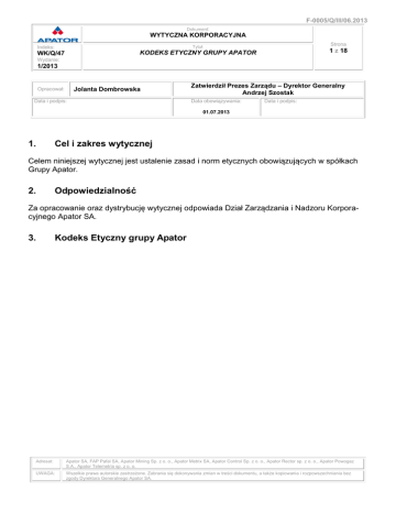 F-0005/Q/III/06.2013 Dokument: WYTYCZNA KORPORACYJNA Strona Tytuł: Indeks: 1 z 18 KODEKS ETYCZNY GRUPY APATOR WK/Q/47 Wydanie: 1/2013 Jolanta Dombrowska Opracował: Data i podpis: Zatwierdził Prezes Zarządu – Dyrektor Generalny Andrzej Szostak Data obowiązywania: Data i podpis: 01.07.2013 1. Cel i zakres wytycznej Celem niniejszej wytycznej jest ustalenie zasad i norm etycznych obowiązujących w spółkach Grupy Apator. 2. Odpowiedzialność Za opracowanie oraz dystrybucję wytycznej odpowiada Dział Zarządzania i Nadzoru Korporacyjnego Apator SA. 3. Kodeks Etyczny grupy Apator Adresat: Apator SA, FAP Pafal SA, Apator Mining Sp. z o. o., Apator Metrix SA, Apator Control Sp. z o. o., Apator Rector sp. z o. o., Apator Powogaz S.A., Apator Telemetria sp. z o. o. UWAGA: Wszelkie prawa autorskie zastrzeżone. Zabrania się dokonywania zmian w treści dokumentu, a także kopiowania i rozpowszechniania bez zgody Dyrektora Generalnego Apator SA. F-0005/Q/III/06.2013 Dokument: WYTYCZNA KORPORACYJNA Tytuł: Indeks: KODEKS ETYCZNY GRUPY APATOR WK/Q/47 Strona 2 z 18 Wydanie: 1/2013 Spis treści Kodeksu Etycznego grupy Apator 1. CEL I ZAKRES WYTYCZNEJ ........................................................................................................................................ 1 2. ODPOWIEDZIALNOŚĆ ................................................................................................................................................... 1 3. KODEKS ETYCZNY GRUPY APATOR ........................................................................................................................ 1 WSTĘP.......................................................................................................................................................................................... 3 1. MISJA I WARTOŚCI GRUPY APATOR ....................................................................................................................... 3 1.1 1.2 2. MISJA ............................................................................................................................................................................... 3 KLUCZOWE WARTOŚCI...................................................................................................................................................... 3 ZASADY OGÓLNE ........................................................................................................................................................... 4 2.1 PRAWO I STANDARDY POSTĘPOWANIA .............................................................................................................................. 4 2.1.1 Zasady Ładu Korporacyjnego ............................................................................................................................... 4 2.1.2 Społeczna Odpowiedzialność Biznesu ................................................................................................................... 4 2.2 ETYKA BIZNESU ................................................................................................................................................................ 4 3. RELACJE WEWNĄTRZ FIRMY.................................................................................................................................... 5 3.1 PRACOWNICY.................................................................................................................................................................... 5 3.1.1 Zasady polityki personalnej ................................................................................................................................... 5 3.1.1.1 3.1.1.2 3.1.1.3 3.1.1.4 3.1.2 3.1.3 3.1.4 Godne i bezpieczne warunki pracy ........................................................................................................................ 6 Równość szans i wzajemne poszanowanie ............................................................................................................ 7 Sytuacje problemowe ............................................................................................................................................. 8 3.1.4.1 3.1.4.2 3.1.4.3 3.1.4.4 3.1.5 4. BEZPIECZEŃSTWO INFORMACJI ....................................................................................................................................... 11 WŁASNOŚĆ INTELEKTUALNA .......................................................................................................................................... 12 KLIENCI .......................................................................................................................................................................... 12 DOSTAWCY I PARTNERZY ............................................................................................................................................... 13 RELACJE Z OTOCZENIEM ......................................................................................................................................... 14 6.1 6.2 7. AKCJONARIUSZE ............................................................................................................................................................. 10 FIRMA I JEJ PARTNERZY ........................................................................................................................................... 12 5.1 5.2 6. Zachowanie po pracy ....................................................................................................................................................... 10 Wygląd pracownika ......................................................................................................................................................... 10 POLITYKA BEZPIECZEŃSTWA INFORMACJI I MIENIA INTELEKTUALNEGO ......................................... 11 4.1 4.2 5. Działalność konkurencyjna ..............................