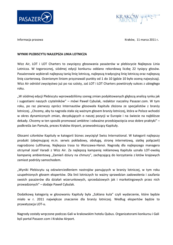 Informacja prasowa Kraków, 11 marca 2011 r. WYNIKI PLEBISCYTU NAJLEPSZA LINIA LOTNICZA Wizz Air, LOT i LOT Charters to zwycięzcy głosowania pasażerów w plebiscycie Najlepsza Linia Lotnicza. W tegorocznej, siódmej edycji konkursu oddano rekordową liczbę 22 tysięcy głosów. Pasażerowie wybierali najlepszą tanią linię lotniczą, najlepszą tradycyjną linię lotniczą oraz najlepszą linię czarterową. Ocenionym liniom przyznawali punkty od 1 do 10 (gdzie 10 było oceną najwyższą). Wizz Air odniósł zwycięstwo już po raz szósty, zaś LOT i LOT Charters powtórzyły sukces z ubiegłego roku. „W siódmej edycji Plebiscytu wprowadziliśmy szereg zmian podyktowanych głębszą analizą rynku jak i sugestiami naszych czytelników” – mówi Paweł Cybulak, redaktor naczelny Pasazer.com. W tym roku, po raz pierwszy oprócz Internautów głosowała Kapituła złożona ze specjalistów z branży lotniczej. „Chcemy, aby ta nagroda stała się ważnym głosem branży lotniczej, która w Polsce wchodzi w okres dynamicznych zmian, decydujących o naszej pozycji w Europie i na świecie na najbliższe dekady. Chcemy w ten sposób promowad ambitne i odważne przedsięwzięcia oraz dobre praktyki” – podkreśla Jan Pamuła, prezes Kraków Airport, przewodniczący Kapituły. Głosami członków Kapituły w kategorii biznes zwyciężył Swiss International. W kategorii najlepszy produkt (obejmującej m.in. serwis pokładowy, obsługę, stronę internetową, siatkę połączeo) nagrodzono Lufthansę. Najlepsza trasa to Warszawa-Hanoi. Nagrodę dla najlepszego managera otrzymał Jozef Varadi z Wizz Air. Za najlepszą kampanię reklamową Kapituła uznała LOT-owską kampanię ambientową „Zamieo dziury na chmury”, zachęcającą do korzystania z lotów krajowych zamiast podróży samochodem. „Wyniki Plebiscytu są odzwierciedleniem nastrojów panujących w branży lotniczej, w tym roku uzupełnionych głosem ekspertów. Dla linii lotniczych to ważny sprawdzian zadowolenia i zaufania swoich pasażerów dla działao wizerunkowych, sprzedażowych jak i marketingowych przez nich prowadzonych” – dodaje Paweł Cybulak. Dodatkową kategorią w głosowaniu Kapituły była „Szklana kula” czyli wydarzenie, które będzie miało w r. 2011 największe znaczenie dla branży lotniczej. Według ekspertów będzie to prywatyzacja LOT-u. Nagrody zostały wręczone podczas Gali w krakowskim hotelu Qubus. Organizatorami konkursu i Gali byli portal Pasazer.com i Kraków Airport.