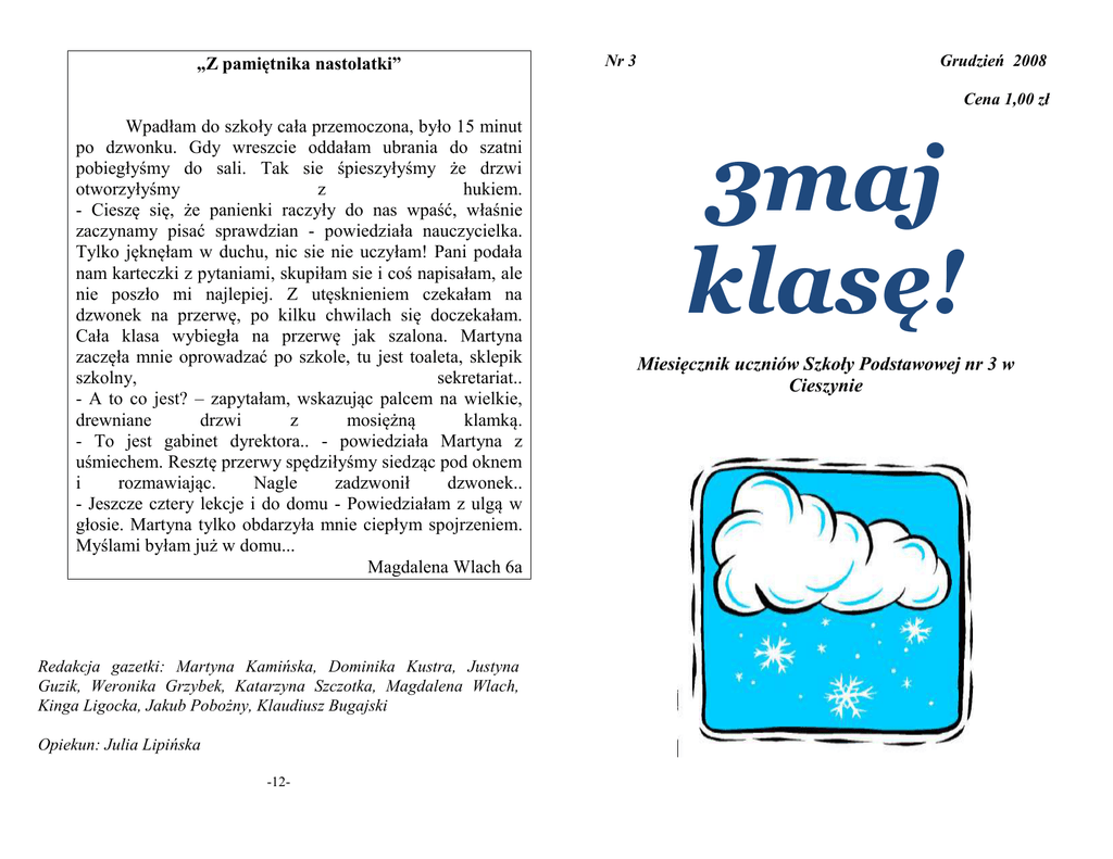 „Z pamiętnika nastolatki” Nr 3 Grudzień 2008 Cena 1,00 zł Wpadłam do szkoły cała przemoczona, było 15 minut po dzwonku. Gdy wreszcie oddałam ubrania do szatni pobiegłyśmy do sali. Tak sie śpieszyłyśmy że drzwi otworzyłyśmy z hukiem. - Cieszę się, że panienki raczyły do nas wpaść, właśnie zaczynamy pisać sprawdzian - powiedziała nauczycielka. Tylko jęknęłam w duchu, nic sie nie uczyłam! Pani podała nam karteczki z pytaniami, skupiłam sie i coś napisałam, ale nie poszło mi najlepiej. Z utęsknieniem czekałam na dzwonek na przerwę, po kilku chwilach się doczekałam. Cała klasa wybiegła na przerwę jak szalona. Martyna zaczęła mnie oprowadzać po szkole, tu jest toaleta, sklepik szkolny, sekretariat.. - A to co jest? – zapytałam, wskazując palcem na wielkie, drewniane drzwi z mosiężną klamką. - To jest gabinet dyrektora.. - powiedziała Martyna z uśmiechem. Resztę przerwy spędziłyśmy siedząc pod oknem i rozmawiając. Nagle zadzwonił dzwonek.. - Jeszcze cztery lekcje i do domu - Powiedziałam z ulgą w głosie. Martyna tylko obdarzyła mnie ciepłym spojrzeniem. Myślami byłam już w domu... Magdalena Wlach 6a Redakcja gazetki: Martyna Kamińska, Dominika Kustra, Justyna Guzik, Weronika Grzybek, Katarzyna Szczotka, Magdalena Wlach, Kinga Ligocka, Jakub Pobożny, Klaudiusz Bugajski Opiekun: Julia Lipińska -12- 3maj klasę! Miesięcznik uczniów Szkoły Podstawowej nr 3 w Cieszynie 1. 2. 3. 4. W dniach 15-16 listopada reprezentacja naszej szkoły pojechała na zawody sportowe do Budapesztu. W jej skład weszli: Zachariasz Stawowiak 4b, Michał Cieślar, Mateusz Wilczak, Krzysztof Śliwka 6a, Julia Gorczańska, Mateusz Węglorz, Michał Żwak, Mirek Nowak 6c, Karolina Brudny, Dominika Kozyra, Jakub Burda, Krystian Płoskonka 6d. Nasi koledzy i koleżanki powrócili z niemałymi sukcesami! W piłce nożnej zajęli 1. miejsce, w hokeju 2. miejsce, a w koszykówce 3. miejsce. Serdecznie gratulujemy, a na łamach gazetki zamieszczamy dwa wywiady z naszymi sportowcami. 23 listopada odbyły się w hali sportowej na ul. Błogockiej zawody siatkówki. Reprezentacja naszej szkoły, w skład której weszli: Piotr Holona 5c, Jacek Heczko 5d, Michał Cieślar, Krzysztof Śliwka, Mateusz Wilczak 6a, Daniel Glajc 6b, Michał Żwak, Mirek Nowak, Mateusz Węglorz, Michał Szewczyk 6c, zajęła 1. miejsce! Gratulujemy! 5. 6. 7. 8. 9. 10 1. Inaczej upominek. 2. Przystraja się ją na święta. 3. Są przy saniach Mikołaja. (zdrobniale) 4. Ciągną sanie Mikołaja. 5. Zjeżdżamy na nich po śniegu. (zdrobniale) 6. Pieczemy je na święta. (zdrobniale) 7. Ubieramy je w ziemie na głowę. (zdrobniale) 8. Mikołaj daje ją niegrzecznym dzieciom. 9. Zwykle krągłe, wieszamy je na choince. 10. Tam mieszka Mikołaj. D. Kustra, M. Kamińska, K. Bugajski 4c Z wielką przyjemnością informujemy, że nasza redakcyjna koleżanka – Katarzyna Szczotka (6a) – oraz dwoje uczniów klasy 6c: Julia Gorczańska i Dawid Sikora, zakwalifikowali się do następnego etapu konkursu interdyscyplinarnego, zdobywając kolejno 37 i 39 punktów. Gratulujemy i trzymamy kciuki za dalsze dobre wyniki! -2- Hasło ……………………………………………… Imię i nazwisko ………………………………..kl………. Wycięty kupon wraz z hasłem prosimy zanieść do biblioteki szkolnej. Powodzenia! -11- Ze szkolnych zeszytów Prostokąt różni się od kwadratu tym, że raz jest wyższy, a raz szerszy. Grzyby składają się z kapelusza, trzona i robaków. Matejko malował pod Grunwaldem. W dniu święta wiosny szliśmy nad rzekę wesołym konduktem. Na początku grudnia odbył się w naszej szkole pierwszy etap konkursu historycznego, zorganizowany przez panie Renatę Glajcar i Krystynę Brudny. Do finału zakwalifikowało się 5 drużyn, które zdobyły największą ilość punktów na 33 możliwe. Są to następujące ekipy: 5d: Ola Cygoń, Justyna Guzik, Anna Hatalak (31,5pkt), 6a: Szymon Krzak, Krzysztof Kula, Kamil Nowakowski (31 pkt), 6b: Ewa Widnic, Daniel Glajc, Jakub Kręcisz (30 pkt), 5d: Agnieszka Cymorek, Dawid Piłat, Łukasz Suwaj (30 pkt) oraz 6a: Paulina Grabelus, Ania Jarosz, Wojtek Hliśnikowski (28,5 pkt). Finał miał miejsce 15 grudnia, gdy nasza gazetka została oddana do druku, dlatego ostateczne wyniki zamieścimy na łamach następnego numeru. 11 grudnia w Miejskim Ośrodku Sportu i Rekreacji odbyły się zawody koszykówki dziewcząt. Naszą szkołę reprezentowały: Oliwia Ligocka 5b, Justyna Żyła, Anna Śliwka, Patrycja Haltof, Natalia Marek 5c, Justyna Guzik, Ola Cygoń, Patrycja Czernek 5d, Paulina Dudys i Ewa Widnic 6b. Żeby roślina dobrze rosła, ziemia musi być wzruszona. Pierwszy człowiek na ziemi nie czuł się samotny, bo nie umiał liczyć. Krowa to zwierzę roślinobójcze. -10- -3- Wywiady z Dominiką Kozyrą i Mateuszem Wilczakiem – reprezentantami naszej szkoły na zawodach w Budapeszcie Gdy się święta już zbliżają, dzieci chętnie choinkę przystrajają: w bańki, łańcuchy różnorodne, by prezenty dostać dorodne. Wyczekując pierwszej gwiazdki, patrzą przez okno na śnieżne obrazki. A gdy gwiazdka już zabłyśnie niech ośćmi z karpia się nikt nie zachłyśnie! Weronika: Hej Dominika! Jest mi bardzo miło, że zgodziłaś się na wywiad! Dominika: Mnie również jest bardzo miło. Weronika: Chciałabym ci zadać kilka pytań, związanych z wyjazdem do Budapesztu. Najważniejsze – jakie były dyscypliny sportowe? Dominika: Wyjazd był bardzo udany i w ogóle świetnie się tam bawiliśmy. Dyscypliny były trzy: koszykówka, hokej i piłka halowa. Weronika: Rozumiem. Dziewczyny zdobyły drugie miejsce. Było łatwo, czy musiałyście się postarać? Dominika: Hmmm…Dziewczyny brały udział tylko w jednej dyscyplinie – grałyśmy w koszykówkę. Owszem, rywalizacja była bardzo zacięta, bo pierwszymi naszymi przeciwniczkami były Węgierki, a one bardzo dobrze grają w koszykówkę. Mecz ni