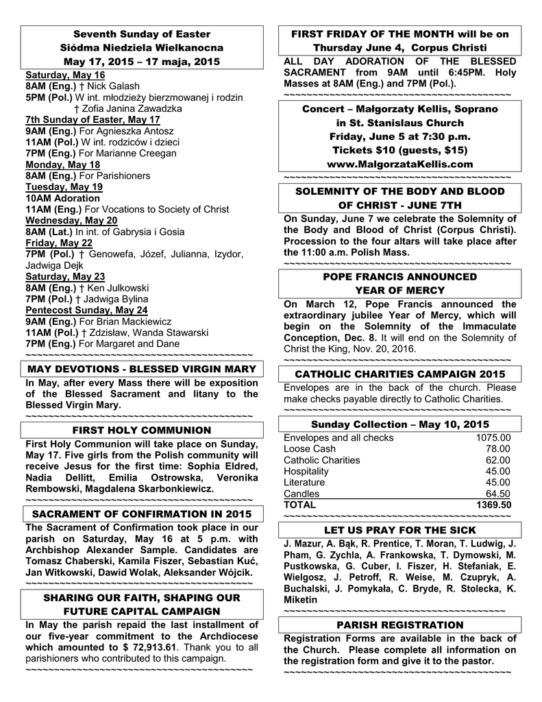 Seventh Sunday of Easter Siódma Niedziela Wielkanocna May 17, 2015 – 17 maja, 2015 Saturday, May 16 8AM (Eng.) † Nick Galash 5PM (Pol.) W int. młodzieży bierzmowanej i rodzin † Zofia Janina Zawadzka 7th Sunday of Easter, May 17 9AM (Eng.) For Agnieszka Antosz 11AM (Pol.) W int. rodziców i dzieci 7PM (Eng.) For Marianne Creegan Monday, May 18 8AM (Eng.) For Parishioners Tuesday, May 19 10AM Adoration 11AM (Eng.) For Vocations to Society of Christ Wednesday, May 20 8AM (Lat.) In int. of Gabrysia i Gosia Friday, May 22 7PM (Pol.) † Genowefa, Józef, Julianna, Izydor, Jadwiga Dejk Saturday, May 23 8AM (Eng.) † Ken Julkowski 7PM (Pol.) † Jadwiga Bylina Pentecost Sunday, May 24 9AM (Eng.) For Brian Mackiewicz 11AM (Pol.) † Zdzisław, Wanda Stawarski 7PM (Eng.) For Margaret and Dane ~~~~~~~~~~~~~~~~~~~~~~~~~~~~~~~~~~~~~~~~ MAY DEVOTIONS - BLESSED VIRGIN MARY In May, after every Mass there will be exposition of the Blessed Sacrament and litany to the Blessed Virgin Mary. ~~~~~~~~~~~~~~~~~~~~~~~~~~~~~~~~~~~~~~~~ FIRST HOLY COMMUNION First Holy Communion will take place on Sunday, May 17. Five girls from the Polish community will receive Jesus for the first time: Sophia Eldred, Nadia Dellitt, Emilia Ostrowska, Veronika Rembowski, Magdalena Skarbonkiewicz. ~~~~~~~~~~~~~~~~~~~~~~~~~~~~~~~~~~~~~~~~ SACRAMENT OF CONFIRMATION IN 2015 The Sacrament of Confirmation took place in our parish on Saturday, May 16 at 5 p.m. with Archbishop Alexander Sample. Candidates are Tomasz Chaberski, Kamila Fiszer, Sebastian Kuć, Jan Witkowski, Dawid Wolak, Aleksander Wójcik. ~~~~~~~~~~~~~~~~~~~~~~~~~~~~~~~~~~~~~~~~ SHARING OUR FAITH, SHAPING OUR FUTURE CAPITAL CAMPAIGN In May the parish repaid the last installment of our five-year commitment to the Archdiocese which amounted to $ 72,913.61. Thank you to all parishioners who contributed to this campaign. ~~~~~~~~~~~~~~~~~~~~~~~~~~~~~~~~~~~~~~~~ FIRST FRIDAY OF THE MONTH will be on Thursday June 4, Corpus Christi ALL DAY ADORATION OF THE BLESSED SACRAMENT from 9AM until 6:45PM. Holy Masses at 8AM (Eng.) and 7PM (Pol.). ~~~~~~~~~~~~~~~~~~~~~~~~~~~~~~~~~~~~~~~~ Concert – Małgorzaty Kellis, Soprano in St. Stanislaus Church Friday, June 5 at 7:30 p.m. Tickets $10 (guests, $15) www.MalgorzataKellis.com ~~~~~~~~~~~~~~~~~~~~~~~~~~~~~~~~~~~~~~~~ SOLEMNITY OF THE BODY AND BLOOD OF CHRIST - JUNE 7TH On Sunday, June 7 we celebrate the Solemnity of the Body and Blood of Christ (Corpus Christi). Procession to the four altars will take place after the 11:00 a.m. Polish Mass. ~~~~~~~~~~~~~~~~~~~~~~~~~~~~~~~~~~~~~~~~ POPE FRANCIS ANNOUNCED YEAR OF MERCY On March 12, Pope Francis announced the extraordinary jubilee Year of Mercy, which will begin on the Solemnity of the Immaculate Conception, Dec. 8. It will end on the Solemnity of Christ the King, Nov. 20, 2016. ~~~~~~~~~~~~~~~~~~~~~~~~~~~~~~~~~~~~~~~~ CATHOLIC CHARITIES CAMPAIGN 2015 Envelopes are in the back of the church. Please make checks payable directly to Catholic Charities. ~~~~~~~~~~~~~~~~~~~~~~~~~~~~~~~~~~~~~~~~ Sunday Collection – May 10, 2015 Envelopes and all checks 1075.00 Loose Cash 78.00 Catholic Charities 62.00 Hospitality 45.00 Literature 45.00 Candles 64.50 TOTAL 1369.50 ~~~~~~~~~~~~~~~~~~~~~~~~~~~~~~~~~~~~~~~~ LET US PRAY FOR THE SICK J. Mazur, A. Bąk, R. Prentice, T. Moran, T. Ludwig, J. Pham, G. Zychla, A. Frankowska, T. Dymowski, M. Pustkowska, G. Cuber, I. Fiszer, H. Stefaniak, E. Wielgosz, J. Petroff, R. Weise, M. Czupryk, A. Buchalski, J. Pomykała, C. Bryde, R. Stolecka, K. Miketin ~~~~~~~~~~~~~~~~~~~~~~~~~~~~~~~~~~~~~~~ PARISH REGISTRATION Registration Forms are available in the back of the Church. Please complete all information on the registration form and give it to the pastor. ~~~~~~~~~~~~~~~~~~~~~~~~~~~~~~~~~~~~~~~~ NABOŻEŃSTWA MAJOWE Przez miesiąc maj, po każdej Mszy św. Wystawienie Najśw. Sakramentu i litania Loretańska do N.M.P. Pierwsza majówka w Grotto 2 maja godz. 17:00 a ostatnie nabożeństwo majowe w niedzielę 31 maja w Grotto o godz. 17:00. ~~~~~~~~~~~~~~~~~~~~~~~~~~~~~~~~~~~~~~~~ WNIEBOWSTĄPIENIE PAŃSKIE - 17 maja Ludzie postrzegają niebo najczęściej w kategoriach doczesnych, jako pragnienie dobra, jako synonim szczęścia, radości, zdrowia, zadowolenia, satysfakcji – „niebo tu na ziemi”. „Życzę ci, abyś był w niebie”. Czego najczęściej komuś życzymy? Na pierwszym miejscu zapewnie zdrowia. Jakże często słyszymy powiedzenie, że jak zdrowie będzie, to wszystko będzie.... i szczęście, i uśmiech, zadowolenie i nawet pieniądze się znajdą. Życzymy innym tego, czego nam brakuje. Postępujemy tak zapewnie w wyniku działania naszej podświadomości. Takie życzenia składamy z okazji urodzin, imienin, jubileuszy. Ciekawe, czy ktoś z nas usłyszał kiedykolwiek takie słowa: „Życzę ci, byś kiedyś był w niebie”? Wielu ludzi czeka na niebo tu na ziemi, nawet ci, którzy w niebo nie wierzą. ~~~~~~~~~~~~~~~~~~~~~~~~~~~~~~~~~~~~~~~~ PIERWSZA KOMUNIA ŚWIĘTA – 17 maja Pięć dziewczynek: Sophia Eldred, Nadia Dellitt, Emilia Ostrowska, Veronika Rembowski, Magdalena Skarbonkiewicz otrzymją Pierwszą Komunię w naszej parafii w niedzielę 17 maja w czasie Mszy św. o godz. 11:00. W białym tygodniu dzieci i rodzice przychodzą do kościoła w poniedziałek i środę o godz. 19:30, a w piątek o 19:00. Polecamy waszym modlitwom rodziców i dzieci. ~~~~~~~~~~~~~~~~~~~~~~~~~~~~~~~~~~~~~~~~ SAKRAMENT BIERZMOWANIA - 16 maja Sakramentu Bierzmowania udzielił Arcybiskup Alexander Sample w sobotę, 16 maja 2015 o godz. 17:00 w naszej parafii. Kandydaci: Tomasz Chaberski, Kamila Fiszer, Sebastian Kuć, Jan Witkowski, Dawid Wolak, Aleksander Wójcik. ~~~~~~~~~~~~~~~~~~~~~~~~~~~~~~~~~~~~~~ SHARING OUR FAITH, SHAPING OUR FUTURE CAPITAL CAMPAIGN W maju spłaciliśmy ostanią ratę naszego pięcioletniego zobowiązania wobec Archidiecezji które wynosiło $72,913.61. Dziękujemy wszystkim parafianom za ofiary składane na tacę. ~~~~~~~~~