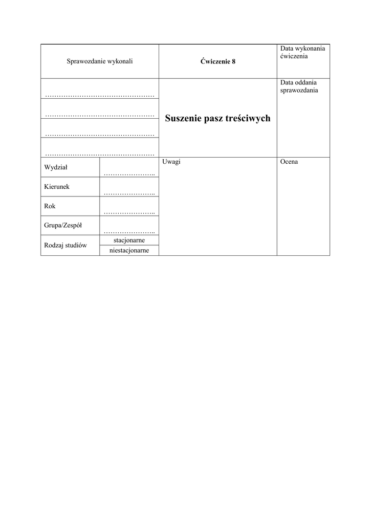 Ćwiczenie 8 Sprawozdanie wykonali Data oddania sprawozdania ………………………………………… ………………………………………… Data wykonania ćwiczenia Suszenie pasz treściwych ………………………………………… ………………………………………… Wydział Kierunek Rok Grupa/Zespół Rodzaj studiów Uwagi ………………….. ………………….. ………………….. ………………….. stacjonarne niestacjonarne Ocena 1. Cel ćwiczenia Celem ćwiczenia jest zbadanie procesu suszenia przy utrzymaniu stałej temperatury oraz stałego natężenia przepływu czynnika suszącego. 2. Przebieg ćwiczenia 1. określić masę dwóch naczynek, 2. odważyć do dwóch naczynek po 5g rozdrobnionych nasion (z dokładnością do 0,001g) 3. dwie przygotowane próbki rozdrobnionych nasion wstawić do suszarki na okres 1 godziny w celu określenia wilgotności początkowej 4. po zakończeniu suszenia naczynka przykryć i wstawić do eksykatora celem ostudzenia 5. ostudzone naczynka zwarzyć z dokładnością do 0,001g 6. wyniki zapisać w tabeli 1 7. w tym samym czasie przystąpić do określenia zmian zawartości wilgoci w materiale suszonym 8. w tym celu należy odważyć 20g nierozdrobnionego ziarna 9. tak przygotowaną próbkę należy umieścić w wago-suszarce 10. proces suszenia prowadzić do uzyskania stałej masy 11. w trakcie procesu suszenia dokonywać pomiarów ubytków masy próbki w odstępach 3 min. 12. wyniki zanotować w tabeli 2 Na podstawie uzyskanych wyników dokonać niezbędnych obliczeń oraz sporządzić wykresy: krzywej suszenia ui f (t ) zredukowanej zawartości wody w funkcji czasu U i f (t ) dui ' f (ui ) d Wykresy wykonać na papierze milimetrowym i dołączyć do sprawozdania. krzywej szybkości suszenia w funkcji zawartości wody 2/9 Tab. 1 Wyniki pomiarów i obliczeń oznaczenia wilgotności początkowej. Oznaczenia: a - masa naczynka, b - masa naczynka z próbką przed wysuszeniem, c - masa naczynka z próbką po wysuszeniu, Wn - wilgotność nasion Powtórzenie a g Nr naczynka b g c g Wn % Wn % I II Różnica wilgotności Tab. 2 Wyniki pomiarów i obliczeń określenia zmian zawartości wilgoci w materiale suszonym. Oznaczenia: t - czas suszenia, Mi - masa próbki, ΔMi - ubytek masy, Wn - wilgotność nasion, Mwi - masa wody w próbce, ui - zawartość wody w próbce po obliczeniu, Ui - zredukowana zawartość wody, dui'/dΘ - szybkość suszenia u0 -początkowa zawartość wilgoci w próbce, Sm - zawartość suchej masy L.p t . min 1. 0 2. 3 3. 6 4. 9 5. 12 6. 15 7. 18 8. 21 9. 24 10. 27 11. 30 12. 33 13. 36 14. 39 15. 42 16. 45 17. 48 18. 51 19. 54 20. 57 21. 60 Mi g ΔMi g Mwi g u0 g Sm g ui g/g ui' g/g Ui - dui'/dt - 3/9 3. Obliczenia i przykłady obliczeń Obliczenie wilgotności Wn bc 100[%] ba ....................................................................................................................................................... ....................................................................................................................................................... Początkowa zawartość wilgoci u0 g Wn 100 Wn g ....................................................................................................................................................... ....................................................................................................................................................... masa wody w próbce przed suszeniem M wo M 0 u0 [g] 1 u0 gdzie; M0 - początkowa masa próbki ....................................................................................................................................................... ....................................................................................................................................................... Zawartość suchej masy Sm M 0 M wo[ g ] ....................................................................................................................................................... ....................................................................................................................................................... Zawartość wody w próbce ui M wi g S m g ....................................................................................................................................................... ....................................................................................................................................................... 4/9 Zredukowana zawartość wody Ui ui 'ur u0 u r ....................................................................................................................................................... ....................................................................................................................................................... Szybkość suszenia dui ' ui ' d t gdzie; Δt - odstęp pomiędzy kolejnymi pomiarami ubytku masy (Δt = 3 min) ....................................................................................................................................................... ....................................................................................................................................................... 5/9 Krzywa suszenia ui f (t ) 6/9 Zredukowana zawartość wody w funkcji czasu U i f (t ) 7/9 Krzywa szybkości suszenia w funkcji zawartości wody dui ' f (ui ) d 8/9 4. Podsumowanie i wnioski ....................................................................................................................................................... ....................................................................................................................................................... ...............................................................................................................................................