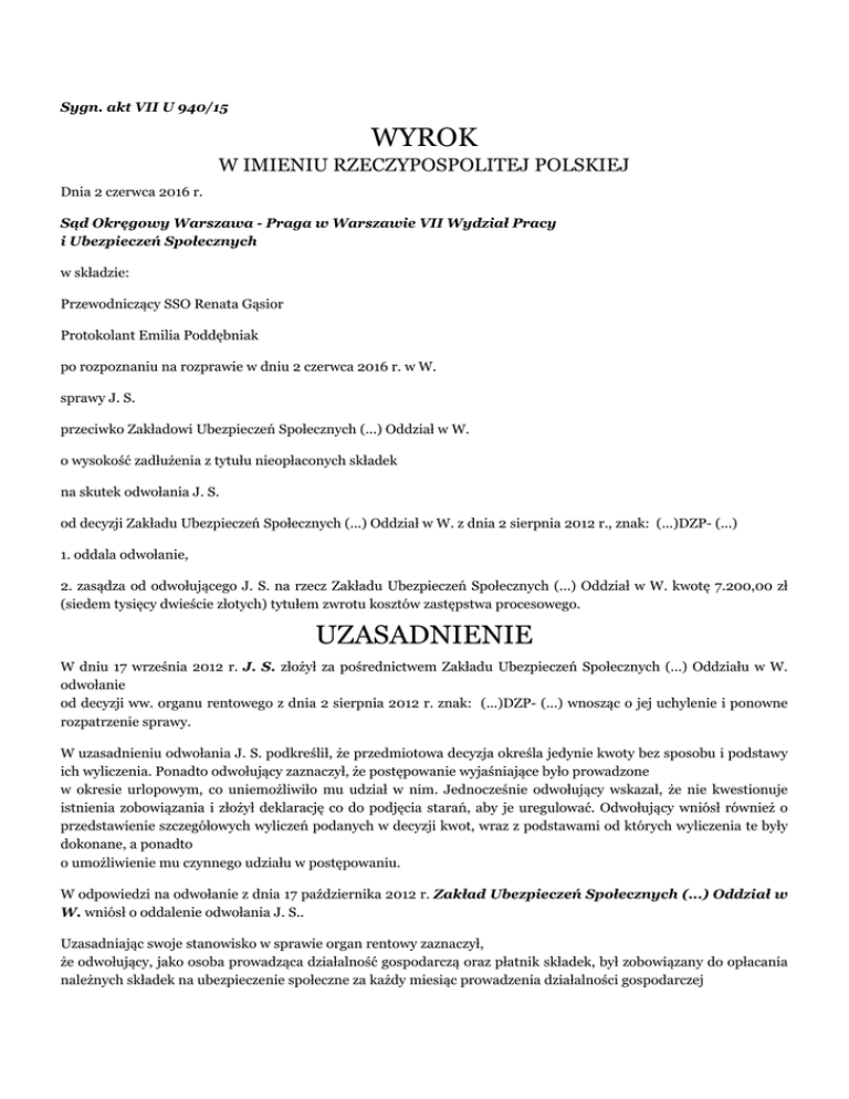 Sygn. akt VII U 940/15 WYROK W IMIENIU RZECZYPOSPOLITEJ POLSKIEJ Dnia 2 czerwca 2016 r. Sąd Okręgowy Warszawa - Praga w Warszawie VII Wydział Pracy i Ubezpieczeń Społecznych w składzie: Przewodniczący SSO Renata Gąsior Protokolant Emilia Poddębniak po rozpoznaniu na rozprawie w dniu 2 czerwca 2016 r. w W. sprawy J. S. przeciwko Zakładowi Ubezpieczeń Społecznych (...) Oddział w W. o wysokość zadłużenia z tytułu nieopłaconych składek na skutek odwołania J. S. od decyzji Zakładu Ubezpieczeń Społecznych (...) Oddział w W. z dnia 2 sierpnia 2012 r., znak: (...)DZP- (...) 1. oddala odwołanie, 2. zasądza od odwołującego J. S. na rzecz Zakładu Ubezpieczeń Społecznych (...) Oddział w W. kwotę 7.200,00 zł (siedem tysięcy dwieście złotych) tytułem zwrotu kosztów zastępstwa procesowego. UZASADNIENIE W dniu 17 września 2012 r. J. S. złożył za pośrednictwem Zakładu Ubezpieczeń Społecznych (...) Oddziału w W. odwołanie od decyzji ww. organu rentowego z dnia 2 sierpnia 2012 r. znak: (...)DZP- (...) wnosząc o jej uchylenie i ponowne rozpatrzenie sprawy. W uzasadnieniu odwołania J. S. podkreślił, że przedmiotowa decyzja określa jedynie kwoty bez sposobu i podstawy ich wyliczenia. Ponadto odwołujący zaznaczył, że postępowanie wyjaśniające było prowadzone w okresie urlopowym, co uniemożliwiło mu udział w nim. Jednocześnie odwołujący wskazał, że nie kwestionuje istnienia zobowiązania i złożył deklarację co do podjęcia starań, aby je uregulować. Odwołujący wniósł również o przedstawienie szczegółowych wyliczeń podanych w decyzji kwot, wraz z podstawami od których wyliczenia te były dokonane, a ponadto o umożliwienie mu czynnego udziału w postępowaniu. W odpowiedzi na odwołanie z dnia 17 października 2012 r. Zakład Ubezpieczeń Społecznych (...) Oddział w W. wniósł o oddalenie odwołania J. S.. Uzasadniając swoje stanowisko w sprawie organ rentowy zaznaczył, że odwołujący, jako osoba prowadząca działalność gospodarczą oraz płatnik składek, był zobowiązany do opłacania należnych składek na ubezpieczenie społeczne za każdy miesiąc prowadzenia działalności gospodarczej bez uprzedniego wezwania, w obowiązującym terminie i w odpowiedniej wysokości. Z ustawowo nałożonego obowiązku odwołujący się nie wywiązywał, w związku z czym powstało zadłużenie z tytułu niepłaconych składek na ubezpieczenie społeczne za okres od kwietnia 2007 r. do lutego 2012 r., ubezpieczenie zdrowotne za okres od października 2009 r. do lutego 2012 r. oraz na Fundusz Pracy za okres od lipca 2007 r. do lutego 2012 r. Skarżona decyzja została wydana na potrzeby zabezpieczenia zobowiązań płatnika. W odpowiedzi na zarzut braku możliwości uczestnictwa odwołującego w postępowaniu organ rentowy wskazał, że oddział kilkakrotnie udzielał płatnikowi na jego wniosek pisemnych informacji, a ponadto składał on wnioski o rozłożenie płatności na raty, lecz z powodu braku wymaganych dokumentów pozostawały one bez rozpatrzenia. Ponadto na prośbę płatnika przedstawiono wykaz rozliczenia wpłat w drodze postępowania egzekucyjnego oraz wpłat dokonanych na rachunek centralny za okres od stycznia 1999 r. do listopada 2009 r. Odwołujący został również poinformowany o toczącym się postępowaniu i przysługującym mu prawie do wypowiedzenia się co do zebranych dowodów oraz prawie wglądu do akt, jednakże nie skorzystał z tych uprawnień. Sąd Okręgowy, ustalił następujący stan faktyczny: W dniu 2 sierpnia 2012 r. Zakład Ubezpieczeń Społecznych (...) Oddział w W. wydał decyzję znak (...)DZP- (...), w której stwierdził, że J. S. jest dłużnikiem Zakładu Ubezpieczeń Społecznych z tytułu nieopłaconych składek na ubezpieczenie społeczne, zdrowotne i Fundusz Pracy, zaś wysokość zadłużenia na dzień wydania decyzji wraz z odsetkami wynosi 759.971,74 zł., w tym: 1) z tytułu składek na ubezpieczenie społeczne za okres 04/2007 - 02/2012 zadłużenie wynosi 453.418,76 zł plus odsetki liczone na dzień 2 sierpnia 2012 r. w kwocie 128.168,00 zł, koszty upomnienia w kwocie 228,80 zł oraz koszty egzekucyjne w wysokości 18.570,50 zł, 2) z tytułu składek na ubezpieczenie zdrowotne za okres 10/2009-02/2012 zadłużenie wynosi 100.531,35 zł plus odsetki liczone na dzień 2 sierpnia 2012 r. w kwocie 19.400,00 zł, koszty upomnienia w kwocie 228,80 zł oraz koszty egzekucyjne 2.484,30 zł, 3) z tytułu składek na Fundusz Pracy za okres 07/2007 - 02/2012 zadłużenie wynosi 41.289,33 zł plus odsetki liczone na dzień 2 sierpnia 2012 r. w kwocie 12.585,00 zł., koszty upomnienia w kwocie 378,40 zł oraz koszty egzekucyjne w wysokości 1.615,00 zł (skarżona decyzja ZUS z 02.08.2012 r. k. 1 a.r.). Dnia 21 marca 2012 r. Zakład zawiadomił płatnika składek J. S. o wszczęciu postępowania w sprawie określenia wysokości należności z tytułu składek na ubezpieczenie społeczne, ubezpieczenie zdrowotne, Fundusz Pracy i FGSP, wzywając jednocześnie płatnika do złożenia w terminie 7 dni pisemnych wyjaśnień w sprawie przyczyn nieopłacenia składek, pod rygorem wydania decyzji w sprawie określenia wysokości należności z tytułu składek na podstawie zgromadzonych dowodów (k. 4 a.r.). Zawiadomienie odebrał osobiście J. S. w dniu 28 marca 2012 r. (k. 19 a.s.). W załączniku do dokumentu (...)DZP- (...) z dnia 21 marca 2012 r. organ rentowy podał szczegółowe zestawienie należności z podziałem na fundusze i okresy (k. 5-8 a.r.). Płatnik nie złożył pisemnych wyjaśnień (okoliczność bezsporna). Dnia 19 kwietnia 2012 r. Zakład Ubezpieczeń Społecznych zawiadomił płatnika J. S. o zakończeniu postępowania dowodowego. Wyznaczono stronie 7-dniowy termin, licząc od dnia otrzymania zawiadomienia, na wypowiedzenie się co do zebranych dowodów i materiałów w sprawie określenia wysokości należności z tytułu składek na ubezpieczenie społeczne, u