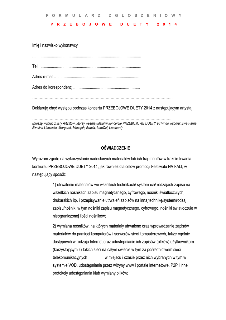 F O R P R M Z U E B L A R O J Z O Z W E G Ł D O U S Z E T E Y N I O 2 0 W Y 1 4 Imię i nazwisko wykonawcy ......................................................................................................... Tel ................................................................................................... Adres e-mail ................................................................................... Adres do korespondencji................................................................ ………………………………………………………………………………………………….. Deklaruję chęć występu podczas koncertu PRZEBOJOWE DUETY 2014 z następującym artystą: …………………………………………………………………………………………………. (proszę wybrać z listy Artystów, którzy wezmą udział w koncercie PRZEBOJOWE DUETY 2014; do wyboru: Ewa Farna, Ewelina Lisowska, Margaret, Mesajah, Bracia, LemON, Lombard) OŚWIADCZENIE Wyrażam zgodę na wykorzystanie nadesłanych materiałów lub ich fragmentów w trakcie trwania konkursu PRZEBOJOWE DUETY 2014, jak również dla celów promocji Festiwalu NA FALI, w następujący sposób: 1) utrwalenie materiałów we wszelkich technikach/ systemach/ rodzajach zapisu na wszelkich nośnikach zapisu magnetycznego, cyfrowego, nośniki światłoczułych, drukarskich itp. i przepisywanie utrwaleń zapisów na inną technikę/system/rodzaj zapisu/nośnik, w tym nośniki zapisu magnetycznego, cyfrowego, nośniki światłoczułe w nieograniczonej ilości nośników; 2) wymiana nośników, na których materiały utrwalono oraz wprowadzanie zapisów materiałów do pamięci komputerów i serwerów sieci komputerowych, także ogólnie dostępnych w rodzaju Internet oraz udostępnianie ich zapisów (plików) użytkownikom (korzystającym z) takich sieci na całym świecie w tym za pośrednictwem sieci telekomunikacyjnych w miejscu i czasie przez nich wybranych w tym w systemie VOD, udostępniania przez witryny www i portale internetowe, P2P i inne protokoły udostępniania i/lub wymiany plików; F O R P R M Z U L E B A R O J Z O Z W E G Ł D O U S Z E T E Y N I O 2 0 W Y 1 4 3) zwielokrotnianie zapisów materiałów w nieograniczonej liczbie egzemplarzy na wszelkich nośnikach, wszelkimi technikami, w tym techniką zapisu magnetycznego, światłoczułego, drukarskiego, reprograficznego, cyfrowego; 4) publiczne wyświetlanie i odtwarzanie materiałów. Wykonawca wyraża zgodę na wykorzystanie swojego wizerunku w trakcie trwania konkursu PRZEBOJOWE DUETY, który jest częścią festiwalu NA FALI 2014; a) wykonawca oświadcza, że wykorzystanie przez Festival Group Sp. z o.o. nadesłanych materiałów nie narusza praw ani dóbr osobistych osób trzecich; b) wykonawca oświadcza, że zapoznał się z regulaminem konkursu PRZEBOJOWE DUETY, który jest dostępny na stronie www.festiwalnafali.pl ; c) wykonawca wyraża zgodę na wzięcie udziału w konkursie jedynie za zwrot kosztów podróży w kwocie nie przekraczającej 1.000 złotych brutto. Festival Group Sp. z o.o zapewni niezbędny nocleg wykonawcy; d) wykonawca zobowiązuje się do ścisłej współpracy z reżyserem Koncertu w zakresie inscenizacji występu; e) wykonawca wyraża zgodę na przetwarzanie danych zawartych w formularzu zgłoszeniowy dla potrzeb niezbędnych do przeprowadzenia poszczególnych etapów konkursu PRZEBOJOWE DUETY(zgodnie z Ustawą z dnia 29.08.97 r. o Ochronie Danych Osobowych Dz.U. Nr 101 poz. 926 z późn. zm.); f) wykonawca zobowiązuje się do ścisłej współpracy z Festival Group Sp. z o.o. w zakresie budowania serwisu internetowego Festiwalu, polegającej na udziale w sesji zdjęciowej/nagraniowej realizowanej na potrzeby tego serwisu w celach promocji całego wydarzenia. Data i podpis wykonawcy .........................................................................................