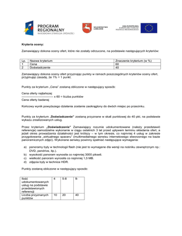 Kryteria oceny: Zamawiający dokona oceny ofert, które nie zostały odrzucone, na podstawie następujących kryteriów: Lp. 1 2 Nazwa kryterium Cena Doświadczenie Znaczenie kryterium (w %) 60 40 Zamawiający dokona oceny ofert przyznając punkty w ramach poszczególnych kryteriów oceny ofert, przyjmując zasadę, że 1% = 1 punkt. Punkty za kryterium „Cena” zostaną obliczone w następujący sposób: Cena oferty najtańszej ------------------------------- x 60 = liczba punktów Cena oferty badanej Końcowy wynik powyższego działania zostanie zaokrąglony do dwóch miejsc po przecinku. Punkty za kryterium „Doświadczenie” zostaną przyznane w skali punktowej do 40 pkt, na podstawie wykazu zrealizowanych usług. Przez kryterium „Doświadczenie” Zamawiający rozumie udokumentowane (należy przedstawić referencje) samodzielne wykonanie w ciągu ostatnich 3 lat przed upływem terminu składania ofert, a jeżeli okres prowadzenia działalności jest krótszy – w tym okresie, co najmniej 4 usług w zakresie przygotowania „wirtualnego spaceru” (multimedialnego serwisu internetowego stworzonego na bazie panoramicznych zdjęć). Wykonane serwisy powinny spełniać następujące wymagania: a) panoramy były w technologii flash (nie jest to wymagane dla wersji na nośniku zewnętrznym np.: DVD, pendrive, itp.). b) wysokość panoram wynosiła co najmniej 3000 pikseli. c) wielkość panoram wynosiła co najmniej 1,5 MB. d) zdjęcia były w technice HDR. Punkty zostaną obliczone w następujący sposób: Ilość udokumentowanych usług na podstawie przedstawionych referencji Liczba przyznanych punktów 4 5-8 9- 10 20 40