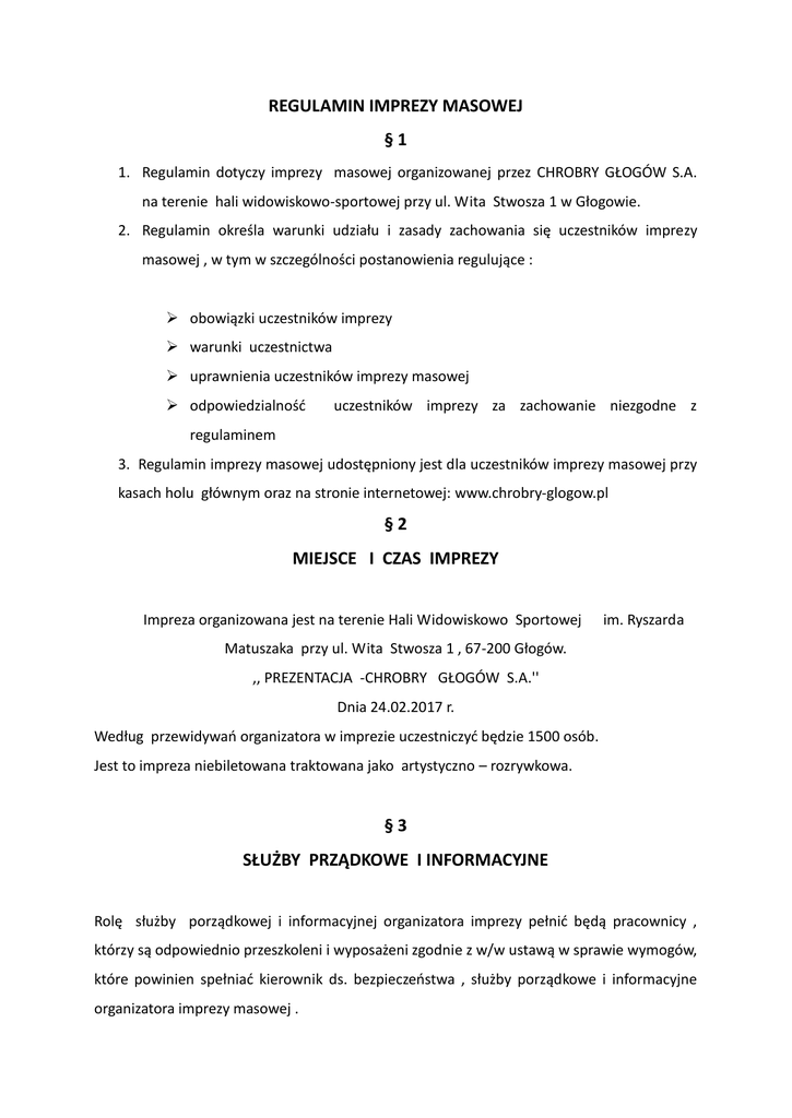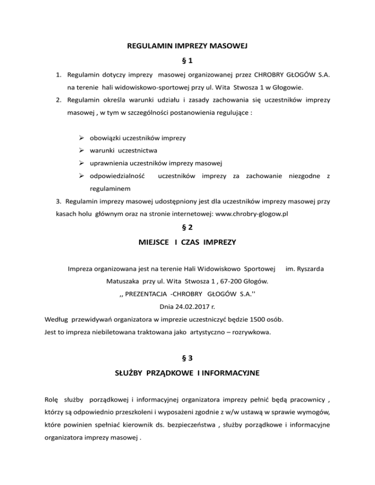 REGULAMIN IMPREZY MASOWEJ §1 1. Regulamin dotyczy imprezy masowej organizowanej przez CHROBRY GŁOGÓW S.A. na terenie hali widowiskowo-sportowej przy ul. Wita Stwosza 1 w Głogowie. 2. Regulamin określa warunki udziału i zasady zachowania się uczestników imprezy masowej , w tym w szczególności postanowienia regulujące : obowiązki uczestników imprezy warunki uczestnictwa uprawnienia uczestników imprezy masowej odpowiedzialność uczestników imprezy za zachowanie niezgodne z regulaminem 3. Regulamin imprezy masowej udostępniony jest dla uczestników imprezy masowej przy kasach holu głównym oraz na stronie internetowej: www.chrobry-glogow.pl §2 MIEJSCE I CZAS IMPREZY Impreza organizowana jest na terenie Hali Widowiskowo Sportowej im. Ryszarda Matuszaka przy ul. Wita Stwosza 1 , 67-200 Głogów. ,, PREZENTACJA -CHROBRY GŁOGÓW S.A.'' Dnia 24.02.2017 r. Według przewidywań organizatora w imprezie uczestniczyć będzie 1500 osób. Jest to impreza niebiletowana traktowana jako artystyczno – rozrywkowa. §3 SŁUŻBY PRZĄDKOWE I INFORMACYJNE Rolę służby porządkowej i informacyjnej organizatora imprezy pełnić będą pracownicy , którzy są odpowiednio przeszkoleni i wyposażeni zgodnie z w/w ustawą w sprawie wymogów, które powinien spełniać kierownik ds. bezpieczeństwa , służby porządkowe i informacyjne organizatora imprezy masowej . Zadaniem służby porządkowej będzie zabezpieczenie terenu Hali Widowiskowo – Sportowej od. godz. 17.00 – 19.30. W zabezpieczeniu imprezy masowej weźmie udział 22 członków służb porządkowych i informacyjnych ,z których minimum pięć , czyli 20% będzie posiadało licencję pracownika ochrony , ubrani będą w uniformy służbowe z napisami służb porządkowych lub informacyjnych , zaopatrzeni w identyfikatory umieszczone w widocznym miejscu. §4 INSTRUKCJA OKREŚLAJĄCA UPRAWNIENIA SŁUŻB PORZĄDKOWYCH NA IMPREZIE MASOWEJ 1. Sprawdzania i stwierdzania uprawnień osób do uczestniczenia w imprezie masowej, a w przypadku stwierdzenia braku takich uprawnień- wezwania do opuszczenia imprezy masowej. 2. Legitymowania osób w celu ustalenia ich tożsamości. 3. Przeglądania bagaży i odzieży osób w przypadku podejrzenia, że osoby te wnoszą lub posiadają przedmioty niebezpieczne, materiały wybuchowe, wyroby pirotechniczne, materiały pożarowo-niebezpieczne, napoje alkoholowe, środki odurzające lub substancje psychotropowe. 4. Wydawania poleceń porządkowych osobom zakłócającym porządek publiczny lub zachowującym się niezgodnie z regulaminem imprezy masowej, regulaminem obiektu, a przypadku niewykonania ich poleceń- wezwania do opuszczenia imprezy masowej. 5. Ujęcia w celu niezwłocznego przekazania policji osób stwarzających bezpośrednie zagrożenie dla dóbr powierzonych ochronie oraz dopuszczających się czynów zabronionych. §5 SŁUŻBY INFORMACYJNE SĄ OBOWIĄZANE DO : 1. Informowania o udogodnieniach oraz wymogach bezpieczeństwa określonych przez organizatora lub służby ratownicze. 2. Informowania o umiejscowieniu punktów medycznych, gastronomicznych i sanitarnych. 3. Nadzorowanie bezpiecznego wejścia i wyjścia osób uczestniczących w imprezie masowej. 4. Niedopuszczenie osób uczestniczących w imprezie masowej do miejsc nie przeznaczonych dla publiczności. 5. Niezwłocznego reagowania na incydenty i zagrożenia oraz podejmowanie niezbędnych działań zaradczych w szczególności poprzez informowanie o nich służb porządkowych. 6. Obserwowania wszystkich obszarów potencjalnego zagrożenia i przeciwdziałania nadmiernemu zagęszczeniu osób. 7. Pilnowanie przestrzegania postanowień regulaminu obiektu i regulaminu imprezy masowej. 8. Reagowaniu na skargi składane przez osoby uczestniczące w imprezie masowej. Wymienione czynności będą realizowane w sposób możliwie najmniej naruszający godność ludzką oraz dobra osobiste osoby w stosunku do których podjęte . §6 ZADANIA KIEROWNIKA D/S. BEZPIECZEŃSTWA 1.Przeprowadzenie szczegółowej odprawy z pracownikami służb porządkowych i informacyjnych, oraz przydzielenie kluczy od wyjść ewakuacyjnych dla osób wydzielonych z poszczególnych posterunków. 2.Koordynować działania poszczególnych odcinków w celu przeciwdziałaniu zakłócenia porządku i niszczeniu powierzonego mienia. 3.Bezpośrednia współpraca z Policją , przekazywanie niezbędnych informacji dotyczących przebiegu imprezy masowej i ewentualnych zagrożeń. §7 ZASADY DZIAŁANIA W PRZYPADKACH NADZWYCZAJNYCH W przypadku informacji o podłożeniu ładunku wybuchowego : 1.Powiadomić kierownika ds. bezpieczeństwa , który niezwłocznie powinien powiadomić Policję. 2.Usunąć ludzi z najbliższego otoczenia miejsca podłożonego ładunku dbając o sprawne przemieszczanie się osób. 3.Współdziałać z Policją i z innymi wyspecjalizowanymi służbami w trakcie zabezpieczenia terenu i ewakuacji znajdujących się tam osób. 4.Jeżeli zajdzie taka potrzeba wezwać pogotowie ratunkowe. §8 ZASADY EWAKUACJI 1. Organizator imprezy odbiera wezwanie lub zawiadomienie o zdarzeniu weryfikuje informacje (jeśli zgłaszający zdarzenie nie posiada kwalifikacji) alarmuje służby ratownicze o zdarzeniu określa treść komunikatu dla publiczności w celu zapobieżenia panice powiadamia osoby funkcyjne określa kierunki rozprzestrzeniania się zdarzenia dowodzi akcją do czasu przybycia sił ratowniczych 2. Kierownik ds. bezpieczeństwa imprezy: ustala dokładną lokalizację, czas i rodzaj zdarzenia szacuje liczbę ofiar oraz dodatkowe potencjalne zagrożenia określa zadania dla podległych pracowników kieruje jednostki ratownicze przybywające na miejsce zdarzenia jest do dyspozycji kierującego działaniami wykonuje zadania stawiane przez kierującego akcją ratowniczą po zakończeniu akcji sprawdza stan zdrowia podległych pracowników. EWAKUACJA – zarządzona w razie konieczności odbywa się na hasło: ”ewakuacja” podane przez sprzęt nagłaśniają