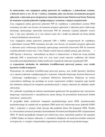 b) maksymalny czas osiągnięcia pełnej gotowości do współpracy z jednostkami systemu, o których mowa w art. 32 ust. 1 ustawy, rozumiany jako czas liczony od momentu przyjęcia zgłoszenia o zdarzeniu przez dyspozytora stanowiska kierowania Państwowej Straży Pożarnej do momentu wyjazdu jednostki współpracującej z systemem z miejsca stacjonowania Czas osiągnięcia pełnej gotowości jednostek PSP do współpracy z jednostkami systemu PRM rozumiany jest jako czas liczony od momentu przyjęcia zgłoszenia o zdarzeniu przez właściwego dyżurnego operacyjnego stanowiska kierowania PSP do momentu wyjazdu jednostki wynosi max. 1 min. przy założeniu, że w tym samym czasie siły i środki tej jednostki nie biorą udziału w innych działaniach ratowniczych. Czas osiągnięcia pełnej gotowości jednostek OSP z KSRG wytypowanych do współpracy z jednostkami systemu PRM rozumiany jest jako czas liczony od momentu przyjęcia zgłoszenia o zdarzeniu przez właściwego dyżurnego operacyjnego stanowiska kierowania PSP do momentu wyjazdu jednostki wynosi max. 5 min. Podana wartość dotyczy jednak sytuacji, gdy ratownicy z OSP (łącznie z kierowcą - ratownikiem) są obecni w miejscowości, w której ma swoją siedzibę jednostka OSP, w przeciwnym razie ww. czas może zostać znacznie wydłużony lub istnieje niewielkie prawdopodobieństwo braku możliwości wyjazdu do zdarzenia tej jednostki OSP. c) wyposażenie niezbędne do udzielania kwalifikowanej pierwszej pomocy oraz środki łączności i środki transportu Wyposażenie do udzielania kwalifikowanej pierwszej pomocy oraz środki łączności określone są w rejestrze jednostek współpracujących z systemem. Jednostki Krajowego Systemu Ratowniczo - Gaśniczego współpracujące z systemem Państwowe Ratownictwo Medyczne na terenie województwa łódzkiego nie posiadają na swoim wyposażeniu środków transportu typu karetki lub ambulanse służących do transportu poszkodowanych z miejsca zdarzenia do zakładów opieki zdrowotnej. Ww. jednostki wyjeżdżają do zdarzeń samochodami gaśniczymi lub specjalnymi (np. ratownictwa drogowego wyposażonymi w specjalistyczny sprzęt służący do prowadzenia skutecznych działań ratowniczo - gaśniczych). W przypadku braku możliwości transportu poszkodowanego przez ZRM, przemieszczanie poszkodowanego do szpitala lub na spotkanie ZRM może być realizowane przez jednostki KSRG tylko i wyłącznie w sytuacji, kiedy decyzję taką podejmie lekarz lub dysponent ZRM. Wynika to z Porozumień zawartych pomiędzy Komendantami Powiatowymi/Miejskimi PSP a dysponentami ZRM. W takich przypadkach transport jest realizowany przez samochody gaśnicze lub specjalne z KSRG będące na miejscu zdarzenia, w warunkach odstąpienia od zasad powszechnie uznanych za bezpieczne, w związku z bezpośrednim zagrożeniem życia lub zdrowia poszkodowanego.