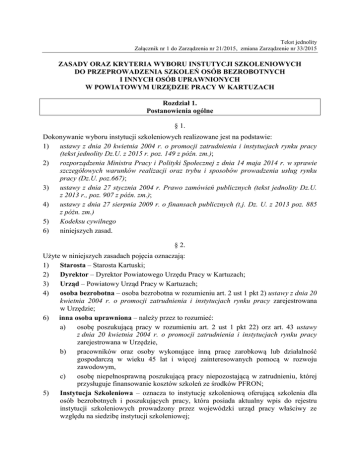 Tekst jednolity Załącznik nr 1 do Zarządzenia nr 21/2015, zmiana Zarządzenie nr 33/2015 ZASADY ORAZ KRYTERIA WYBORU INSTUTYCJI SZKOLENIOWYCH DO PRZEPROWADZENIA SZKOLEŃ OSÓB BEZROBOTNYCH I INNYCH OSÓB UPRAWNIONYCH W POWIATOWYM URZĘDZIE PRACY W KARTUZACH Rozdział 1. Postanowienia ogólne § 1. Dokonywanie wyboru instytucji szkoleniowych realizowane jest na podstawie: 1) ustawy z dnia 20 kwietnia 2004 r. o promocji zatrudnienia i instytucjach rynku pracy (tekst jednolity Dz.U. z 2015 r. poz. 149 z późn. zm.); 2) rozporządzenia Ministra Pracy i Polityki Społecznej z dnia 14 maja 2014 r. w sprawie szczegółowych warunków realizacji oraz trybu i sposobów prowadzenia usług rynku pracy (Dz.U. poz.667); 3) ustawy z dnia 27 stycznia 2004 r. Prawo zamówień publicznych (tekst jednolity Dz.U. z 2013 r., poz. 907 z późn. zm.); 4) ustawy z dnia 27 sierpnia 2009 r. o finansach publicznych (t.j. Dz. U. z 2013 poz. 885 z póżn. zm.) 5) Kodeksu cywilnego 6) niniejszych zasad. § 2. Użyte w niniejszych zasadach pojęcia oznaczają: 1) Starosta – Starosta Kartuski; 2) Dyrektor – Dyrektor Powiatowego Urzędu Pracy w Kartuzach; 3) Urząd – Powiatowy Urząd Pracy w Kartuzach; 4) osoba bezrobotna – osoba bezrobotna w rozumieniu art. 2 ust 1 pkt 2) ustawy z dnia 20 kwietnia 2004 r. o promocji zatrudnienia i instytucjach rynku pracy zarejestrowana w Urzędzie; 6) inna osoba uprawniona – należy przez to rozumieć: a) osobę poszukującą pracy w rozumieniu art. 2 ust 1 pkt 22) orz art. 43 ustawy z dnia 20 kwietnia 2004 r. o promocji zatrudnienia i instytucjach rynku pracy zarejestrowana w Urzędzie, b) pracowników oraz osoby wykonujące inną pracę zarobkową lub działalność gospodarczą w wieku 45 lat i więcej zainteresowanych pomocą w rozwoju zawodowym, c) osobę niepełnosprawną poszukującą pracy niepozostającą w zatrudnieniu, której przysługuje finansowanie kosztów szkoleń ze środków PFRON; 5) Instytucja Szkoleniowa – oznacza to instytucję szkoleniową oferującą szkolenia dla osób bezrobotnych i poszukujących pracy, która posiada aktualny wpis do rejestru instytucji szkoleniowych prowadzony przez wojewódzki urząd pracy właściwy ze względu na siedzibę instytucji szkoleniowej; 6) 7) 8) 9) szkolenie indywidualne – oznacza to szkolenie wskazane przez osoby bezrobotne oraz inne osoby uprawnione, zgodnie z art. 40 ust. 3 ustawy z dnia 20 kwietnia 2004r. o promocji zatrudnienia i instytucjach rynku pracy; szkolenie grupowe – szkolenie organizowane są dla grup osób uprawnionych w oparciu o plan szkoleń grupowych przygotowany przez Urząd po otrzymaniu środków finansowych na dany rok oraz po dokonaniu analizy potrzeb szkoleniowych na lokalnym rynku pracy; PFRON – Państwowy Fundusz Rehabilitacji Osób Niepełnosprawnych; przeciętne wynagrodzenie – przeciętne miesięczne wynagrodzenie w gospodarce narodowej w poprzednim kwartale od pierwszego dnia następnego miesiąca po ogłoszeniu przez Prezesa Głównego Urzędu Statystycznego w Dzienniku Urzędowym Rzeczypospolitej Polskiej „Monitor Polski”. § 3. 1. 2. 3. Niniejsze zasady regulują kwestie współpracy między Urzędem, a Instytucjami Szkoleniowymi oraz kryteria wyboru Wykonawców, którym zostanie zlecone przeprowadzenie szkoleń. Starosta, w celu zapewnienia najwyższej jakości szkolenia dokonuje wyboru Instytucji Szkoleniowej i zleca przeprowadzenie szkoleń mając na uwadze zasady konkurencyjności, równego traktowania i przejrzystości. Zadanie związane ze zlecaniem przeprowadzenia szkoleń realizowane jest przez Dyrektora w ramach udzielonego przez Starostę pełnomocnictwa i do wysokości środków Funduszu Pracy, PFRON oraz innych środków pozyskanych w ramach projektów/programów w danym roku kalendarzowym na podstawie decyzji finansowych z przeznaczeniem na finansowanie szkoleń. § 4. 1. 2. 3. Niniejsze Zasady mają zastosowanie w przypadku zlecania przeprowadzania szkoleń grupowych oraz indywidualnych, gdy ich wartość szacunkowa nie przekroczy kwoty 30.000 euro. Szkolenia przekraczające wartość 30.000 euro zlecane są w oparciu o przepisy ustawy z dnia 27 stycznia 2004 r. Prawo zamówień publicznych. W każdym przypadku organizacji szkolenia grupowego może zostać podjęta decyzja o organizacji szkolenia z oparciu o przepisy w/w ustawy w celu zapewnienia jak największej konkurencyjności wyboru. Przeprowadzenie szkoleń zleca się wyłącznie Instytucjom Szkoleniowym, które posiadają aktualny wpis do rejestru instytucji szkoleniowych prowadzonego przez Wojewódzki Urząd Pracy właściwy ze względu na siedzibę instytucji szkoleniowej. Rozdział 2. Szczegółowe zasady wyboru Instytucji szkoleniowych § 5. 1. 2. W przypadku konieczności zlecenia przeprowadzenia szkolenia grupowego Urząd dokonuje szacowania wartości zamówienia/analizy wartości zamówienia, w celu określenia procedury w oparciu o którą przeprowadzone zostanie postępowanie wyłonienia Instytucji szkoleniowej (§ 4 ust 1. lub ust 2. niniejszych zasad). Szacowanie dokonywane jest z należytą starannością. 3. 4. Szacowania dokonuje się na podstawie już określonego przedmiotu zamówienia (warunków zapytania ofertowego wymienionych w § 6 ust 2. pkt 1), 2), 3) niniejszych zasad). Przyjmuje się, że w przypadku szkoleń indywidualnych wartość szacunkowa zamówienia nie przekracza 30.000 euro. Zgodnie bowiem z zapisami art. 40 ust 3 ustawy o promocji zatrudnienia i instytucjach rynku pracy koszt szkolenia indywidualnego nie może przekroczyć 300% przeciętnego wynagrodzenia § 6. 1. 2. 3. 4. 5. 6. W przypadku konieczności zlecenia szkolenia, której wartość szacunkowa nie przekroczy 30.000 euro Urząd przygotowuje zapytanie ofertowe. Zapytanie ofertowe powinno określać: 1) nazwę oraz zakres szkolenia, 2) liczbę osób do przeszkolenia, 3) wymogi dotyczące kadry, miejsca szkolenia, potencjału technicznego itp., 4) opis sposobu przygotowania oferty, 5) miejsce i termin z