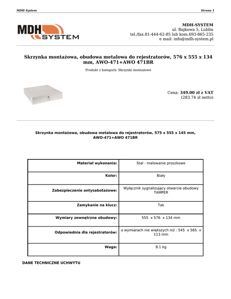 MDH System Strona 1 MDH-SYSTEM ul. Bajkowa 5, Lublin tel./fax.81-444-62-85 lub kom.693-865-235 e mail: [email protected] Skrzynka montażowa, obudowa metalowa do rejestratorów, 576 x 555 x 134 mm, AWO-471+AWO 471BR Produkt z kategorii: Skrzynki montażowe Cena: 349.00 zł z VAT (283.74 zł netto) Skrzynka montażowa, obudowa metalowa do rejestratorów, 575 x 555 x 145 mm, AWO-471+AWO 471BR Materiał wykonania: Kolor: Zabezpieczenie antysabotażowe: Zamykanie na klucz: Stal - malowanie proszkowe Biały Wyłącznik sygnalizujący otwarcie obudowy TAMPER Tak Wymiary zewnętrzne obudowy: 555 x 576 x 134 mm Odpowiednia dla rejestratorów: o wymiarach nie większych niż : 545 x 565 x 113 mm Waga: DANE TECHNICZNE UCHWYTU 8.1 kg MDH System Strona 2 Wymiary W=555, H=130, D=65 [mm, +/-2] Waga netto/brutto: 0,90/ 1,0[kg] Uwagi: uchwyt metalowy, kolor RAL9003 Certyfikaty, deklaracje: RoHS Zapraszamy do naszego sklepu internetowego www.mdh-system.pl Dokument wygenerowany 2017-03-02 o godzinie 11:50