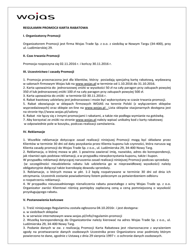 REGULAMIN PROMOCJI KARTA RABATOWA I. Organizatorzy Promocji Organizatorem Promocji jest firma Wojas Trade Sp. z o.o. z siedzibą w Nowym Targu (34-400), przy ul. Ludźmierskiej 29. II. Czas trwania Promocji Promocja rozpoczyna się 02.11.2016 r. i kończy 30.11.2016 r. III. Uczestnictwo i zasady Promocji 1. Promocja przeznaczona jest dla klientów, którzy posiadają specjalną kartę rabatową, wydawaną w salonach firmowym Wojas lub na www.wojas.pl w terminie od 1.10.2016 do 31.10.2016. 2. Karta upoważnia do jednorazowej zniżki w wysokości 50 zł na cały paragon przy zakupach powyżej 350 zł lub jednorazowej zniżki 100 zł na cały paragon przy zakupach powyżej 500 zł. 3. Karta upoważnia do zniżki w terminie 02-30.11.2016 r. 4. Rabat kwotowy udzielany jest jednorazowo i może być wykorzystany w czasie trwania promocji. 5. Rabat obowiązuje w sklepach firmowych WOJAS na terenie Polski (z wyłączeniem sklepów wyprzedażowych) oraz sklepie on-line na www.wojas.pl . Lista sklepów stacjonarnych dostępna jest na stronie ttp://www.wojas.pl/salony 6. Rabat nie łączy się z innymi promocjami i rabatami, a także nie podlega wymianie na gotówkę. 7. Aby korzystać ze zniżki na stronie www.wojas.pl należy wpisać unikalny kod z karty rabatowej w odpowiednie pole w koszyku, podczas realizacji zamówienia. IV. Reklamacje 1. Wszelkie reklamacje dotyczące zasad realizacji niniejszej Promocji mogą być składane przez Klientów w terminie 30 dni od daty pozyskania przez Klienta kuponu lub czynności, która narusza wg Klienta zasady promocji do Wojas Trade Sp. z o.o., ul. Ludźmierska 29, 34-400 Nowy Targ. 2. Reklamacja, o której mowa w pkt. 1 powinna zawierać imię, nazwisko, adres do korespondencji, jak również opis podstaw reklamacji, a w przypadku niewykorzystania kuponu, także i kupon. W przypadku reklamacji dotyczącej naruszenia zasad realizacji niniejszej Promocji podczas sprzedaży (w szczególności nieudzielenia rabatu lub udzielenia go w nieprawidłowej wysokości) należy obligatoryjnie dołączyć także kserokopię dowodu sprzedaży. 3. Reklamacje, o których mowa w pkt. 1-2 będą rozpatrywane w terminie 30 dni od dnia ich otrzymania. Uczestnik zostanie powiadomiony listem poleconym za potwierdzeniem odbioru o rozpatrzeniu reklamacji. 4. W przypadku nieuzasadnionego nienaliczenia rabatu powstałego z winy Wojas Trade sp. z o.o. Organizator zwróci Klientowi różnicę pomiędzy zapłaconą ceną a ceną pomniejszoną o wysokość przysługującego rabatu. V. Postanowienia końcowe 1. Treść niniejszego Regulaminu została ogłoszona 04.10.2016r. i jest dostępna: a. w siedzibach sklepów b. w serwisie internetowym www.wojas.pl/info/regulamin-promocji 2. Wszelką korespondencję do Organizatorów należy kierować na adres Wojas Trade Sp. z o.o., ul. Ludźmierska 29, 34-400 Nowy Targ. 3. Podanie danych w zw. z realizacją Promocji Karta Rabatowa jest równoznaczne z wyrażeniem zgody na przetwarzanie danych osobowych Uczestnika przez Organizatora oraz podmioty którym powierzono te dane, zgodnie z Ustawą z dnia 29 sierpnia 1997 r. o ochronie danych osobowych. Dane osobowe Uczestnika będą przetwarzane w celu realizacji Promocji i ewentualnej reklamacji. Dane te są poufne i nie będą ujawniane osobom nie uprawnionym. 4. Dane osobowe Uczestnika chronione są przez Organizatora zgodnie z przepisami wyżej powołanej Ustawy o ochronie danych osobowych, i nie będą przekazywane, odsprzedawane ani użyczane innym osobom lub instytucjom, które nie będą do tego uprawnione. 5. Dostęp do danych osobowych posiada jedynie administrator danych, którym jest Organizator. Uczestnik ma możliwość dostępu do dotyczących go danych osobowych w celu ich weryfikacji, modyfikacji lub wystąpienia o ich usunięcie z bazy danych osobowych, zawiadamiając o tym pisemnie administratora danych, czyli Organizatora.