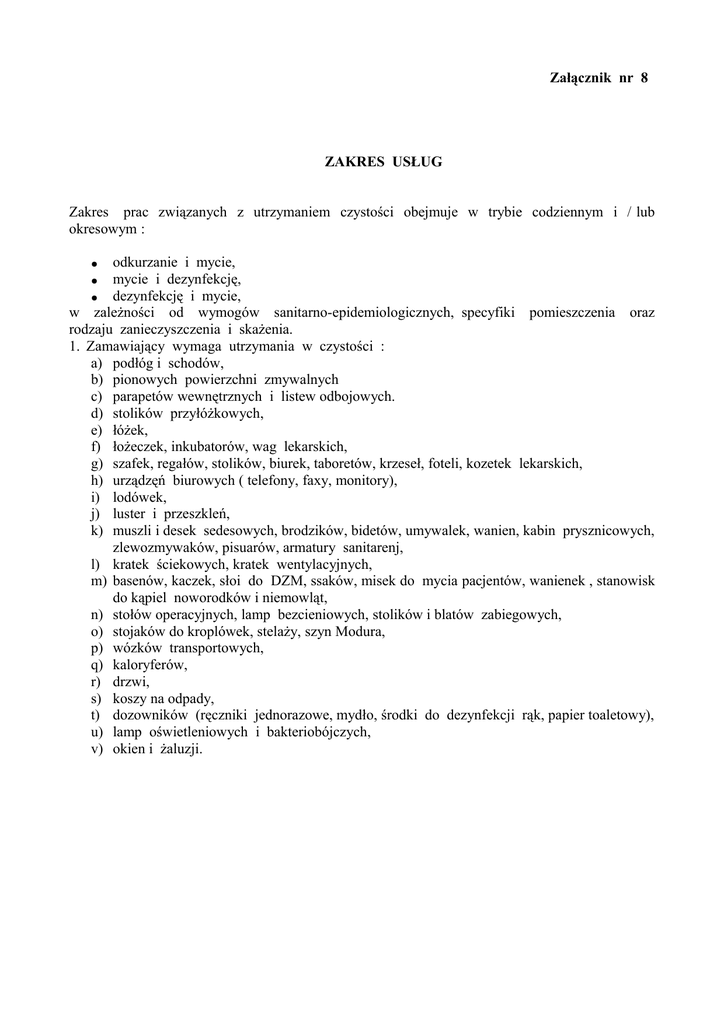 Załącznik nr 8 ZAKRES USŁUG Zakres prac związanych z utrzymaniem czystości obejmuje w trybie codziennym i / lub okresowym : odkurzanie i mycie, ● mycie i dezynfekcję, ● dezynfekcję i mycie, w zależności od wymogów sanitarno-epidemiologicznych, specyfiki pomieszczenia oraz rodzaju zanieczyszczenia i skażenia. 1. Zamawiający wymaga utrzymania w czystości : a) podłóg i schodów, b) pionowych powierzchni zmywalnych c) parapetów wewnętrznych i listew odbojowych. d) stolików przyłóżkowych, e) łóżek, f) łożeczek, inkubatorów, wag lekarskich, g) szafek, regałów, stolików, biurek, taboretów, krzeseł, foteli, kozetek lekarskich, h) urządzęń biurowych ( telefony, faxy, monitory), i) lodówek, j) luster i przeszkleń, k) muszli i desek sedesowych, brodzików, bidetów, umywalek, wanien, kabin prysznicowych, zlewozmywaków, pisuarów, armatury sanitarenj, l) kratek ściekowych, kratek wentylacyjnych, m) basenów, kaczek, słoi do DZM, ssaków, misek do mycia pacjentów, wanienek , stanowisk do kąpiel noworodków i niemowląt, n) stołów operacyjnych, lamp bezcieniowych, stolików i blatów zabiegowych, o) stojaków do kroplówek, stelaży, szyn Modura, p) wózków transportowych, q) kaloryferów, r) drzwi, s) koszy na odpady, t) dozowników (ręczniki jednorazowe, mydło, środki do dezynfekcji rąk, papier toaletowy), u) lamp oświetleniowych i bakteriobójczych, v) okien i żaluzji. ● 2. Ponadto w zakres usług wchodzić będzie : a) zapewnienie i uzupełnianie dozowników (mydło Sterisol – odpowiadające rodzajowi posiadanych dozowników, mydło zwykłe, ręczniki jednorazowego użytku, papier toaletowy), b) wymiana worków na odpady w koszach, c) usuwanie pajęczyn, d) zdejmowanie i zawieszanie firan, e) dezynfekcja i mycie obuwia operacyjnego f) dostarczanie roztworu środków myjących w ilości ok. 200 litrów/ miesiąc do aparatury i sprzętu medycznego np. respiratorów, pomp infuzyjnych itp. oraz do mebli wewnątrz w gabinecie zabiegowym. Wykonawcą mycia w/ w asortymentu jest personel danej jednostki szpitalnej. g) czyszczenie i konserwacja urządzeń ze stali, h) przeprowadzanie dezynfekcji miejscowej doraźnej w razie zabrudzenia materiałem biologicznym zakaźnym, krwią, wydalinami, wydzielinami itp. i) sprzątanie sal chorych, w Oddziale Dziecięcym, po wypisie dzieci j) mycie i dezynfekcja podłogi, w razie potrzeby mycie okna wewnątrz oraz mycie i dezynfekcja wyposażenia, k) wc i łazienki przy salach chorych - mycie i dezynfekcja podłóg, pionowych powierzchni zmywalnych oraz wyposażenia l) sprzątanie sal chorych po wypisie noworodków – mycie i dezynfekcja podłogi, pionowych powierzchni zmywalnych, w razie potrzeby okna wewnątrz, mycie i dezynfekcja wyposażenia, m)sprzątanie gruntowne sal chorych 1 x miesiącu odstawianie szafek, łożek, mycie i dezynfekcja podłóg, ścian, parapetów, mycie i dezynfekcja wyposażenia, n) sprzątanie gruntowne kuchenek w oddziałach 1 x kwartał odstawianie mebli, mycie i dezynfekcja podłóg, ścian, mycie i dezynfekcja wnętrza mebli po opróżnieniu o) sprzątanie gruntowne gabinetów zabiegowych 1 x miesiąciu odstawianie mebli, mycie i dezynfekcja podłóg, mycie i dezynfekcja ścian, parapetów i wyposażenia p) sprzątanie gruntowne w pozostałych pomieszczeniach wskazanych przez kierowników danej jednostki w razie potrzeby q) sprzątanie klatki ewakuacyjnej Oddziału Chorób Płuc i Gruźlicy 1 x dziennie r) sprzątanie balkonów 1 x miesiąc w Oddziale Dziecięcym i Chorób Płuc i Gruźlicy s) gruntowne maszynowe czyszczenie podłóg 1 x kwartał i w razie potrzeby, t) polerowanie podłóg w razie potrzeby, u) okresowe pastowanie podłóg 1 x kwartał w Oddziale Ginekologiczno-Położniczym i Oddziale Chorób Płuc i Gruźlicy v) w przypadku zmiany rodzaju powierzchni podłóg przez Zamawiajacego w okresie obowiązywania umowy Zleceniobiorca jest zobowiązany dostosować zakres usługi do wymogów producenta. 3. Inne czynności związane z organizacją pracy w szpitalu: a) prace przy chorych: 1) pomoc pielegniarkom/położnym przy przenoszeniu i transporcie chorych 2) podawanie i odbieranie od pacjentów naczyń do wydalin (basenów, kaczek) oraz opróżniania ich 3) pomoc pielęgniarkom/położnym w czynnościach przy chorych, przy których jest niezbędna asysta drugiej osoby. Wykonywanie czynności 1-3 jest uzależnione od stanu chorego i jego indywidualnych potrzeb, co określa pielęgniarka/położna. 4) odnoszenie materiałów do badań laboratoryjnych po godz. 15:00 5) mycie i dezynfekcja łóżek po wypisach oraz zdjęcie brudnej bielizny pościelowej oraz przygotowanie jej do odbioru z jednostki szpitalnej. 6) przyjęcie do określonej jednostki i ułożenie asortymentowo czystej bielizny szpitalnej. 7) mycie butelek i smoczków w kuchenkach oddziału noworodkowego i dzieciecego 8) zbieranie i wynoszenie odpadów pokonsumpcyjnych do pomieszczenia tego celu przeznaczonego 9) zbieranie, mycie i wyparzanie naczyń w o/chorób płuc i gruźlicy 10) zbieranie, zwożenie brudnych naczyń po posiłkach oraz mycie i dezynfekcja naczyń po kolacji od poniedziałku do piątku oraz w dni wolne od pracy po śniadaniu, obiedzie, kolacji w centralnej zmywalni naczyń w budynku głównym szpitala, 11) transport czystych naczyń z centralnej zmywalni do kuchenek oddziałowych po śniadaniu, obiedzie, kolacji i ich włożenie do mebli kuchennych 12) przywóz odzieży osobistej pacjentów z szatni do oddziałów w dni wolne od pracy oraz od poniedziałku do piątku po godz. 15:00 po pobraniu klucza z portiernii przez pracownika Wykonawcy na oddziale. 4. Zamawiający zastrzega sobie prawo dokonania czasowych zmian (np. sal chorych na salę w okresie izolacji pacjenta) lub stałych (np. z modernizacją komórki), rozmieszczenia poszczególnych stref w trakcie realizacji umowy w oparciu o ceny stref określone w ofercie. 5. Wykonawca zobowiązany jest do zwymiany systemu wycieraczek 3-stref