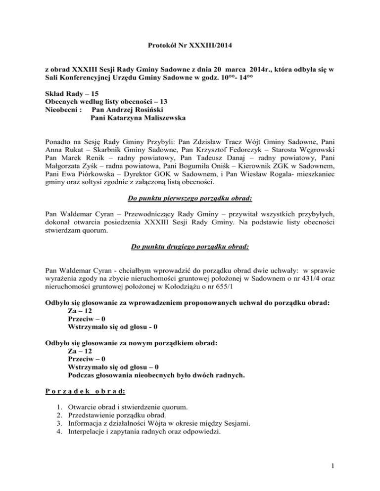 Protokół Nr XXXIII/2014 z obrad XXXIII Sesji Rady Gminy Sadowne z dnia 20 marca 2014r., która odbyła się w Sali Konferencyjnej Urzędu Gminy Sadowne w godz. 10°°- 14°° Skład Rady – 15 Obecnych według listy obecności – 13 Nieobecni : Pan Andrzej Rosiński Pani Katarzyna Maliszewska Ponadto na Sesję Rady Gminy Przybyli: Pan Zdzisław Tracz Wójt Gminy Sadowne, Pani Anna Rukat – Skarbnik Gminy Sadowne, Pan Krzysztof Fedorczyk – Starosta Węgrowski Pan Marek Renik – radny powiatowy, Pan Tadeusz Danaj – radny powiatowy, Pani Małgorzata Zyśk – radna powiatowa, Pani Bogumiła Oniśk – Kierownik ZGK w Sadownem, Pani Ewa Piórkowska – Dyrektor GOK w Sadownem, i Pan Wiesław Rogala- mieszkaniec gminy oraz sołtysi zgodnie z załączoną listą obecności. Do punktu pierwszego porządku obrad: Pan Waldemar Cyran – Przewodniczący Rady Gminy – przywitał wszystkich przybyłych, dokonał otwarcia posiedzenia XXXIII Sesji Rady Gminy. Na podstawie listy obecności stwierdzam quorum. Do punktu drugiego porządku obrad: Pan Waldemar Cyran - chciałbym wprowadzić do porządku obrad dwie uchwały: w sprawie wyraŜenia zgody na zbycie nieruchomości gruntowej połoŜonej w Sadownem o nr 431/4 oraz nieruchomości gruntowej połoŜonej w KołodziąŜu o nr 655/1 Odbyło się glosowanie za wprowadzeniem proponowanych uchwał do porządku obrad: Za – 12 Przeciw – 0 Wstrzymało się od głosu - 0 Odbyło się glosowanie za nowym porządkiem obrad: Za – 12 Przeciw – 0 Wstrzymało się od głosu – 0 Podczas głosowania nieobecnych było dwóch radnych. P o r z ą d e k o b r a d: 1. 2. 3. 4. Otwarcie obrad i stwierdzenie quorum. Przedstawienie porządku obrad. Informacja z działalności Wójta w okresie między Sesjami. Interpelacje i zapytania radnych oraz odpowiedzi. 1 5. Sprawozdanie z wysokości średnich wynagrodzeń nauczycieli na poszczególnych stopniach awansu zawodowego w szkołach prowadzonych przez jednostkę samorządu terytorialnego. 6. Sprawozdanie ze sposobu wykorzystania środków przyznanych na doskonalenie zawodowe nauczycieli w roku budŜetowym 2013. 7. Informacja z realizacji uchwał i zarządzeń. 8. Podjęcie uchwał : a) w sprawie przyjęcia Programu opieki nad zwierzętami bezdomnymi oraz zapobiegania bezdomności zwierząt na terenie Gminy Sadowne. b) w sprawie kontynuacji przez Gminę Sadowne realizacji projektu systemowego pod nazwą „Aktywny Mieszkaniec Gminy Sadowne” w ramach Poddziałania 7.1.1 Programu Operacyjnego Kapitał Ludzki. c) w sprawie maksymalnej kwoty dofinansowania opłat za kształcenie, pobieranych przez szkoły wyŜsze i zakłady kształcenia nauczycieli oraz ustalenia specjalności i form kształcenia, na które dofinansowanie będzie przyznawane w placówkach oświatowych przez Gminę Sadowne, d) w sprawie zatwierdzenia taryf na zbiorowe zaopatrzenie w wodę i zbiorowe odprowadzanie ścieków, e) w sprawie wyraŜenia zgody na wyodrębnienie w budŜecie gminy Sadowne środków stanowiących fundusz sołecki, f) w sprawie uchwalenia Programu ochrony środowiska dla Gminy Sadowne na lata 2014 – 2017 z perspektywa do roku 2021, g) w sprawie wyraŜenia zgody na zamianę nieruchomości, h) w sprawie zaciągnięcia poŜyczki z Wojewódzkiego Funduszu Ochrony Środowiska i Gospodarki Wodnej w Warszawie na finansowanie zadania pod nazwą Budowa stacji uzdatniania wody o wydajności Q = 40 m³ w miejscowości Złotki i) w sprawie zmiany Wieloletniej Prognozy Finansowej Gminy Sadowne na lata 2014-2025, j) w sprawie zmian w uchwale budŜetowej gminy na 2014r. k) w prawie wyraŜenia zgody na zbycie nieruchomości na rzecz uŜytkownika wieczystego, l) w sprawie wyraŜenia zgody na zbycie nieruchomości na rzecz uŜytkownika wieczystego 9. Sprawy róŜne – zapytania i wolne wnioski oraz odpowiedzi. 10. Przyjęcie protokołu z obrad XXXII Sesji Rady Gminy 11. Zamknięcie obrad. Pan Waldemar Cyran – porządek obrad na dzisiejszą sesję mamy uchwalany. Gościmy dziś pana Starostę, mamy zaplanowane wspólne inwestycje dotyczące poprawy nawierzchni dróg powiatowych. Drogi powiatowe musimy traktować jak swoje, bo my z nich najczęściej korzystamy. Na sesję przybył Wojciech Daniluk Pan Krzysztof Fedorczyk – Starosta Węgrowski – to jest historyczne wydarzenie w ósmym roku urzędowania po raz pierwszy zostałem zaproszony na sesję Rady Gminy Sadowne. Nasza współpraca w inwestycjach drogowych, w oświacie jest wzorowa. Przez te siedem lat wykonaliśmy 25 km dróg. JeŜeli z Gminy Sadowne pojawia się propozycja powiązana z finansowaniem, to my swoją część dokładamy. Na chwilę obecną mamy zarezerwowane w 2 swoim budŜecie 265 000,00 zł na drogę Sadowne – Sokółka 1,1 km , 174 000,00zł na drogę Sadowne-Wilczogęby 946 m, na drogę Sadowne Morzyczyn – 157 000,00zł i na chodniki w Sadownem 170m - 47 000,00zł. We wszystkie te inwestycje wkład własny gminy, to kwota 322 500,00zł. Wkład powiatu podobny. Nasza współpraca z Gminą Sadowne jest bardzo dobra. Robimy wszystko, Ŝeby szkoła w Sadownem się rozwijała, dlatego powstało w Sadownem technikum. W sytuacji kryzysowej sama szkoła bardzo sobie pomogła. Potrzebna jest nam wspólna odpowiedzialność, Ŝeby jak najwięcej dzieci kierować do Sadownego. W Węrowie dobrze rozwija się przemysł mleczarski, stolarski i w tym kierunku chcemy kształcić młodzieŜ. BudŜet powiatu ma bardzo duŜo zadań zleconych, a wolnych środków zostaje 20% . Tylko dzięki szkolnictwu specjalnemu, które ma bardzo dobrą subwencję w tamtym roku do oświaty nie dołoŜyliśmy ani grosza. W ubiegłym roku naszymi wspólnymi inwestycjami z gminą Sadowne była budowa 420 m chodnika w Sadowne, 1,6 km drogi Sokółka – Sadowne i 1300m drogi Sadowne – Wilczogęby. W 2014r musimy mieć utrzymany w odpowiednim standardzie blok operacyjny w szpitalu. Na chwilę obecną dołoŜyliśmy około 2 mil zł. W 2013r. zakupiliśmy nowy samochód za 700 000,00zł samoch