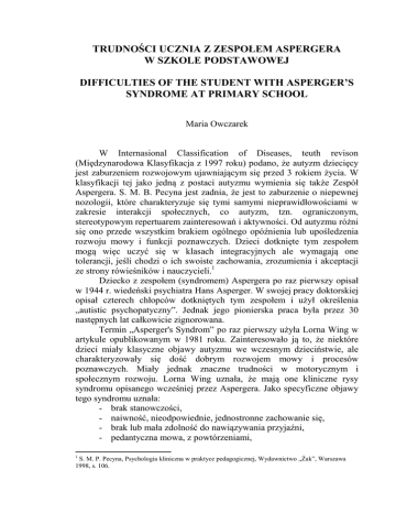 TRUDNOŚCI UCZNIA Z ZESPOŁEM ASPERGERA W SZKOLE PODSTAWOWEJ DIFFICULTIES OF THE STUDENT WITH ASPERGER’S SYNDROME AT PRIMARY SCHOOL Maria Owczarek W Internasional Classification of Diseases, teuth revison (Międzynarodowa Klasyfikacja z 1997 roku) podano, że autyzm dziecięcy jest zaburzeniem rozwojowym ujawniającym się przed 3 rokiem życia. W klasyfikacji tej jako jedną z postaci autyzmu wymienia się także Zespół Aspergera. S. M. B. Pecyna jest zadnia, że jest to zaburzenie o niepewnej nozologii, które charakteryzuje się tymi samymi nieprawidłowościami w zakresie interakcji społecznych, co autyzm, tzn. ograniczonym, stereotypowym repertuarem zainteresowań i aktywności. Od autyzmu różni się ono przede wszystkim brakiem ogólnego opóźnienia lub upośledzenia rozwoju mowy i funkcji poznawczych. Dzieci dotknięte tym zespołem mogą więc uczyć się w klasach integracyjnych ale wymagają one tolerancji, jeśli chodzi o ich swoiste zachowania, zrozumienia i akceptacji ze strony rówieśników i nauczycieli.1 Dziecko z zespołem (syndromem) Aspergera po raz pierwszy opisał w 1944 r. wiedeński psychiatra Hans Asperger. W swojej pracy doktorskiej opisał czterech chłopców dotkniętych tym zespołem i użył określenia „autistic psychopatyczny”. Jednak jego pionierska praca była przez 30 następnych lat całkowicie zignorowana. Termin „Asperger's Syndrom” po raz pierwszy użyła Lorna Wing w artykule opublikowanym w 1981 roku. Zainteresowało ją to, że niektóre dzieci miały klasyczne objawy autyzmu we wczesnym dzieciństwie, ale charakteryzowały się dość dobrym rozwojem mowy i procesów poznawczych. Miały jednak znaczne trudności w motorycznym i społecznym rozwoju. Lorna Wing uznała, że mają one kliniczne rysy syndromu opisanego wcześniej przez Aspergera. Jako specyficzne objawy tego syndromu uznała: - brak stanowczości, - naiwność, nieodpowiednie, jednostronne zachowanie się, - brak lub mała zdolność do nawiązywania przyjaźni, - pedantyczna mowa, z powtórzeniami, 1 S. M. P. Pecyna, Psychologia kliniczna w praktyce pedagogicznej, Wydawnictwo „Żak”, Warszawa 1998, s. 106. 2 - uboga niewerbalna komunikacja, - intensywna koncentracja na danych przedmiotach, - niezdarność i zaburzona koordynacja ruchów oraz nierówna asymetryczna postawa.2 Syndrom Aspergera uznany został jako sub-grupa w obrębie autyzmu, mająca własne kryteria diagnostyczne. Zaburzenie to uznawane jest jako bardziej powszechne niż klasyczny autyzm (3:1) i może występować u dzieci, które nie zostały uznane jako autystyczne. Jednym z powodów wprowadzenia przez L. Wing terminu „Asperger's Syndrom” było to, że dzieci z syndromem Aspergera różni od klasycznego autyzmu możność komunikowania się i postęp w rozwoju umysłowym. Wkładem H. Aspergera było opisanie dzieci, które nie mogą nawiązywać kontaktów uczuciowych, ale posługują się mową. Mają one mniej nasilone ograniczenia, później one u nich występują, a ich zaburzenia językowe są znacznie mniejsze niż w klasycznym autyzmie. Zespół (syndrom) Aspergera określany bywa również jako „Niespójność Aspergera” i „Psychopatia Autystyczna”. Zdaniem J. Kruk-Lasockiej dzieci z zespołem Aspergera „[...] charakteryzuje z jednej strony nieumiejętność manifestowania serdeczności i czułości wobec bliskich osób oraz pozostawanie obojętnym (poirytowanym, agresywnym) na czułość okazywaną przez innych, z drugiej strony dzieci te są nadwrażliwe, postrzegają swoje słabości, obserwują się same i same stanowią dla siebie problem”.3 Wiedzę o zespole Aspergera spopularyzował Tonny Attwood, który napisał książkę w formie przewodnika dla rodziców i specjalistów. Pracując jako kliniczny psycholog w ciągu 25 lat spotkał wiele osób z tym zespołem, różniących się pod względem wieku życia, społecznego pochodzenia i statusu. Książka napisana jest w formie popularnonaukowej, zawiera opis i analizę indywidualnych przypadków oraz wskazania terapeutyczne. Dzieci z zespołem Aspergera nie ujawniają zaburzeń rozwoju mowy we wczesnych fazach, wypowiadają się poprawnym gramatycznym językiem. Miewają jednak skłonność do powtarzania niektórych słów i fraz oraz do wielokrotnego wracania w swoich wypowiedziach do ulubionego tematu. Niektóre z tych nich mówią niestarannie (potokiem słów) często na temat, który ich szczególnie zajmuje, nie patrząc na to, że słuchacz nie jest tym zainteresowany. Wykazują tendencję unikania słowa „ja” i zastępowania go słowem „ty” lub „on – ona”. Nadużywają słowa „przy”, kiedy należałoby użyć słowa „do”, podają informacje, zamiast kontynuować wymianę zdań na dany temat. Tematy na których koncentrują 2 T. Attwood, Zespół Aspergera, Wydawnictwo Zysk i S-ka, Poznań 2010, s. 12. J. Kruk-Lasocka, Pedagogika dzieci z autyzmem i zespołami psychozopodobnymi, [w:] Pedagogika specjalna, red. W. Dykcika, Wyd. UAM, Poznań 1997, s. 248. 3 3 się dzieci zmieniają się, ale każdy z nich zajmuje znaczną część czasu poświęconego konwersacji. Dzieci te przejawiają także tendencję do niezwykłej precyzji i pedantyzmu językowego, co czyni niektóre ich wypowiedzi sztucznymi. Dzieci te mówią językiem wysoce formalnym, jakby posługiwały się słownikiem. W ich wypowiedziach mogą występować echolalie (powtórzenia) ostatniego wyrazu lub zdania. Powtarzają je zazwyczaj ciszej, jakby dla siebie. Głos dziecka może być monotonny lub przesadnie nasilony, z niewłaściwie rozłożonym akcentem. Niekiedy u dziecka mogą występować grymasy twarzy oscylujące od złości do żalu lub obojętność na twarzy (dziecko raczej patrzy na rozmówcę, aniżeli utrzymuje z nim kontakt). Gestykulacja towarzysząca wypowiedziom może być niezdarna i przesadna. Dzieci te często reagują złością na brak dostatecznego zainteresowania ze strony ich słuchaczy lub rozmów