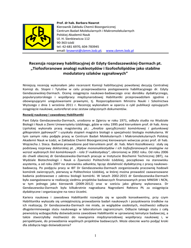Prof. dr hab. Barbara Nawrot Kierownik Zakładu Chemii Bioorganicznej Centrum Badań Molekularnych i Makromolekularnych Polskiej Akademii Nauk Ul. H. Sienkiewicza 112 90-363 Łódź tel: 42-681 6970, 604-783945 email: [email protected]; www.cbmm.lodz.pl Recenzja rozprawy habilitacyjnej dr Edyty Gendaszewskiej-Darmach pt. „Tiofosforanowe analogi nukleotydów i lizofosfolipidów jako stabilne modulatory szlaków sygnałowych” Niniejszą recenzję wykonałam jako recenzent Komisji habilitacyjnej powołanej decyzją Centralnej Komisji ds. Stopni i Tytułów w celu przeprowadzenia postępowania habilitacyjnego dr. Edyty Gendaszewskiej-Darmach. Ocenę osiągnięcia naukowo-badawczego oraz dorobku dydaktycznego, popularyzatorskiego i współpracy międzynarodowej Habilitantki przeprowadziłam zgodnie z obowiązującymi uregulowaniami prawnymi, tj. Rozporządzeniem Ministra Nauki i Szkolnictwa Wyższego z dnia 1 września 2011 r. Recenzję wykonałam w oparciu o cykl publikacji opisujących osiągnięcie naukowe, autoreferat oraz zestaw załączonych dokumentów. Rozwój naukowy i zawodowy Habilitantki Pani Edyta Gendaszewska-Darmach, urodzona w Zgierzu w roku 1971, odbyła studia na Wydziale Biologii i Nauk o Ziemi Uniwersytetu Łódzkiego, gdzie w roku 1995 pod kierunkiem prof. dr hab. Anny Lipińskiej wykonała pracę magisterską pt.: „Analiza specyficzności komórkowej i gatunkowej glikoprotein jądrowych” i uzyskała stopień magistra biologii o specjalności biologia molekularna. W tym samym roku podjęła pracę w Centrum Badań Molekularnych i Makromolekularnych Polskiej Akademii Nauk w Łodzi, w Zakładzie Chemii Bioorganicznej kierowanym wówczas przez prof. dr hab. Wojciecha J. Steca. Badania prowadzone pod kierunkiem prof. dr. hab. Marii Koziołkiewicz stały się podstawą rozprawy doktorskiej pt. „Wpływ mononukleotydów i ich tiofosforanowych analogów na wzrost wybranych linii komórkowych - rola 5’-nukleotydazy”, obronionej w 2002 roku. Od roku 2006 do chwili obecnej dr Gendaszewska-Darmach pracuje w Instytucie Biochemii Technicznej (IBT), na Wydziale Biotechnologii i Nauk o Żywności Politechniki Łódzkiej, początkowo na stanowisku asystenta, a od roku 2007 na stanowisku adiunkta, łącząc działalność dydaktyczną z pracą naukowobadawczą. Po podjęciu pracy w IBT Dr Gendaszewska-Darmach zorganizowała pracownię hodowli komórek zwierzęcych, pierwszą w Politechnice Łódzkiej, w której można prowadzić zaawansowane badania podstawowe z zakresu biologii komórki. W latach 2002-2015 dr Gendaszewska-Darmach była zaangażowana w realizację siedmiu projektów badawczych finansowanych przez MNiSW i NCN, w tym jednego jako kierownik (2009-2012) oraz w sześciu jako główny wykonawca. Dr Gendaszewska-Darmach była kilkakrotnie nagradzana Nagrodami Rektora PŁ za osiągnięcia dydaktyczne i organizacyjne na rzecz Uczelni. Kariera naukowa i zawodowa Habilitantki rozwijała się w sposób konsekwentny, przy czym Habilitantka wykazała się umiejętnością prowadzenia badań naukowych i pozyskiwania środków na ich realizację. Dr Gendaszewska-Darmach nie miała, ze względów osobistych, możliwości odbycia długoterminowego stażu naukowego w laboratorium zagranicznym. Odbycie takiego stażu z całą pewnością wzbogaciłoby doświadczenia zawodowe Habilitantki w uprawianej tematyce badawczej, a także stworzyłoby możliwości do nawiązania międzynarodowej współpracy naukowej i, w perspektywie, do prowadzenia wspólnych projektów badawczych. Może obecnie warto podjąć kroki dla zdobycia tego doświadczenia? 1 Ocena dorobku naukowego dr Gendaszewskiej-Darmach Dorobek naukowy Habilitantki związany jest z przede wszystkim z badaniami nad aktywnością biologiczną i mechanizmami oddziaływania tiofosforanowych analogów nukleotydów oraz innych modyfikowanych komponentów kwasów nukleinowych z wybranymi enzymami, receptorami, komórkami i tkankami. Tematyka ta, zapoczątkowana w trakcie rozprawy doktorskiej, została następnie kreatywnie rozwinięta w Zespole prof. Marii Koziołkiewicz stworzonym w IBT, w którym Habilitantka „grała pierwsze skrzypce” pod względem naukowym i organizacyjnym. W dorobku dr Gendaszewskiej-Darmach znajdują się łącznie 23 publikacje, w tym 19 z listy Journal Citation Reports (JCR), o łącznym IF 50,67 punktu. Prace te były cytowane 157 razy (bez autocytowań), a indeks Hirscha Habilitantki wynosi 9. Na dorobek publikacyjny składa się 5 prac w czasopismach z listy JCR opublikowanych przed uzyskaniem stopnia naukowego doktora, w tym jeden dobrze cytowany artykuł w prestiżowym czasopiśmie Blood (IF 9,273, CI 21). Prace te, w których udział Habilitantki wynosi od 10 do 40%, opublikowane zostały w Acta Biochim. Pol., Nucleic Acid Drug Dev. i Nucleosides & Nucleotides, a dotyczą biologicznych właściwości tiofosforanowych analogów oligonukleotydów oraz inhibitorowych właściwości oligonukleotydów antysensowych. Z tego okresu Habilitantka legitymuje się też dwoma artykułami przeglądowymi, opublikowanych po polsku w Postępach Biochemii, na temat szczepionek DNA oraz receptorów nukleotydowych. Z pozostałych 16 prac opublikowanych po doktoracie wyodrębniony został cykl 9 prac stanowiących osiągnięcie będące podstawą ocenianej rozprawy habilitacyjnej. Ten dorobek będzie oceniony w dalszej części recenzji. Pozostałe to dwie prace oryginalne i trzy przeglądowe, w czasopismach z listy JCR. Co ważne, jeden artykułów przeglądowych (w Curr. Org. Chem.) powstał na zaproszenie Edytora skierowane pod adresem Habilitantki, a we wszystkich tych trzech przeglądach, cytowanych dotychczas 40 razy, była ona autorem do korespondencji. Tematyka tych prac dotyczy właściwości biologicznych analogów kwasów lizofosfatydylowych i lizofosfolipidów, w tym, ich znaczeniu w procesach angiogenezy. Poza tym Habilitantka jest współautorką dwóch prac przeglądowych opublikowanych w wydawnictwa