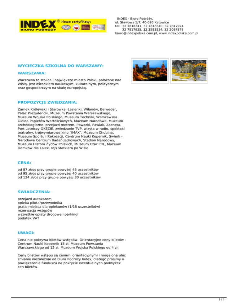INDEX - Biuro Podróży, ul. Stawowa 5/7, 40-095 Katowice tel: 32 7818341, 32 7818340, 32 7817924 32 7817925, 32 2583524, 32 2097878 [email protected], www.indexpolska.com.pl WYCIECZKA SZKOLNA DO WARSZAWY: WARSZAWA: Warszawa to stolica i największe miasto Polski, położone nad Wisłą. Jest ośrodkiem naukowym, kulturalnym, politycznym oraz gospodarczym na skalę europejską. PROPOZYCJE ZWIEDZANIA: Zamek Królewski i Starówka, Łazienki, Wilanów, Belweder, Pałac Prezydencki, Muzeum Powstania Warszawskiego, Muzeum Wojska Polskiego, Muzeum Techniki, Warszawska Giełda Papierów Wartościowych, Muzeum Narodowe, Muzeum archeologiczne, przejazd metrem, Powązki, Pawiak, Zachęta, Port Lotniczy OKĘCIE, zwiedzanie TVP, wizyta w radio, spektakl teatralny, trójwymiarowe kino "IMAX", Muzeum Chopina, Muzeum Sportu i Rekreacji, Centrum Nauki Kopernik, Świerk Narodowe Centrum Badań Jądrowych, Stadion Narodowy, Muzeum Historii Żydów Polskich, Muzeum Czar PRL, Muzeum Domków dla Lalek, rejs statkiem po Wiśle. CENA: od 87 zł/os przy grupie powyżej 45 uczestników od 95 zł/os przy grupie powyżej 40 uczestników od 124 zł/os przy grupie powyżej 30 uczestników ŚWIADCZENIA: przejazd autokarem opieka pilota/przewodnika gratis miejsca dla opiekunów (1/15 uczestników) rezerwacja wstępów wszystkie opłaty drogowe i parkingi podatek VAT UWAGI: Cena nie pokrywa biletów wstępów. Orientacyjne ceny biletów Centrum Nauki Kopernik 15 zł, Muzeum Powstania Warszawskiego od 12 zł, Muzeum Wojska Polskiego od 4 zł. Ceny biletów wstępu są cenami orientacyjnymi i mogą one ulec zmianie niezależnie od Biura Podróży Index, dlatego prosimy o powiększenie funduszu na pokrycie ewentualnych podwyżek cen biletów. 1/1 Powered by TCPDF (www.tcpdf.org)