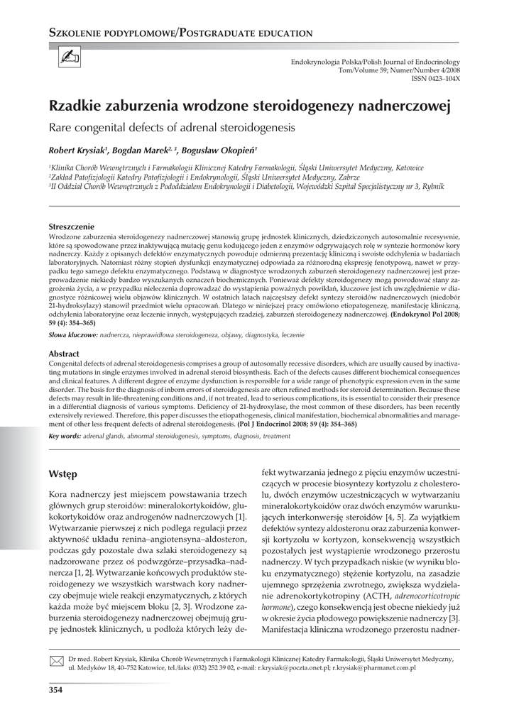 SZKOLENIE PODYPLOMOWE/POSTGRADUATE EDUCATION Endokrynologia Polska/Polish Journal of Endocrinology Tom/Volume 59; Numer/Number 4/2008 ISSN 0423–104X Rzadkie zaburzenia wrodzone steroidogenezy nadnerczowej Rare congenital defects of adrenal steroidogenesis Robert Krysiak1, Bogdan Marek2, 3, Bogusław Okopień1 1 Klinika Chorób Wewnętrznych i Farmakologii Klinicznej Katedry Farmakologii, Śląski Uniwersytet Medyczny, Katowice Zakład Patofizjologii Katedry Patofizjologii i Endokrynologii, Śląski Uniwersytet Medyczny, Zabrze 3 II Oddział Chorób Wewnętrznych z Pododdziałem Endokrynologii i Diabetologii, Wojewódzki Szpital Specjalistyczny nr 3, Rybnik 2 Streszczenie Wrodzone zaburzenia steroidogenezy nadnerczowej stanowią grupę jednostek klinicznych, dziedziczonych autosomalnie recesywnie, które są spowodowane przez inaktywującą mutację genu kodującego jeden z enzymów odgrywających rolę w syntezie hormonów kory nadnerczy. Każdy z opisanych defektów enzymatycznych powoduje odmienną prezentację kliniczną i swoiste odchylenia w badaniach laboratoryjnych. Natomiast różny stopień dysfunkcji enzymatycznej odpowiada za różnorodną ekspresję fenotypową, nawet w przypadku tego samego defektu enzymatycznego. Podstawą w diagnostyce wrodzonych zaburzeń steroidogenezy nadnerczowej jest przeprowadzenie niekiedy bardzo wyszukanych oznaczeń biochemicznych. Ponieważ defekty steroidogenezy mogą powodować stany zagrożenia życia, a w przypadku nieleczenia doprowadzać do wystąpienia poważnych powikłań, kluczowe jest ich uwzględnienie w diagnostyce różnicowej wielu objawów klinicznych. W ostatnich latach najczęstszy defekt syntezy steroidów nadnerczowych (niedobór 21-hydroksylazy) stanowił przedmiot wielu opracowań. Dlatego w niniejszej pracy omówiono etiopatogenezę, manifestację kliniczną, odchylenia laboratoryjne oraz leczenie innych, występujących rzadziej, zaburzeń steroidogenezy nadnerczowej. (Endokrynol Pol 2008; 59 (4): 354–365) Słowa kluczowe: nadnercza, nieprawidłowa steroidogeneza, objawy, diagnostyka, leczenie Abstract Congenital defects of adrenal steroidogenesis comprises a group of autosomally recessive disorders, which are usually caused by inactivating mutations in single enzymes involved in adrenal steroid biosynthesis. Each of the defects causes different biochemical consequences and clinical features. A different degree of enzyme dysfunction is responsible for a wide range of phenotypic expression even in the same disorder. The basis for the diagnosis of inborn errors of steroidogenesis are often refined methods for steroid determination. Because these defects may result in life-threatening conditions and, if not treated, lead to serious complications, its is essential to consider their presence in a differential diagnosis of various symptoms. Deficiency of 21-hydroxylase, the most common of these disorders, has been recently extensively reviewed. Therefore, this paper discusses the etiopathogenesis, clinical manifestation, biochemical abnormalities and management of other less frequent defects of adrenal steroidogenesis. (Pol J Endocrinol 2008; 59 (4): 354–365) Key words: adrenal glands, abnormal steroidogenesis, symptoms, diagnosis, treatment Wstęp Kora nadnerczy jest miejscem powstawania trzech głównych grup steroidów: mineralokortykoidów, glukokortykoidów oraz androgenów nadnerczowych [1]. Wytwarzanie pierwszej z nich podlega regulacji przez aktywność układu renina–angiotensyna–aldosteron, podczas gdy pozostałe dwa szlaki steroidogenezy są nadzorowane przez oś podwzgórze–przysadka–nadnercza [1, 2]. Wytwarzanie końcowych produktów steroidogenezy we wszystkich warstwach kory nadnerczy obejmuje wiele reakcji enzymatycznych, z których każda może być miejscem bloku [2, 3]. Wrodzone zaburzenia steroidogenezy nadnerczowej obejmują grupę jednostek klinicznych, u podłoża których leży de- fekt wytwarzania jednego z pięciu enzymów uczestniczących w procesie biosyntezy kortyzolu z cholesterolu, dwóch enzymów uczestniczących w wytwarzaniu mineralokortykoidów oraz dwóch enzymów warunkujących interkonwersję steroidów [4, 5]. Za wyjątkiem defektów syntezy aldosteronu oraz zaburzenia konwersji kortyzolu w kortyzon, konsekwencją wszystkich pozostałych jest wystąpienie wrodzonego przerostu nadnerczy. W tych przypadkach niskie (w wyniku bloku enzymatycznego) stężenie kortyzolu, na zasadzie ujemnego sprzężenia zwrotnego, zwiększa wydzielanie adrenokortykotropiny (ACTH, adrenocorticotropic hormone), czego konsekwencją jest obecne niekiedy już w okresie życia płodowego powiększenie nadnerczy [3]. Manifestacja kliniczna wrodzonego przerostu nadner- med. Robert Krysiak, Klinika Chorób Wewnętrznych i Farmakologii Klinicznej Katedry Farmakologii, Śląski Uniwersytet Medyczny, Dr ul. Medyków 18, 40–752 Katowice, tel./faks: (032) 252 39 02, e-mail: [email protected]; [email protected] 354 czy jest nie tylko następstwem niedoboru kortyzolu, ale również braku lub nadmiaru steroidów działających androgennie lub wykazujących właściwości mineralokortykoidowe [4]. Zdecydowanie najczęstszą, ponieważ stanowiącą ponad 90% wszystkich przypadków, i zarazem najlepiej poznaną postacią defektu steroidogenezy nadnerczowej jest niedobór 21-hydroksylazy [6]. Znacznie mniej wiadomo na temat innych niedoborów enzymatycznych zaburzających prawidłową steroidogenezę nadnerczową, dlatego omówiono je w niniejszej pracy. Wrodzony tłuszczowy przerost nadnerczy Wrodzony tłuszczowy przerost nadnerczy (congenital lipoid adrenal hyperplasia) uważa się za najcięższą postać przerostu tego gruczołu [7]. Na szczęście dotychczas opisano zaledwie kilkadziesiąt jego przypadków [8]. Na tej podstawie przypuszcza się, że schorzenie to częściej występuje u osób pochodzenia japońskiego, koreańskiego i palestyńskiego [9]. Przez wiele lat wrodzony tłuszczowy przerost nadnerczy wi
