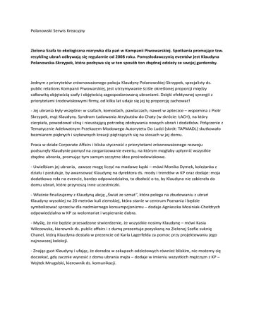 Polanowski Serwis Kreacyjny Zielona Szafa to ekologiczna rozrywka dla pań w Kompanii Piwowarskiej. Spotkania promujące tzw. recykling ubrań odbywają się regularnie od 2008 roku. Pomysłodawczynią eventów jest Klaudyna Polanowska-Skrzypek, która pozbywa się w ten sposób ton zbędnej odzieży ze swojej garderoby. Jednym z priorytetów zrównoważonego pokoju Klaudyny Polanowskiej-Skrzypek, specjalisty ds. public relations Kompanii Piwowarskiej, jest utrzymywanie ściśle określonej proporcji między całkowitą objętością szafy i objętością zagospodarowaną ubraniami. Dzięki efektywnej synergii z priorytetami środowiskowymi firmy, od kilku lat udaje się jej tę proporcję zachować! - Jej ubrania były wszędzie: w szafach, komodach, pawlaczach, nawet w apteczce – wspomina z Piotr Skrzypek, mąż Klaudyny. Syndrom Ładowania Atrybutów do Chaty (w skrócie: ŁACH), na który cierpiała, powodował silną i nieustającą potrzebę zdobywania nowych ubrań i dodatków. Połączenie z Tematycznie Adekwatnym Przekazem Modowego Autorytetu Do Ludzi (skrót: TAPMADL) skutkowało bezmiarem pięknych i szykownych kreacji piętrzących się na stosach w jej domu. Praca w dziale Corporate Affairs i bliska styczność z priorytetami zrównoważonego rozwoju podsunęły Klaudynie pomysł na zorganizowanie eventu, na którym mogłaby upłynnić wszystkie zbędne ubrania, promując tym samym szczytne idee prośrodowiskowe. - Uwielbiam jej ubrania, zawsze mogę liczyć na modowe kąski – mówi Monika Dymek, koleżanka z działu i postuluje, by awansować Klaudynę na dyrektora ds. mody i trendów w KP oraz dodaje: moja dodatkowa rola na evencie, bardzo odpowiedzialna, to dbałość o to, by Klaudyna nie zabierała do domu ubrań, które przynoszą inne uczestniczki. - Właśnie finalizujemy z Klaudyną akcję „Świat ze szmat”, która polega na zbudowaniu z ubrań Klaudyny wysokiej na 20 metrów kuli ziemskiej, która stanie w centrum Poznania i będzie symbolizować sprzeciw dla nadmiernego konsumpcjonizmu – dodaje Agnieszka Mosiniak-Chołdrych odpowiedzialna w KP za wolontariat i wspieranie dobra. - Myślę, że nie będzie przesadzone stwierdzenie, że wszystkie nosimy Klaudynę – mówi Kasia Wilczewska, kierownik ds. public affairs i z dumą prezentuje pozyskaną na Zielonej Szafie suknię Chanel, którą Klaudyna dostała w prezencie od Karla Lagerfelda za pomoc przy projektowaniu jego najnowszej kolekcji. - Znając gust Klaudyny i ufając, że doradza w zakupach odzieżowych również bliskim, nie możemy się doczekać, gdy zacznie wynosić z domu ubrania męża – dodaje w imieniu wszystkich mężczyzn z KP – Wojtek Mrugalski, kierownik ds. komunikacji.