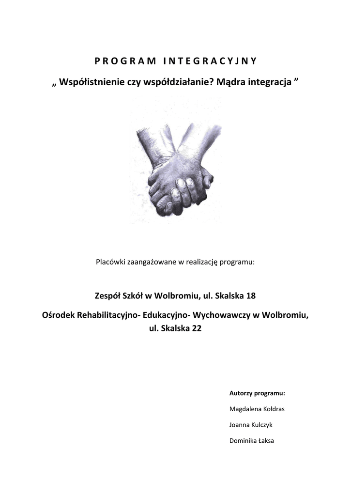 PROGRAM INTEGRACYJNY „ Współistnienie czy współdziałanie? Mądra integracja ” Placówki zaangażowane w realizację programu: Zespół Szkół w Wolbromiu, ul. Skalska 18 Ośrodek Rehabilitacyjno- Edukacyjno- Wychowawczy w Wolbromiu, ul. Skalska 22 Autorzy programu: Magdalena Kołdras Joanna Kulczyk Dominika Łaksa PROGRAM INTEGRACYJNY „ Współistnienie czy współdziałanie? Mądra integracja ” Wstęp Hasło integracja - od łacioskiego integrare – scalid, w szerokim znaczeniu wyraża się w takim wzajemnym stosunku pełno- i niepełnosprawnych, w którym są respektowane takie same prawa, liczą się takie same wartości, w których stwarza się obu grupom identyczne warunki do maksymalnego, wszechstronnego rozwoju. Integracja społeczna to zespolenie i zharmonizowanie elementów zbiorowości społecznej, rozumiane jako intensywnośd i częstotliwośd kontaktów między członkami danej zbiorowości oraz jako akceptacja w jej obrębie wspólnych systemów wartości, norm, ocen. Kierunek tego rodzaju działao określa się mianem „życia w jak najmniej ograniczającym środowisku”. Ostatnie lata, a zwłaszcza aktywne działania osób niepełnosprawnych na całym świecie, zaowocowały nowym rozumieniem niepełnosprawności, a co za tym idzie, procesu integracji społecznej. I tak w społecznym ujęciu niepełnosprawności przyczynę jej powstawania upatruje się nie w jednostce, lecz w jej środowisku zewnętrznym i istniejących w nim barierach społecznych, ekonomicznych i fizycznych. Uważa się, że niepełnosprawnośd powstaje wskutek ograniczeo doświadczanych przez osoby nią dotknięte, takich jak indywidualne uprzedzenia, utrudniony dostęp do budownictwa użyteczności publicznej, niedostosowany system transportu, segregacyjna edukacja, rozwiązania na rynku pracy, często wyłączające z niego osoby niepełnosprawne. W efekcie tych niekorzystnych warunków społecznych osoby dotknięte niepełnosprawnością są niejako zmuszane nie tylko do przyjęcia swojej roli „upośledzonego”, ale także do akceptacji jej niezmienności. W związku z powyższym można stwierdzid, iż tak naprawdę niepełnosprawnośd nie jest czymś, z czym przychodzi się na świat, ale czymś, co powstaje wskutek zderzenia możliwości rozwojowych danej jednostki z wymaganiami i warunkami panującymi w danym społeczeostwie. Dyskryminacja nie jest więc problemem wynikającym z ograniczeo ludzi z niepełnosprawnością, lecz z postaw i nastawienia otoczenia. Żyjemy bowiem w kulturze, która w wysokim stopniu preferuje zdrowie, sprawnośd i urodę, a jednocześnie silnie deprecjonuje chorobę, starośd, cierpienie. Ceniona jest samodzielnośd, zaradnośd, osiąganie sukcesów. Coraz silniej uwidaczniają się postawy hedonistyczno - konsumpcyjne i zaabsorbowanie własną osobą przy jednoczesnym braku zainteresowania innymi ludźmi. Wszystko to sprawia, że gloryfikowane są takie wartości i modele życia, które większośd osób 2 PROGRAM INTEGRACYJNY „ Współistnienie czy współdziałanie? Mądra integracja ” niepełnosprawnych stawiają na przegranej pozycji i są w konflikcie z ideą integracji, utrudniając wprowadzanie jej w życie. Przeszkodami dla integracji są również bariery świadomościowe istniejące w sprawnych członkach społeczeostwa. Wynikają one często z lęku w obliczu odmienności, niewiedzy i niezrozumienia, kim są ludzie niepełnosprawni, braku interakcji z nimi, negatywnych wyobrażeo o niepełnosprawności (osoba niepełnosprawna to osoba niepełnowartościowa). Wywołują biernośd bądź postawy negatywne, a nawet wrogośd względem niepełnosprawnych. Jeżeli zatem to społeczeostwo jest podstawową siłą sprawczą procesu dochodzenia do stanu upośledzenia, zwłaszcza w społeczeostwie należy szukad sił przeciwdziałających dewiacji. Do zadao społeczeostwa należy więc eliminowanie, zmniejszanie lub kompensowanie barier, tak aby każdej osobie umożliwid korzystanie z dóbr publicznych, jednocześnie respektując jej prawa i przywileje. Integracja niepełnosprawnych zatem nie ma polegad na dopasowywaniu ich do życia w niezmienionym środowisku, lecz prowadzid do wzajemnego połączenia się światów niepełnosprawnych i sprawnych w nową całośd, gdzie każda ze stron musi dokonad pewnej określonej zmiany. Trzeba sobie uzmysłowid fakt, że nie tylko osoby „zdrowe” mogą wiele ofiarowad niepełnosprawnym, ale i niepełnosprawni mogą ich życie czymś ubogacid. Należy stale korygowad nasze spojrzenie na problem integracji niepełnosprawnych – nie mamy ich bowiem jedynie „włączad” do naszego życia, ale stworzyd przestrzeo, w której rozwijad się i godnie żyd będą mogli zarówno zdrowi, jak i niepełnosprawni. Cele ogólne: zwiększenie zainteresowania społecznego problemem niepełnosprawności i niwelowanie skutków negatywnych przekonao, szerzenie wartości tolerancji i integracji społecznej. Cele szczegółowe: kształtowanie postawy pełnej zrozumienia i szacunku w stosunku do osób niepełnosprawnych, aktywizacja środowiska szkolnego poprzez zaangażowanie uczniów w realizację programu, 3 PROGRAM INTEGRACYJNY „ Współistnienie czy współdziałanie? Mądra integracja ” propagowanie idei wolontariatu, zdobycie i poszerzenie wiedzy z zakresu metod pracy z dziedmi niepełnosprawnymi, podejmowanie działao na rzecz integracji z osobami z dysfunkcjami, umożliwienie wychowankom Ośrodka Rehabilitacyjno – Edukacyjno - - Wychowawczego w Wolbromiu udziału w życiu szkoły poprzez uczestnictwo w imprezach edukacyjnych, zainteresowanie uczniów możliwością pracy w zawodzie terapeuty, pedagoga, rehabilitanta, psychologa itp., doskonalenie umiejętności społecznych takich jak: współpraca w grupie skuteczna komunikacja pomoc potrzebującym planowanie i koordynowanie działao kreatywnośd rozwijanie zainteresowao artystycznych i nabycie umiejętności posługiwania się językiem obcym w wybranym za