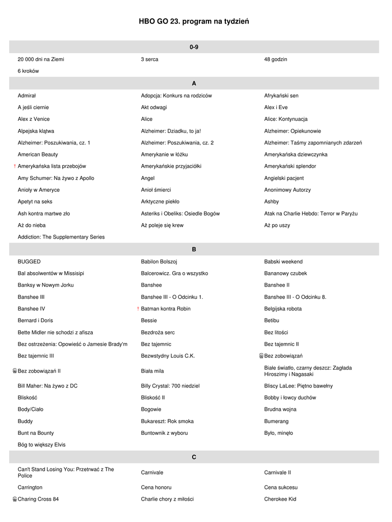 HBO GO 23. program na tydzień 0-9 20 000 dni na Ziemi 3 serca 48 godzin 6 kroków A Admirał Adopcja: Konkurs na rodziców Afrykański sen A jeśli ciernie Akt odwagi Alex i Eve Alex z Venice Alice Alice: Kontynuacja Alpejska klątwa Alzheimer: Dziadku, to ja! Alzheimer: Opiekunowie Alzheimer: Poszukiwania, cz. 1 Alzheimer: Poszukiwania, cz. 2 Alzheimer: Taśmy zapomnianych zdarzeń American Beauty Amerykanie w łóżku Amerykańska dziewczynka Amerykańska lista przebojów Amerykańskie przyjaciółki Amerykański splendor Amy Schumer: Na żywo z Apollo Angel Angielski pacjent Anioły w Ameryce Anioł śmierci Anonimowy Autorzy Apetyt na seks Arktyczne piekło Ashby Ash kontra martwe zło Asteriks i Obeliks: Osiedle Bogów Atak na Charlie Hebdo: Terror w Paryżu Aż do nieba Aż poleje się krew Aż po uszy Addiction: The Supplementary Series B BUGGED Babilon Bolszoj Babski weekend Bal absolwentów w Missisipi Balcerowicz. Gra o wszystko Bananowy czubek Banksy w Nowym Jorku Banshee Banshee II Banshee III Banshee III - O Odcinku 1. Banshee III - O Odcinku 8. Banshee IV Batman kontra Robin Belgijska robota Bernard i Doris Bessie Betibu Bette Midler nie schodzi z afisza Bezdroża serc Bez litości Bez ostrzeżenia: Opowieść o Jamesie Brady'm Bez tajemnic Bez tajemnic II Bez tajemnic III Bezwstydny Louis C.K. Bez zobowiązań Bez zobowiązań II Biała mila Białe światło, czarny deszcz: Zagłada Hiroszimy i Nagasaki Bill Maher: Na żywo z DC Billy Crystal: 700 niedziel Bliscy LaLee: Piętno bawełny Bliskość Bliskość II Bobby i łowcy duchów Body/Ciało Bogowie Brudna wojna Buddy Bukareszt: Rok smoka Bumerang Bunt na Bounty Buntownik z wyboru Było, minęło Bóg to większy Elvis C Can't Stand Losing You: Przetrwać z The Police Carnivale Carnivale II Carrington Cena honoru Cena sukcesu Charing Cross 84 Charlie chory z miłości Cherokee Kid Chicago Chuck Norris kontra komunizm Chłopaki Chłopiec ze skazą Ciało pedagogiczne Cinema Verite Ciężkie czasy na Long Island Cmentarz Narodowy w Arlington: Kwatera sześćdziesiąta Co było, a nie jest Cop Land Coś jest nie tak z ciocią Diane Cyberszantaż Cyrk Czarni bracia Czarny tygrys Czarny węgiel, kruchy lód Czasem w kwietniu Czas przemian Czekając na sobotę Czekolada Czekoladowe miasto Cześć, Carter Cześć, pajacu Czterdziesty pierwszy Czterej bracia Cztery małe dziewczynki Czy ktoś widział Andy'ego? Czysta krew Czysta krew II Czysta krew III Czysta krew IV Czysta krew V Czysta krew VI Czysta krew VII Czysta krew VII: blog Jessiki Czysta krew VII: blog Jessiki Czytadło Człowiek ptak Cathouse Cathouse II. Crashbox D Darling I Lowe Ju Darwin i wrogowie ewolucji David McCullough maluje słowami Decydujący głos Deep Love Demony z Abu Ghraib Detektyw Detektyw II Diabelskie polowanie Diagnoza Dla Nedy Doberman Dobra robota: Nowojorscy strażacy Dobre zabijanie Dojrzewanie z poślizgiem Do końca Dolina Krzemowa Dolina Krzemowa II Dolina Krzemowa III Dom Saddama Dom grozy III Dowód Droga do Palomy Droga ku wojnie Druga wojna secesyjna Drużyna Duch salsy Dumni alfonsi i ich pokorne prostytutki Dumni i wściekli Dwa światy: Historia miłosna Dym Dziadek i ja Dzieci Boga: zagubione i odnalezione Dzieci niebios Dziecięcy ogród poezji Dziecko diabła Dziecko miłości Dziedzictwo Ferramontich Dziedzictwo grzechu: Historia Williama Coita Dziedziczka egzekucji Dziennik panny służącej Dziewczyna do towarzystwa Dziewczyna w rzece: Cena wybaczenia Dziewczyna z książek Dziewczyna z plakatu Dziewczynka z kotem Dziewczyny Dziewczyny II Dziewczyny III Dziewczyny IV Dziewczyny V Dzień, w którym narodziliśmy się na nowo Dzień sądu Dziękuję, panie prezydencie: Helen Thomas w Białym Domu E Ebola Eden Eden Edukacja Dee Dee Ricks Edukacja Mohammada Husseina Edukacja dla opornych Einstein i Eddington Ekipa Ekipa II Ekipa III Ekipa IV Ekipa V Ekipa VI Ekipa VII Ekipa VIII Ekspres polarny El Diablo Ella zaklęta Emma Empire Falls, cz. 1 Empire Falls, cz. 2 Epitafia II Europejskie Nagrody Filmowe 2015 Eurotrip Eva i Leon F Fabryka Triangle: Pamięć o pożarze Fabryki śmierci Faceci do wynajęcia Falcone Fargo Fałszywy trop Feliks i Meira Feniks Figurantka Figurantka Figurantka III Figurantka IV Figurantka V Filmy i gwiazdy VIII Flight of the Conchords Flight of the Conchords II Flintstonowie: Wielkie łubu-dubu Focus Fort Apache, Bronx Fort Bliss Foxcatcher Francuska krew Frank Freddie Roach Frida Funny or Die prezentuje Funny or Die prezentuje II Futro: portret wyobrażony Diane Arbus G Gang szklanych kulek Garderobiany Gdy milkną fanfary Generation Kill: Czas wojny Genesis Potini George Lopez: To nie moja wina Ghadi Gia Git Glickman Globalny gracz Gorejący krzew Gorąca kawa Gorące ciała Gorące ciała II Gorący pościg Gra O Tron: Dany a ukrzyżowanie Panów Gra O Tron: Kulisy odcinka 1. Gra O Tron: Kulisy odcinka 1. Gra O Tron: Kulisy odcinka 1. Gra O Tron: Kulisy odcinka 1. Gra O Tron: Kulisy odcinka 2. Gra O Tron: Kulisy odcinka 3. Gra O Tron: Kulisy odcinka 4. Gra O Tron: Kulisy odcinka 5. Gra O Tron: Kulisy odcinka 6. Gra O Tron: Littlefinger a śmierć Joffreya Gra O Tron: Ogar i Arya Gra O Tron:proces Tyriona. Gra O Tron:przewodnik - Zeznanie Shae Gra O Tron:przewodnik - Żelazny Bank z Braavos Gra Ripleya Grace szuka faceta Gracz Gracze Gracze: Kulisy odcinka 8. Granice wolności słowa Gra o tron I. Gra o tron II Gra o tron III Gra o tron IV Gra o tron IV: Kulisy odcinka 9. Gra o tron IV: przewodnik - Koronacja Tommena Gra o tron IV: przewodnik - Mistrz Meereen Gra o tron IV: przewodnik - O Krwawej Bramie Gra o tron IV: przewodnik. Brienne przeciwko Ogarowi Gra o tron IV: przewodnik. Dlaczego Stannis zaatakował dzikich Gra o tron IV: przewodnik. Obrona Czarnego Zamku Gra o tron IV: przewodnik. Spotkanie Jona z Ygritte Gra o tron V Gra o tron VI Gra o tron V - dzień na planie produkcji Greg Louganis znów na trampolinie Grób Roseanny Gwałt w małym miasteczku: Historia Florence Holway Gwiazdy XXX - p