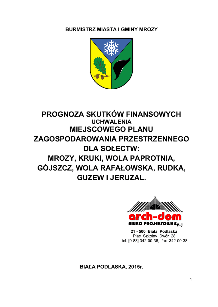 BURMISTRZ MIASTA I GMINY MROZY PROGNOZA SKUTKÓW FINANSOWYCH UCHWALENIA MIEJSCOWEGO PLANU ZAGOSPODAROWANIA PRZESTRZENNEGO DLA SOŁECTW: MROZY, KRUKI, WOLA PAPROTNIA, GÓJSZCZ, WOLA RAFAŁOWSKA, RUDKA, GUZEW I JERUZAL. 21 - 500 Biała Podlaska Plac Szkolny Dwór 28 tel. [0-83] 342-00-36, fax 342-00-38 BIAŁA PODLASKA, 2015r. 1 Prognoza została opracowana przez: BIURO PROJEKTOWE „arch – dom” Sp.j. PLAC SZKOLNY DWÓR 28 21 – 500 BIAŁA PODLASKA tel. (083) – 342 – 00 – 36, fax. (083) 342 – 00 – 38 w składzie: generalny projektant: mgr inż. arch. Henryk Dołęgowski - upr. urb. 812/89 zespół generalnego projektanta: mgr inż. Łukasz Kozłowski mgr inż. arch. Agnieszka Cajgner - Olędzka 2 SPIS TREŚCI ROZDZIAŁ I ........................................................................................................................................ 4 1. Informacje ogólne................................................................................................................ 4 2. Spotykane metody oceny skutków ustaleń miejscowych planów zagospodarowania przestrzennego ............................................................................................................................... 5 2.1. Metoda znaków odchyleń od średniej wielkości cechy ....................................................... 5 2.2. Metoda rang ........................................................................................................................ 5 2.3. Elementy, które winna zawierać prognoza skutków finansowych ustaleń miejscowego planu zagospodarowania przestrzennego ...................................................................................... 5 2.4. Prognoza opłaty planistycznej ............................................................................................ 6 2.5. Zmiany w podatku od nieruchomości ................................................................................. 7 2.6. Opłaty adiacenckie .............................................................................................................. 7 2.7. Sprzedaż nieruchomości gminnych ......................................................................................... 8 2.8. Wydatki gminy związane z uchwaleniem miejscowego planu zagospodarowania przestrzennego ............................................................................................................................... 8 ROZDZIAŁ II ....................................................................................................................................... 8 1. Cel i zakres prognozy ......................................................................................................... 8 2. Podstawa prawna opracowania prognozy i jej aktualność ................................................. 8 3. Metodyka sporządzania prognozy ...................................................................................... 8 4. Opis gruntów objętych zmianą przeznaczenia .................................................................. 9 ROZDZIAŁ III .................................................................................................................................... 11 1. Prognoza finansowa ......................................................................................................... 11 1.1. Prognoza opłaty planistycznej .......................................................................................... 11 1.2. Zmiany w podatku od nieruchomości ............................................................................... 12 1.3. Opłaty adiacenckie ............................................................................................................ 12 1.4. Prognoza odszkodowań związanych ze spadkiem wartości od nieruchomości ............... 12 1.5. Sprzedaż nieruchomości ................................................................................................... 12 1.6. Wydatki z związane z zakupem nieruchomości................................................................ 12 1.7. Wydatki związane z realizacją infrastruktury technicznej ................................................. 12 1.8. Podatek od infrastruktury technicznej ............................................................................... 12 2. Wnioski dotyczące obciążeń finansowych budżetu wynikające z ustaleń zmian miejscowego planu zagospodarowania przestrzennego gminy Mrozy. ....................................... 13 2.1. Prognozowane wpływy do budżetu gminy z opłaty planistycznej .................................... 13 2.2. Prognozowane wpływy z podatku od nieruchomości ....................................................... 13 2.3. Prognozowane wpłaty z opłat adiacenckich ..................................................................... 13 2.4. Prognozowane wydatki związane z odszkodowaniem związanym ze spadkiem wartości nieruchomości ............................................................................................................................... 13 2.5. Prognozowane dochody związane ze sprzedażą nieruchomości ......................................... 13 2.6. Prognozowane wydatki związane z zakupem nieruchomości ............................................... 13 2.7. Prognozowane wydatki związane z realizacją infrastruktury technicznej ......................... 13 2.8. Prognozowane dochody z podatku od nieruchomości infrastruktury technicznej ................ 13 3. Bilans wpływów i wydatków .............................................................................................. 13 4. Wnioski.............................................................................................................................. 14 Materiały źródłowe: ....................................................................................................................... 14 3 ROZDZIAŁ I 1. Informac