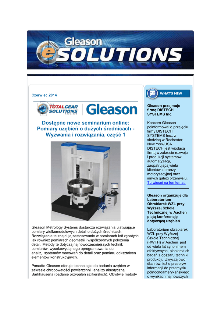 Czerwiec 2014 Gleason przejmuje firmę DISTECH SYSTEMS Inc. Dostępne nowe seminarium online: Pomiary uzębień o dużych średnicach Wyzwania i rozwiązania, część 1 Koncern Gleason poinformował o przejęciu firmy DISTECH SYSTEMS Inc., z siedzibą w Rochester, New York/USA. DISTECH jest wiodącą firmą w zakresie rozwoju i produkcji systemów automatyzacji, zaopatrującą wielu klientów z branży motoryzacyjnej oraz innych gałęzi przemysłu. Tu więcej na ten temat. ____________________ Gleason organizuje dla Laboratorium Obrabiarek WZL przy Wyższej Szkole Technicznej w Aachen piątą konferencję dotyczącą uzębień Gleason Metrology Systems dostarcza rozwiązania ułatwiające pomiary wielkomodułowych detali o dużych średnicach. Rozwiązania te znajdują zastosowanie w pomiarach kół zębatych jak również pomiarach geometrii i współrzędnych położenia detali. Metody te dotyczą najnowocześniejszych technik pomiarów, wysokowydajnego oprogramowania do analiz, systemów mocowań do detali oraz pomiaru odkształceń elementów konstrukcyjnych. Ponadto Gleason oferuje technologie do badania uzębień w zakresie chropowatości powierzchni i analizy akustycznej Barkhausena (badanie przypaleń szlifierskich). Obydwie metody Laboratorium obrabiarek WZL przy Wyższej Szkole Technicznej (RWTH) w Aachen jest od wielu lat synonimem efektywnych, pionierskich badań z obszaru techniki produkcji. Zwyczajowo dba również o przepływ informacji do przemysłu północnoamerykańskiego o wynikach najnowszych są proste w obsłudze dla użytkownika i włączone w platformę maszyn GMS (Gleason Metrology Systems). Z jednej strony - oszczędza to przestrzeń, jako że nie są wymagane żadne dodatkowe urządzenia, z drugiej strony - nie potrzeba skomplikowanego i kosztownego procesu kalibracji i obsługi eksploatacyjnej. Dennis Traynor - szef sprzedaży firmy Gleason Metrology Systems prezentuje podczas seminarium rozwiązania kilku najczęściej występujących problemów i wyzwań, przy pomiarach uzębień w kołach o dużych średnicach. Tu można zobaczyć pierwszą część seminarium online. (wymagana prosta, jednorazowa rejestracja) Wyszkolony personel przyczynia się do lepszych wyników! Gleason posiada bogate doświadczenie w produkcji maszyn i urządzeń do wytwarzania kół zębatych. Firma ta oferuje swoim klientom możliwość uczestniczenia w wielu seminariach, kursach, szkoleniach i prezentacjach w obiektach produkcyjnych i biurowych Gleason oraz na targach. Kursy szkoleniowe w zakładach produkcyjnych, seminaria online i programy szkoleń offline, poczynając od teorii kół zębatych a kończąc na temacie utrzymania maszyny: - Oferując ponad 60 różnorodnych kursów i seminariów firma Gleason -Solutions Provider ™, dostarcza unikalną i najbardziej rozległą wiedzę branżową z dziedziny uzębień. Osiągnięcie optymalnej wydajności urządzeń produkowanych przez Gleason jest związane z systematycznym podnoszeniem kwalifikacji personelu obsługi i utrzymania. Tu więcej na ten temat – możliwość zarezerwowania kursu już teraz! badań. Tradycja ta jest właśnie kontynuowana poprzez zorganizowanie w dniach 22-23 października piątego forum uzębieniowego w firmie Gleason Works zakładzie koncernu Gleason w Rochester, New York/USA. Odbędą się liczne prezentacje z dziedziny projektowania kół stożkowych i walcowych, produkcji, badań i pomiarów uzębień. Uczestnicy będą mieli możliwość zwiedzenia zakładu produkcyjnego Gleason i zapoznania się z najnowszymi osiągnięciami z zakresu techniki Gleason. Dalsze informacje dotyczące konferencji i rejestracji uczestników zostaną podane wkrótce. ____________________ W roku 2015 Gleason świętuje szczególny jubileusz: 150 lat innnowacji Gleason Jeśli pamiętają Państwo jakieś szczególne wydarzenie lub historię związaną z firmą Gleason, prosimy w imieniu Gleason o jej udostępnienie Wkrótce ukaże się specjalna strona internetowa, poświęcona „kamieniom milowym“ w historii tej firmy. Vietnam Manufacturing Expo Gleason wspiera chińskie przedsiębiorstwo Zhejiang Shuanghuan Driveline Co. Ltd. w realizacji ambitnych celów Chińskie przedsiębiorstwo Zhejiang Shuanghuan Driveline Co. Ltd. postawiło sobie za cel stać się wiodącym, światowym producentem kół zębatych i wałów. Od chwili swego powstania w roku 2006 firma ta osiągnęła nadzwyczajne postępy i dokonała wielu inwestycji, aby osiągnąć ten cel. Przykładowo, należąca do tej grupy firma Jiangsu Shunanghuan dysponuje powierzchnią produkcyjną wynoszącą 350.000 m² do wytwarzania kół zębatych stożkowych z zębami łukowymi. Znajduje się tam 15 maszyn Gleason do obróbki kół zębatych stożkowych o modułach od 3 mm do 15 mm. Tu więcej na ten temat. Hanoi, Wietnam 27- 29 sierpnia 2014 IMTS Chicago, Illinois/USA 8 – 13 września 2014 AMB Stuttgart, Niemcy 16 – 20 września 2014 MSV Brünn Brünn, Czechy od 29 września do 3 października 2014 Plovdiv International Technical Fair Płowdiw, Bułgaria od 30 września do 4 października 2014 Maktek Stambuł, Turcja 14 – 19 października 2014 JIMTOF Tokio, Japonia od 30 października do 4 listopada 2014 Wyłączny przedstawiciel Gleason w Polsce EUROPEAN TECHNOLOGY Sp. z o.o., Sp. k. ul. Libijska 10 03 – 977 Warszawa http://www.eurotec.pl Osoby kontaktowe: Obrabiarki, maszyny pomiarowe: Szymon Ratajczak [email protected] Serwis, części zamienne, narzędzia, systemy mocowań: Beata Czarnecka [email protected] Tel. (22) 617 46 41 Fax (22) 616 31 09 Aby uzyskać więcej informacji o rozwiązaniach z zakresu produkcji kół zębatych, prosimy o kontakt z nami. [email protected] | Gleason Corporation, 1000 University Ave, Rochester, NY 14692 Copyright © 2014. All Rights Reserved.