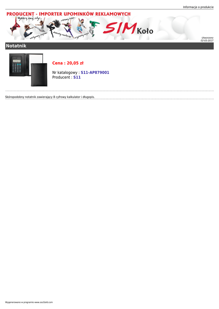 Informacje o produkcie Utworzono 02-03-2017 Notatnik Cena : 20,05 zł Nr katalogowy : S11-AP879001 Producent : S11 Skóropodobny notatnik zawierający 8 cyfrowy kalkulator i długopis. Wygenerowano w programie www.oscGold.com