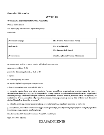Sygn. akt I ACa 1754/15 WYROK W IMIENIU RZECZYPOSPOLITEJ POLSKIEJ Dnia 31 marca 2016 r. Sąd Apelacyjny w Krakowie – Wydział I Cywilny w składzie: Przewodniczący: SSA Hanna Nowicka de Poraj Sędziowie: SSA Józef Wąsik SSA Teresa Rak (spr.) Protokolant: st.sekr.sądowy Urszula Kłosińska po rozpoznaniu w dniu 31 marca 2016 r. w Krakowie na rozprawie sprawy z powództwa T. H. przeciwko Towarzystwu (...) S.A. w W. o zapłatę na skutek apelacji obu stron od wyroku Sądu Okręgowego w Nowym Sączu z dnia 28 września 2015 r. sygn. akt I C 682/14 1. zmienia zaskarżony wyrok w punkcie I w ten sposób, że wymienioną w nim kwotę 69 730,77 zł obniża do kwoty 34 037,37 zł (trzydzieści cztery tysiące trzydzieści siedem złotych i trzydzieści siedem groszy) i również w tym zakresie powództwo oddala oraz w punkcie III w ten sposób, że nadaje mu treść: „zasądza od powoda na rzecz strony pozwanej kwotę 609 zł (sześćset dziewięć złotych) tytułem kosztów procesu”; 2. oddala apelację strony pozwanej w pozostałej części, a apelację powoda w całości; 3. zasądza od powoda na rzecz strony pozwanej kwotę 2 500 zł (dwa tysiące pięćset złotych) tytułem kosztów postępowania apelacyjnego. SSA Teresa Rak SSA Hanna Nowicka de Poraj SSA Józef Wąsik Sygn. akt I ACa 1754/15 UZASADNIENIE Powód T. H. wniósł o zasądzenie od strony pozwanej Towarzystwa (...) S.A. w W. kwoty 8.407,87 zł z odsetkami ustawowymi od dnia 22 stycznia 2012 r. do dnia zapłaty oraz kwoty 125.730,60 zł wraz z odsetkami ustawowymi od dnia 16 lipca 2013 r. do dnia zapłaty oraz kosztami procesu. Na uzasadnienie wskazał, że w dniu 23 grudnia 2011 r. w miejscowości F. kierując samochodem F. (...) nr rej. (...), uczestniczył w kolizji drogowej, której sprawcą był kierujący samochodem osobowym marki V. (...) nr rej. (...) K. L., który posiadał ubezpieczenie OC u strony pozwanej. W dniu następnym powód zgłosił szkodę majątkową. Naprawa samochodu okazała się ekonomicznie nieuzasadniona, dlatego powstała szkoda stanowić będzie różnicę pomiędzy wartością pojazdu określoną na kwotę 30.200 zł, a wartością wraku pojazdu w stanie uszkodzonym w wysokości 13.400 zł. Odszkodowanie ustalono na 16.800 zł. Pozwana odmówiła powodowi wypłaty odszkodowania do czasu ustalenia przez Sąd Rejonowy w N. odpowiedzialności sprawcy kolizji, co miało miejsce w dniu 4 grudnia 2013 r. 24 grudnia powód zmuszony był wynająć samochód zastępczy i wynajął samochód marki V. (...) o nr rej. (...) za kwotę 190 zł netto za dobę. Samochód był powodowi niezbędny dla dojazdu do pracy i normalnego funkcjonowania rodziny. Z powodu niewypłacenia odszkodowania powód nie był w stanie sfinansować zakupu nowego samochodu, dlatego powód przedłużał najem na kolejne okresy do 15 czerwca 2013 r., Kiedy to stał się użytkownikiem samochodu służbowego F. (...). Po zwrocie auta wynajmujący wystawił fakturę pro forma za cały okres najmu na kwotę 125.730,60 zł. Po nieprawomocnym zakończeniu postępowania karnego powód sprzedał uszkodzony samochód za kwotę 5.200 zł. Powód zgłosił żądanie zapłaty kwoty 125.730,60 zł za najem samochodu, 250 zł za usunięcie i transport samochodu z miejsca zdarzenia. W odpowiedzi strona pozwana poinformowała powoda o przyznaniu odszkodowania w kwocie 16.800 zł. Domagał się też zapłaty 8.200 zł jako różnicy pomiędzy wartością rynkową samochodu w stanie nieuszkodzonym 30.200 zł, a wypłaconym przez ubezpieczyciela odszkodowaniem w kwocie 16.800 zł oraz rzeczywiście uzyskaną kwotą za sprzedaż wraku, 5.200 zł i 207.87 zł za umieszczenie ogłoszenia sprzedaży pozostałości samochodu w Internecie. Strona pozwana Towarzystwo (...) S.A. w W. domagała się oddalenia powództwa i zasądzenia kosztów postępowania. Przyznała, że prowadziła postępowanie likwidacyjne szkody powoda, przyznała odszkodowanie w kwocie 16.800 zł, wypłaciła też odszkodowanie za holowanie pojazdu. Odmówiła natomiast uwzględnienia szkody wynikłej z kosztów najmu pojazdu zastępczego podnosząc, że skoro pojazd nie podlegał naprawie, brak podstaw do zwrotu kosztów najmu pojazdu zastępczego. Powód nie wykazał roszczenia, a faktura pro forma nie jest dokumentem potwierdzającym faktycznie poniesione koszty. Zwrotowi podlegają jedynie koszty celowe i uzasadnione, nie mogą być więc to wydatki i nakłady nadmierne. Przedłużający się okres najmu samochodu generując wartość odpowiadającą 748% szkody w pojeździe, powinien obciążać powoda, nie zaś towarzystwo ubezpieczeń. Nieuzasadnione jest także nakładanie na ubezpieczyciela obowiązku w zakresie pomocy przy sprzedaży oraz pokrywaniu kosztów z tym związanych. Wyrokiem z dnia 28 września 2015 r. Sąd Okręgowy w Nowym Sączu zasądził od strony pozwanej na rzecz powoda kwotę 69.730,77 zł z ustawowymi odsetkami od dnia 05 kwietnia 2014 roku do dnia zapłaty i oddalił powództwo w pozostałym zakresie oraz zasądził od strony pozwanej na rzecz powoda kwotę 3.327,04 zł tytułem zwrotu kosztów procesu. Rozstrzygnięcie wydał Sąd w oparciu o następująco ustalony stan faktyczny: Powód wraz z żoną i córkami zamieszkuje w D.. Rodzina dysponowała jednym samochodem F. (...) nr rej. (...). Samochód był wykorzystywany w codziennym życiu rodziny, powód dojeżdżał nim do pracy, woził córki do przedszkola, do lekarzy, rodzina odbywała wycieczki poza miejsce zamieszkania, odwiedziny u rodziny. Powód pracował w firmie (...) sp. z o.o. w S.. Na Święta Bożego Narodzenia w 2011 roku powód z rodziną przyjechał samochodem do rodziny żony do F.. W dniu 23 grudnia 2011 r. w miejscowości F. na drodze krajowej nr (...)doszło do kolizji drogowej, w wyniku której uszkodzeniu uległ samochód marki F. (...) o nr rej. (...) należący do powoda T. H.. Sprawcą kolizji drogowej był K. L. prowadzący samochód osobowy marki V. (...) nr rej. (...).