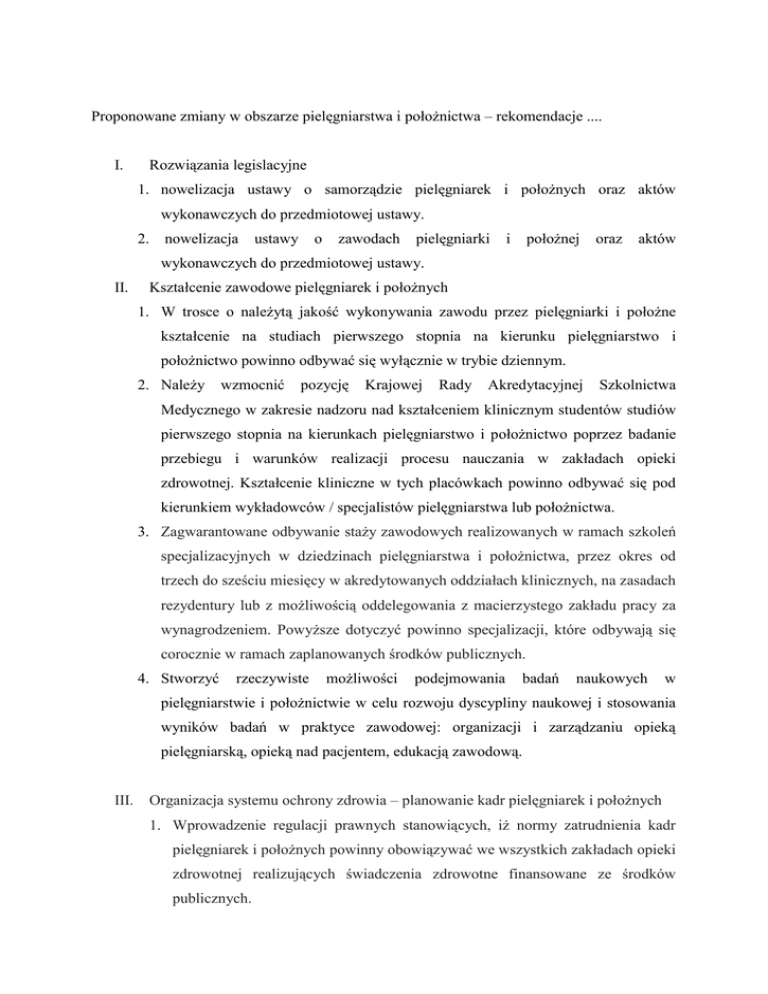 Proponowane zmiany w obszarze pielęgniarstwa i położnictwa – rekomendacje .... Rozwiązania legislacyjne I. 1. nowelizacja ustawy o samorządzie pielęgniarek i położnych oraz aktów wykonawczych do przedmiotowej ustawy. nowelizacja 2. ustawy o zawodach pielęgniarki i położnej oraz aktów wykonawczych do przedmiotowej ustawy. II. Kształcenie zawodowe pielęgniarek i położnych 1. W trosce o należytą jakość wykonywania zawodu przez pielęgniarki i położne kształcenie na studiach pierwszego stopnia na kierunku pielęgniarstwo i położnictwo powinno odbywać się wyłącznie w trybie dziennym. 2. Należy wzmocnić pozycję Krajowej Rady Akredytacyjnej Szkolnictwa Medycznego w zakresie nadzoru nad kształceniem klinicznym studentów studiów pierwszego stopnia na kierunkach pielęgniarstwo i położnictwo poprzez badanie przebiegu i warunków realizacji procesu nauczania w zakładach opieki zdrowotnej. Kształcenie kliniczne w tych placówkach powinno odbywać się pod kierunkiem wykładowców / specjalistów pielęgniarstwa lub położnictwa. 3. Zagwarantowane odbywanie staży zawodowych realizowanych w ramach szkoleń specjalizacyjnych w dziedzinach pielęgniarstwa i położnictwa, przez okres od trzech do sześciu miesięcy w akredytowanych oddziałach klinicznych, na zasadach rezydentury lub z możliwością oddelegowania z macierzystego zakładu pracy za wynagrodzeniem. Powyższe dotyczyć powinno specjalizacji, które odbywają się corocznie w ramach zaplanowanych środków publicznych. 4. Stworzyć rzeczywiste możliwości podejmowania badań naukowych w pielęgniarstwie i położnictwie w celu rozwoju dyscypliny naukowej i stosowania wyników badań w praktyce zawodowej: organizacji i zarządzaniu opieką pielęgniarską, opieką nad pacjentem, edukacją zawodową. III. Organizacja systemu ochrony zdrowia – planowanie kadr pielęgniarek i położnych 1. Wprowadzenie regulacji prawnych stanowiących, iż normy zatrudnienia kadr pielęgniarek i położnych powinny obowiązywać we wszystkich zakładach opieki zdrowotnej realizujących świadczenia zdrowotne finansowane ze środków publicznych. 2. Umocowanie prawne w zakresie obligatoryjnego postępowania konkursowego na kierownicze stanowiska pielęgniarek i położnych w zakładach opieki zdrowotnej niezależnie od formy prawnej tych zakładów. 3. Wynagrodzenia personelu medycznego, w tym pielęgniarek i położnych, gwarantujące realizację postulatu systematycznego wzrostu płac, powinny odzwierciedlać uzasadnione koszty procedur medycznych (w tym realne koszty personelu medycznego) i stanowić jedną z podstaw koszyka świadczeń gwarantowanych, a w konsekwencji określić wysokość kontraktów zawieranych ze świadczeniodawcami. 4. Kształcenie kadry specjalistów pielęgniarek i położnych w poszczególnych dziedzinach pielęgniarstwa, położnictwa należy prowadzić na podstawie planowanych potrzeb w systemie ochrony zdrowia i opieki społecznej, przyjmując między innymi, iż w przyszłości w oddziałach szpitalnych na każdej zmianie, powinno zatrudnić się jednego specjalistę odpowiedzialnego za planowanie, organizowanie i koordynowanie opieką pielęgniarską nad pacjentami.