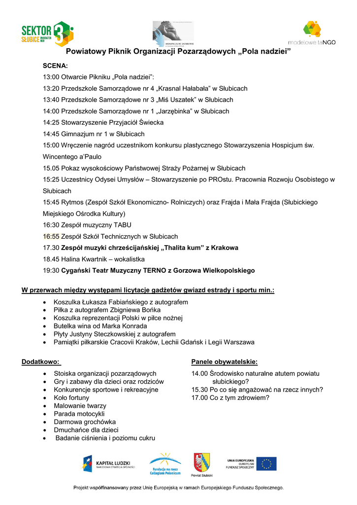 Powiatowy Piknik Organizacji Pozarządowych „Pola nadziei” SCENA: 13:00 Otwarcie Pikniku „Pola nadziei”: 13:20 Przedszkole Samorządowe nr 4 „Krasnal Hałabała” w Słubicach 13:40 Przedszkole Samorządowe nr 3 „Miś Uszatek” w Słubicach 14:00 Przedszkole Samorządowe nr 1 „Jarzębinka” w Słubicach 14:25 Stowarzyszenie Przyjaciół Świecka 14:45 Gimnazjum nr 1 w Słubicach 15:00 Wręczenie nagród uczestnikom konkursu plastycznego Stowarzyszenia Hospicjum św. Wincentego a’Paulo 15.05 Pokaz wysokościowy Państwowej Straży Pożarnej w Słubicach 15:25 Uczestnicy Odysei Umysłów – Stowarzyszenie po PROstu. Pracownia Rozwoju Osobistego w Słubicach 15:45 Rytmos (Zespół Szkół Ekonomiczno- Rolniczych) oraz Frajda i Mała Frajda (Słubickiego Miejskiego Ośrodka Kultury) 16:30 Zespół muzyczny TABU 16:55 Zespół Szkół Technicznych w Słubicach 17.30 Zespół muzyki chrześcijańskiej „Thalita kum” z Krakowa 18.45 Halina Kwartnik – wokalistka 19:30 Cygański Teatr Muzyczny TERNO z Gorzowa Wielkopolskiego W przerwach między występami licytacje gadżetów gwiazd estrady i sportu min.: Koszulka Łukasza Fabiańskiego z autografem Piłka z autografem Zbigniewa Bońka Koszulka reprezentacji Polski w piłce nożnej Butelka wina od Marka Konrada Płyty Justyny Steczkowskiej z autografem Pamiątki piłkarskie Cracovii Kraków, Lechii Gdańsk i Legii Warszawa Dodatkowo: Stoiska organizacji pozarządowych Gry i zabawy dla dzieci oraz rodziców Konkurencje sportowe i rekreacyjne Koło fortuny Malowanie twarzy Parada motocykli Darmowa grochówka Dmuchańce dla dzieci Badanie ciśnienia i poziomu cukru Panele obywatelskie: 14.00 Środowisko naturalne atutem powiatu słubickiego? 15.30 Po co się angażować na rzecz innych? 17.00 Co z tym zdrowiem?