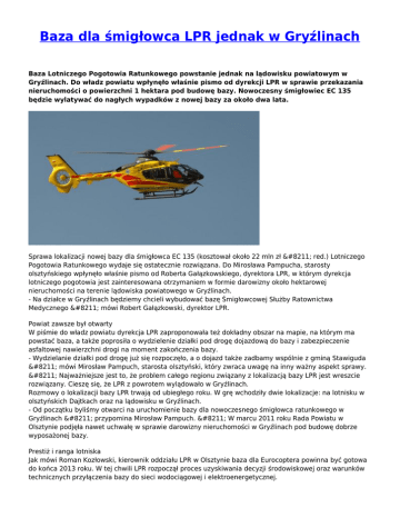 Baza dla śmigłowca LPR jednak w Gryźlinach Baza Lotniczego Pogotowia Ratunkowego powstanie jednak na lądowisku powiatowym w Gryźlinach. Do władz powiatu wpłynęło właśnie pismo od dyrekcji LPR w sprawie przekazania nieruchomości o powierzchni 1 hektara pod budowę bazy. Nowoczesny śmigłowiec EC 135 będzie wylatywać do nagłych wypadków z nowej bazy za około dwa lata. Sprawa lokalizacji nowej bazy dla śmigłowca EC 135 (kosztował około 22 mln zł – red.) Lotniczego Pogotowia Ratunkowego wydaje się ostatecznie rozwiązana. Do Mirosława Pampucha, starosty olsztyńskiego wpłynęło właśnie pismo od Roberta Gałązkowskiego, dyrektora LPR, w którym dyrekcja lotniczego pogotowia jest zainteresowana otrzymaniem w formie darowizny około hektarowej nieruchomości na terenie lądowiska powiatowego w Gryźlinach. - Na działce w Gryźlinach będziemy chcieli wybudować bazę Śmigłowcowej Służby Ratownictwa Medycznego – mówi Robert Gałązkowski, dyrektor LPR. Powiat zawsze był otwarty W piśmie do władz powiatu dyrekcja LPR zaproponowała też dokładny obszar na mapie, na którym ma powstać baza, a także poprosiła o wydzielenie działki pod drogę dojazdową do bazy i zabezpieczenie asfaltowej nawierzchni drogi na moment zakończenia bazy. - Wydzielanie działki pod drogę już się rozpoczęło, a o dojazd także zadbamy wspólnie z gminą Stawiguda – mówi Mirosław Pampuch, starosta olsztyński, który zwraca uwagę na inny ważny aspekt sprawy. – Najważniejsze jest to, że problem całego regionu związany z lokalizacją bazy LPR jest wreszcie rozwiązany. Cieszę się, że LPR z powrotem wylądowało w Gryźlinach. Rozmowy o lokalizacji bazy LPR trwają od ubiegłego roku. W grę wchodziły dwie lokalizacje: na lotnisku w olsztyńskich Dajtkach oraz na lądowisku w Gryźlinach. - Od początku byliśmy otwarci na uruchomienie bazy dla nowoczesnego śmigłowca ratunkowego w Gryźlinach – przypomina Mirosław Pampuch. – W marcu 2011 roku Rada Powiatu w Olsztynie podjęła nawet uchwałę w sprawie darowizny nieruchomości w Gryźlinach pod budowę dobrze wyposażonej bazy. Prestiż i ranga lotniska Jak mówi Roman Kozłowski, kierownik oddziału LPR w Olsztynie baza dla Eurocoptera powinna być gotowa do końca 2013 roku. W tej chwili LPR rozpoczął proces uzyskiwania decyzji środowiskowej oraz warunków technicznych przyłączenia bazy do sieci wodociągowej i elektroenergetycznej. - Tak nowoczesny śmigłowiec jak EC 135 potrzebuje bazy z prawdziwego zdarzenia z własną stacja paliw, hangarem i zapleczem socjalnym – mówi Roman Kozłowski. Kierownik oddziału LPR w Olsztynie dodaje, że fakt lokalizacji bazy w Gryźlinach nie ma znaczenia dla pacjentów. - Latamy w różnych kierunkach praktycznie na terenie całego województwa – mówi Roman Kozłowski. – Do „siódemki", na której często interweniujemy będziemy mieć nawet bliżej z Gryźlin niż z Olsztyna. Potem osoby potrzebujące pomocy transportujemy pod sam szpital. Z powstania bazy w Gryźlinach zadowolony jest także Jakub Woźniak, pełnomocnik starosty ds. zarządzania powiatowym lądowiskiem. - To podniesie prestiż i rangę naszego lotniska – uważa Jakub Woźniak. – Poza tym wpłynie też na rozwój lądowiska. Liczymy na owocną współpracę z LPR. Drukuj