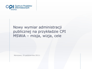 Nowy wymiar administracji publicznej na przykładzie CPI MSWiA – misja, wizja, cele Warszawa, 25 października 2011r. Agenda 2 Charakterystyka ogólna administracji publicznej: struktura, zadania Instytucje realizujące złożone projekty współfinansowane ze środków Unii Europejskiej: analiza zakresu działania wybranych instytucji Istota relacji: administracja publiczna – biznes w wybranych obszarach działalności, przykłady Relacje: administracja publiczna – biznes na gruncie ustawy prawo zamówień publicznych, z uwzględnieniem partnerstwa publiczno – prywatnego Scenariusze rozwoju instytucji wpisanych w korporacyjną strukturę administracji publicznej, a niebędących urzędami administracji. Czy chciałabym/chciałbym… 3 Pracować w nowoczesnym Urzędzie Administracji Publicznej? Załatwiać swoje sprawy w nowoczesnym Urzędzie Administracji Publicznej? Współpracować z nowoczesnym Urzędem Administracji Publicznej? Instytucje realizujące złożone projekty współfinansowane ze środków Unii Europejskiej: analiza zakresu działania wybranych instytucji • • • • Centrum Zdrowia Centrum Centrum Centrum Systemów Informacyjnych Ochrony Rozwoju Zasobów Ludzkich Projektów Informatycznych MSWiA Projektów Europejskich … 4 Istota relacji: administracja publiczna – biznes w wybranych obszarach działalności, przykłady 1.Jak ocenić technologię IT w administracji Publicznej? 2.Uwarunkowania zastosowań IT w administracji publicznej 3.Subiektywne uwarunkowania realizacji systemów IT w administracji 4.Zanim nastąpi widoczny efekt…? 5 Jak ocenić technologie IT w administracji publicznej Aspekt aTechnicznyTechnologiczny (aTT) Aspekt Kadrowy (aKA) Aspekt Społeczny (aAS) Aspekt Biznesowy (aBI) Aspekt Polityczny (aPO) 6 Aspekt Strategiczny (aST) Uwarunkowania zastosowań IT w administracji publicznej 7 Zmienność przepisów prawa Natura planowania budżetowego (rocznego) Inne przepisy i regulacje (ustawa o informatyzacji, prawo zamówień publicznych) Ustawa o informatyzacji i akty wykonawcze, prawo miejscowe Rozproszona infrastruktura instytucjonalna administracji publicznej Małe indywidualnie – zasoby finansowe instytucji Małe zasoby kadrowe Subiektywne uwarunkowania realizacji systemów IT w administracji 8 Duża liczba małych jednostek organizacyjnych o niewielkie, ale za to heterogeniczne środowiska eksploatacyjne, o zróżnicowany poziom wiedzy administratorów o proste w obsłudze aplikacje, ale .... czy duże możliwości? Małe i rozproszone zasoby finansowe Małe i rozproszone zasoby kadrowe Brak infrastruktury teleinformatycznej dla integracji systemów, Mnożnikowy efekt „pościgu” za najnowszymi rozwiązaniami technicznymi i technologicznymi w obszarze IT Brak wypracowanych wzorców postępowania i zakupów produktów IT Brak wypracowanej metodyki realizacji projektów IT w administracji Brak metodologii analizy kosztów funkcjonowania administracji Brak sprawdzonych metod zobiektywizowanej analizy kosztów budowy i eksploatacji Zanim nastąpi widoczny efekt 9 Brak przekonania do myślenia „procesowego”… tutaj dotykamy zagadnienia kultury organizacji w AP, Pilna potrzeba standaryzacji oprogramowania użytkowanego w administracji publicznej, Budowa infrastruktury teleinformatycznej, Wprowadzenie nowych rozwiązań tzn. usług IT: usługi on demand Otwarty i konkurencyjny rynek usług Koncentracja zasobów Biznesowe podejście do zastosowań IT w administracji Relacje: administracja publiczna – biznes na gruncie ustawy prawo zamówień publicznych, z uwzględnieniem partnerstwa publiczno – prywatnego 10 Obawy związane z PPP PPP PPP (P) Partner prywatny Partner publiczny 11 Aspekt biznesowy zastosowania systemu informacyjnego w administracji publicznej… Tak jest w biznesie! Właściciele Maksymalizacja majątku właściciela Zatrudnienie kierownictwa Wydatki Pożyczki Kierownictwo spółki Pożyczkodawcy Wymagania otoczenia Spłata Wycena firmy Informacje Rynek finansowy 12 Otoczenie społeczne Grupy interesów w systemach publicznych? Czy tak może być w AP? Właściciele Realizacja polityki Obsady stanowisk Pożyczki Koszty usług Kierownictwo instytucji Pożyczkodawcy Wymagania otoczenia Spłata Ocena i wartość rynku Informacje Rynek towarów i usług 13 Otoczenie społeczne Scenariusze rozwoju instytucji wpisanych w korporacyjną strukturę administracji publicznej, a niebędących urzędami administracji. 14 Dziękuję za uwagę