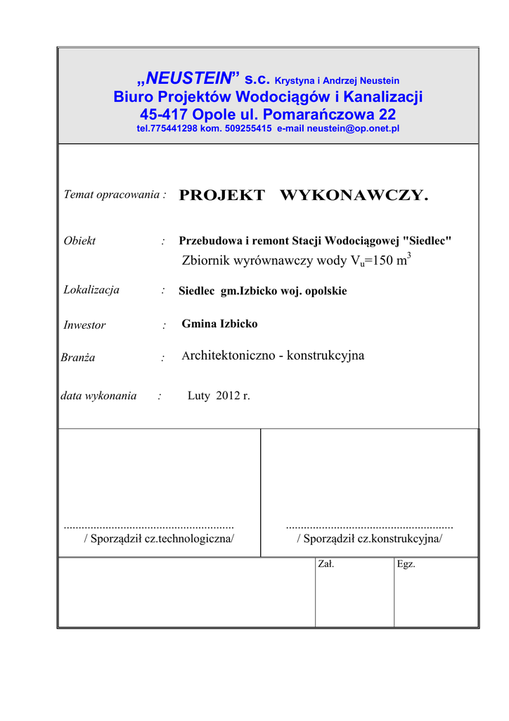 „NEUSTEIN” s.c. Krystyna i Andrzej Neustein Biuro Projektów Wodociągów i Kanalizacji 45-417 Opole ul. Pomarańczowa 22 tel.775441298 kom. 509255415 e-mail [email protected] Temat opracowania : PROJEKT WYKONAWCZY. Obiekt Przebudowa i remont Stacji Wodociągowej "Siedlec" : Zbiornik wyrównawczy wody Vu=150 m3 Lokalizacja : Siedlec gm.Izbicko woj. opolskie Inwestor : Gmina Izbicko Branża : Architektoniczno - konstrukcyjna data wykonania : Luty 2012 r. ......................................................... / Sporządził cz.technologiczna/ ........................................................ / Sporządził cz.konstrukcyjna/ Zał. Egz. Projekt wykonawczy - przebudowa i remont SW "Siedlec" - część konstrukcyjna - zbiornik wyrównawczy 150 m3 -2- Spis zawartości: I Opis techniczny. II. Część rysunkowa. 1B. Zbiornik wody V=150 m3 - rzuty, przekrój, elewacja skala 1:50 , 1:100 2B. Płyta fundamentowa - skala 1:50, 1:20 3B. zbrojenie studzienki nr 1 / nr 2/ - skala 1:20 4B. Zbrojenie ściany - skala 1:50 , 1:20 5B. Płyta stropowa - skala 1:50 , 1:20 6B. Obudowa włazu - skala 1:20 7B. Drabiny - skala 1:50 , 1:20 8B. Balustrada - skala 1:10 „NEUSTEIN‘’ s.c. Biuro Projektów Wodociągów i Kanalizacji 45-417 Opole ul. Pomarańczowa 22 tel. 775441298, kom. 509255415 Projekt wykonawczy - przebudowa i remont SW "Siedlec" - część konstrukcyjna - zbiornik wyrównawczy 150 m3 -3- I. Opis Techniczny. 1. Przedmiot opracowania. Przedmiotem opracowania jest część konstrukcyjna żelbetowoweg zbiornika cylindrycznego o pojemności 150 m3 zlokalizowanego na terenie Stacji Wodociągowej "Siedlec" gm.Izbicko woj. opolskie. 2. Podstawa opracowania. Opracowanie projektu oparto na następujących materiałach wyjściowych: - wytyczne budowlane z projektu technologicznego - zbiorcze zestawienie wyników wiercenia studziennego - plan zagospodarowania terenu 3. Warunki geologiczne posadowienia zbiornika. Zbiornik zaliczono do I kat. geotechnicznej wg. PN-B-02479 – Dokumentowanie geotechniczne. Warunki gruntowe przyjęto na podstawie zbiorczego zestawienia wyników wiercenia studziennego. W miejscu odwiertu studziennego zalegają następujące warstwy gruntów: 0,00 - 0,30 m gleba próchniczna 0,30 – 0,50 m piasek zagęszczony żółty 0,50 – 2,00 m wapień zwietrzały szaro-żółty 2,00 - 20,00 m wapień szaro-żółty Woda gruntowa o zwierciadle ustabilizowanym występuje na głębokości 8,9 m p.p. terenu. 4. Opis konstrukcyjno-budowlany zbiornika. 4.1 Architektura. Projektowany zbiornik składa się z żelbetowego cylindra o średnicy wewnętrznej 7,642 m i wysokości w świetle 3,70 m umieszczonego między kolistymi płytami fundamentu i stropu. Zbiornik usytuowany jest na powierzchni terenu, częściowo obsypany do wys. 1,3 m powyżej poziomu terenu oraz ocieplony. Ściana zbiornika ocieplona jest styropianem klejonym do podłoża a następnie otynkowana tynkiem cienkowarstwowym. Na stropie ocieplenie styropianem chronione jest dylatowaną gładzią cementową. Zaleca się tynk akrylowy w kolorze białym. Wszystkie elementy konstrukcyjne zbiornika są wykonane z betonu monolitycznego a powierzchnia wewnętrzna ściany musi być gładka ponieważ nie przewiduje się żadnej powłoki uszczelniającej. Zbiornik służy do przechowywania wody czystej. Powierzchnia zabudowy 52,0 m2. Kubatura 234,0 m3. „NEUSTEIN‘’ s.c. Biuro Projektów Wodociągów i Kanalizacji 45-417 Opole ul. Pomarańczowa 22 tel. 775441298, kom. 509255415 Projekt wykonawczy - przebudowa i remont SW "Siedlec" - część konstrukcyjna - zbiornik wyrównawczy 150 m3 -4- 4.2 Posadowienie. Poziom dna zbiornika Poziom spodu podłoża betonowego Poziom podsypki żwirowo-piaskowej Poziom terenu otaczającego Poziom obsypania zbiornika ± 0,00 = 218,79 m n.p.m. - 0,80 m - 1,10 m - 0,30 m + 1,00 m Zbiornik posadowiono na głębokości 0,5 m poniżej poziomu terenu otaczającego na warstwie podsypki żwirowo-piaskowej grub. 0,30 m zagęszczonej do ID=0,70. 4.3 Konstrukcja. Płyta fundamentowa , ściana i płyta zostały zaprojektowane z betonu monolitycznego kl. C20/25 lub C25/30 zbrojonego stalą kl. AIIIN gat. BSt500S. Beton użyty do konstrukcji powinien być szczelny o stopniu wodoszczelności W-8, W-10 i wskaźnikiem w/c max 0,45-0,50 , wykonany z kruszywa otoczakowego lub łamanego, mało nasiąkliwego o wielkości ziaren do 16 mm. Przejścia szczelne rur usytuowane w ścianach studzienek w dnie, wykonane są z rur PE owiniętych taśmą WATERSTOP RX 101. Połączenie ściany z dnem powinno być uszczelnione profilem CETFLEX ACF125 firmy ADAE. W płycie stropowej usytuowany jest właz 800*800 a na jego krawędzi wymurowany gzyms z cegły klinkierowej spoinowany. 4.4 Właz. Właz 800*800 wykonany jest ze stali nierdzewnej oraz ocieplony. Przyjęto właz f-my SORMET z Zamościa lub równoważny. 4.5 Izolacje. Izolacja przeciwwilgociowa dna składa się z 2 warstw papy na lepiku ułożonych na podłożu betonowym. Pokrycie płyty stropowej dwiema warstwami papy zgrzewalnej (podkładowa i nawierzchniowa) z wywinięciem na gzyms klinkierowy z zaokrągleniami. Izolacja termiczna ściany i płyty stropodachu stanowi styropian FS-15 i FS-20 klejony do podłoża (bez kołkowania). Na styropianie ułożonym na ścianie przewiduje się tynk cienkowarstwowy na siatce z włókna szklanego wtopionej w masie klejowej. Na styropianie poniżej poziomu obsypania należy wykonać tynk cementowy. 4.6 Roboty ślusarskie. Balustradę zewnętrzną i drabiny wykonać ze stali nierdzewnwj. Włazy do zbiornika ze stali nierdzewnej, ocieplone, zamykane. Drabiny zamocować do ściany zbiornika za pomocą śrub segmentowych, rozporowych, krótkich M 12 - SŁR. 4.7 Roboty chodnikowe. Wokół zbiornika na koronie obsypki należy wykonać opaskę z kostki betonowej gr. 6 cm na piasku szer. 80 cm. W osi drabiny włazowej na skarpie należy wykonać schody terenowe z betonu. „NEUSTEIN‘’ s.c. Biuro Projektów Wodociągów i Kanalizacj