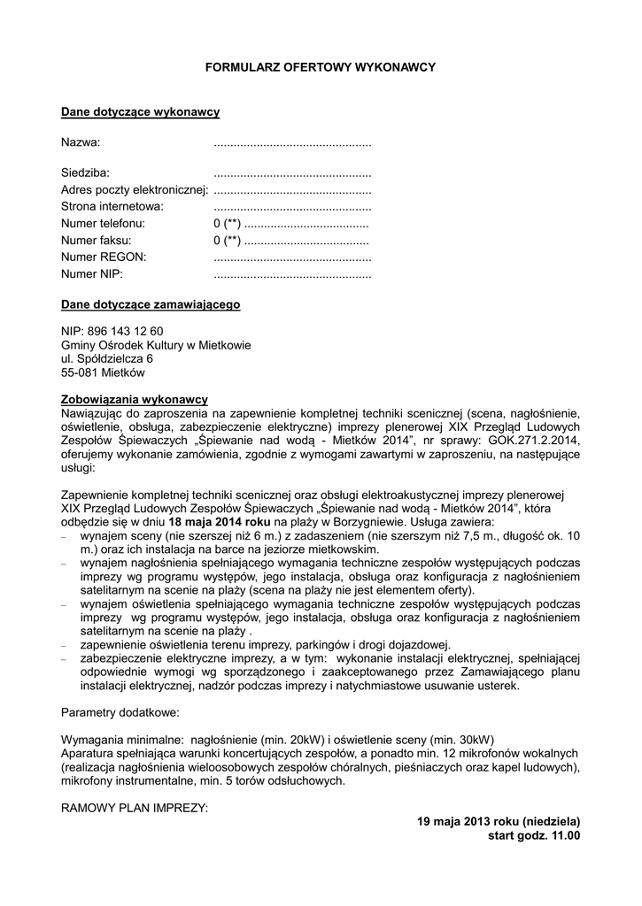 FORMULARZ OFERTOWY WYKONAWCY Dane dotyczące wykonawcy Nazwa: ................................................ Siedziba: Adres poczty elektronicznej: Strona internetowa: Numer telefonu: Numer faksu: Numer REGON: Numer NIP: ................................................ ................................................ ................................................ 0 (**) ...................................... 0 (**) ...................................... ................................................ ................................................ Dane dotyczące zamawiającego NIP: 896 143 12 60 Gminy Ośrodek Kultury w Mietkowie ul. Spółdzielcza 6 55-081 Mietków Zobowiązania wykonawcy Nawiązując do zaproszenia na zapewnienie kompletnej techniki scenicznej (scena, nagłośnienie, oświetlenie, obsługa, zabezpieczenie elektryczne) imprezy plenerowej XIX Przegląd Ludowych Zespołów Śpiewaczych „Śpiewanie nad wodą - Mietków 2014”, nr sprawy: GOK.271.2.2014, oferujemy wykonanie zamówienia, zgodnie z wymogami zawartymi w zaproszeniu, na następujące usługi: Zapewnienie kompletnej techniki scenicznej oraz obsługi elektroakustycznej imprezy plenerowej XIX Przegląd Ludowych Zespołów Śpiewaczych „Śpiewanie nad wodą - Mietków 2014”, która odbędzie się w dniu 18 maja 2014 roku na plaży w Borzygniewie. Usługa zawiera: – wynajem sceny (nie szerszej niż 6 m.) z zadaszeniem (nie szerszym niż 7,5 m., długość ok. 10 m.) oraz ich instalacja na barce na jeziorze mietkowskim. – wynajem nagłośnienia spełniającego wymagania techniczne zespołów występujących podczas imprezy wg programu występów, jego instalacja, obsługa oraz konfiguracja z nagłośnieniem satelitarnym na scenie na plaży (scena na plaży nie jest elementem oferty). – wynajem oświetlenia spełniającego wymagania techniczne zespołów występujących podczas imprezy wg programu występów, jego instalacja, obsługa oraz konfiguracja z nagłośnieniem satelitarnym na scenie na plaży . – zapewnienie oświetlenia terenu imprezy, parkingów i drogi dojazdowej. – zabezpieczenie elektryczne imprezy, a w tym: wykonanie instalacji elektrycznej, spełniającej odpowiednie wymogi wg sporządzonego i zaakceptowanego przez Zamawiającego planu instalacji elektrycznej, nadzór podczas imprezy i natychmiastowe usuwanie usterek. Parametry dodatkowe: Wymagania minimalne: nagłośnienie (min. 20kW) i oświetlenie sceny (min. 30kW) Aparatura spełniająca warunki koncertujących zespołów, a ponadto min. 12 mikrofonów wokalnych (realizacja nagłośnienia wieloosobowych zespołów chóralnych, pieśniaczych oraz kapel ludowych), mikrofony instrumentalne, min. 5 torów odsłuchowych. RAMOWY PLAN IMPREZY: 19 maja 2013 roku (niedziela) start godz. 11.00 SCENA godz. 11.00- 22.00 – XIX Przegląd Ludowych Zespołów Śpiewaczych “Śpiewanie nad wodą – Mietków 2014” - prezentacje. PLAŻA i MOLO godz. 14.00- 15.00 – Próba bicia rekordu Guinessa w śpiewaniu “Wiła wianki...” koniec 22.30 Proponowane ceny usług: – wynajem sceny z zadaszeniem i jej instalacja na barce na jeziorze mietkowskim...................... zł brutto. – wynajem nagłośnienia spełniającego wymagania techniczne zespołów występujących wg programu występów, jego instalacja i obsługa..........................zł brutto. – wynajem oświetlenia spełniającego wymagania techniczne zespołów występujących wg programu występów, jego instalacja i obsługa oraz zapewnienie oświetlenia terenu imprezy, parkingów i drogi dojazdowej...............................zł brutto. Razem.......................zł brutto Oświadczam, że : Wykonam zamówienie we wskazanym terminie oraz pozostawię teren po świadczeniu usług w czystości. Termin płatności:.......... dni Osoby do kontaktów z Zamawiającym Osoba do kontaktów z Zamawiającym odpowiedzialna za wykonanie zobowiązań umowy: …………………………………………………………. tel. kontaktowy, faks: …………………… Dokumenty Na potwierdzenie spełnienia wymagań do oferty załączam zdjęcia proponowanej sceny i zadaszenia, wykaz urządzeń i sprzętu, referencje oraz inne dokumenty: .......... .......... .......... .......... .......... .......... .......... .......... .......... .......... .......... .......... .......... .......... .......... .......... .......... .......... .......... .......... .......... .......... .......... .......... .......... .......... .......... .......... .......... .......... .......... .......... .......... .......... .......... .......... .......... .......... .......... .......... .......... .......... .......... .......... .......... _____________________________ podpisy osób uprawnionych do reprezentowania wykonawcy